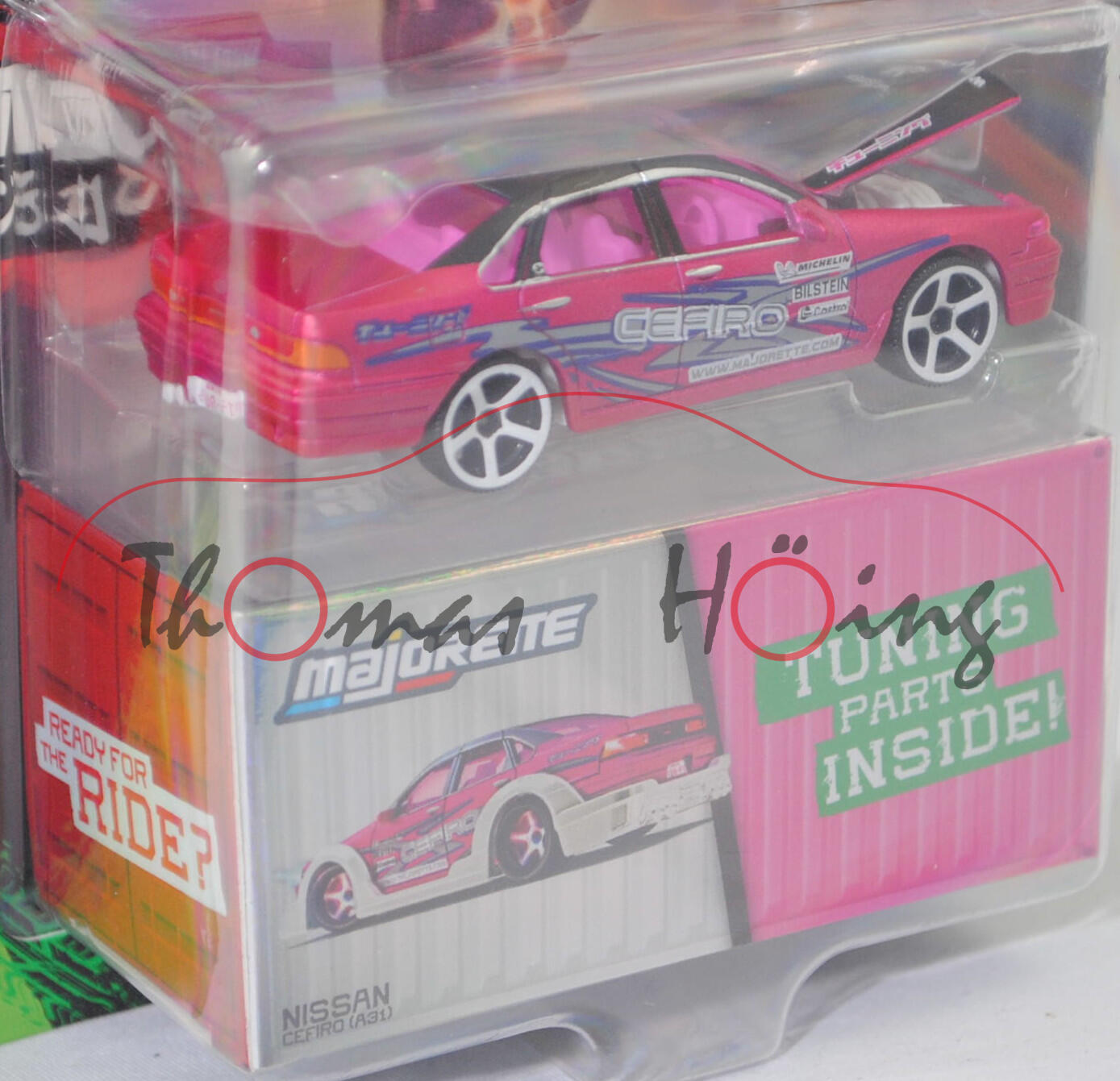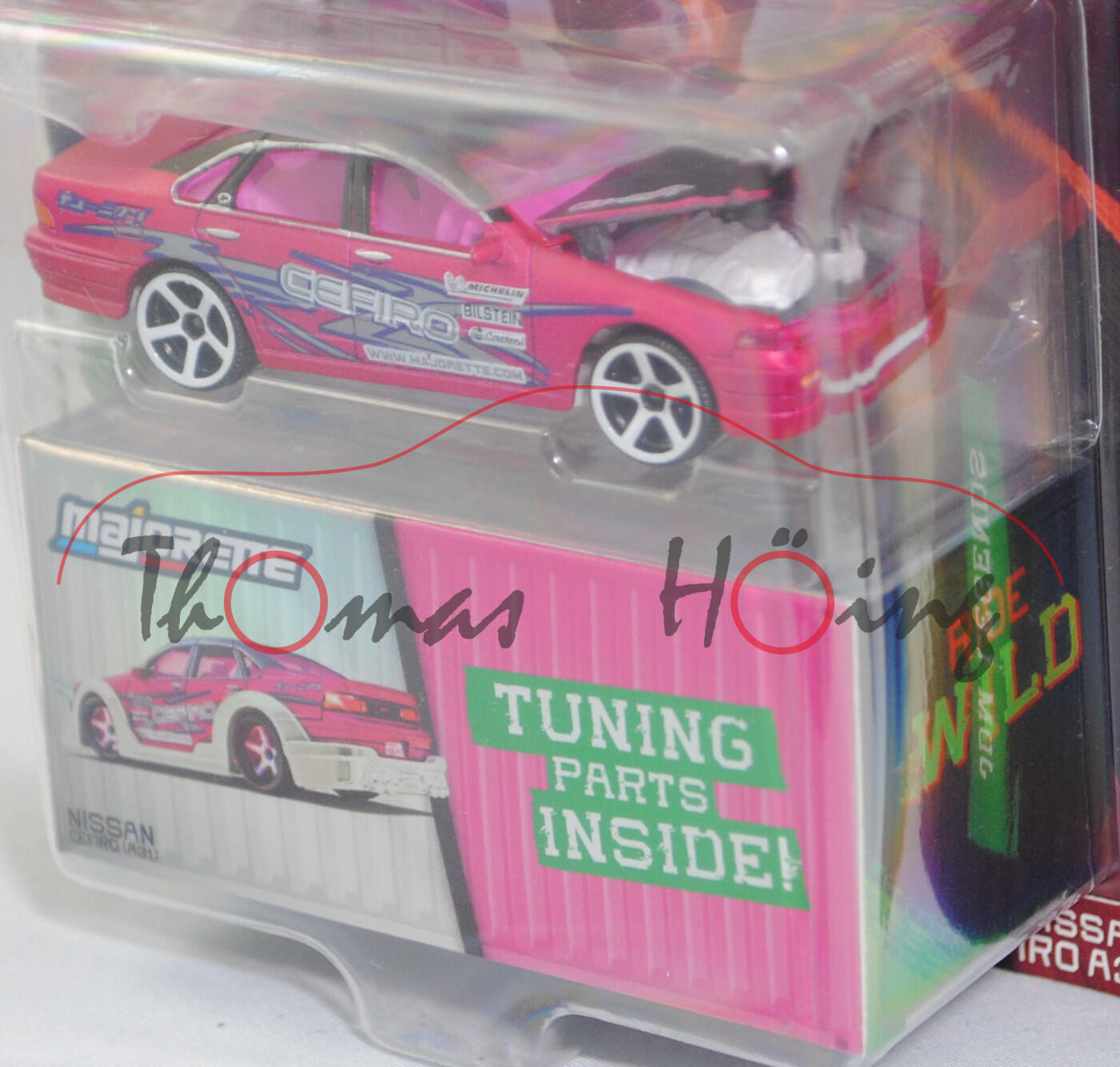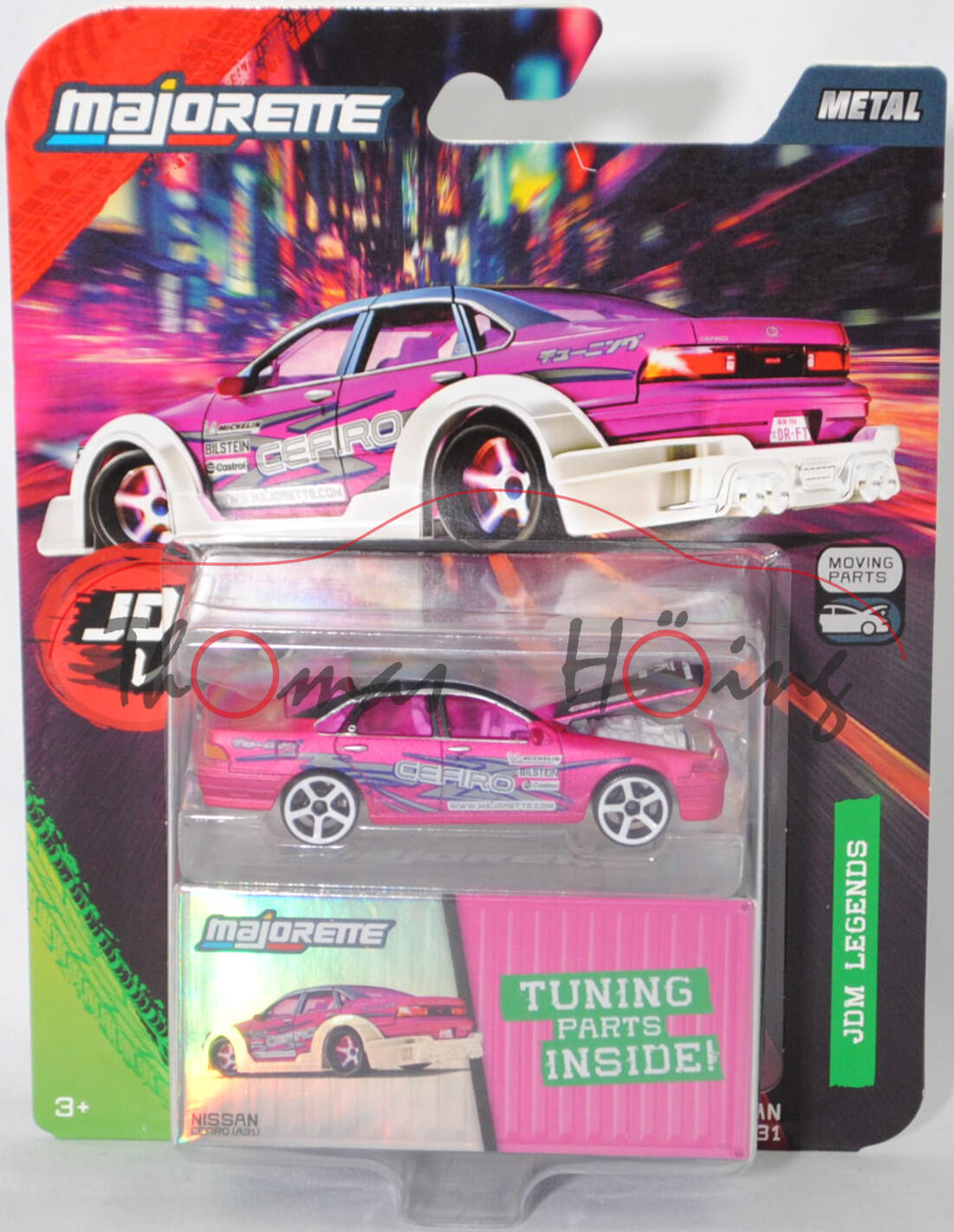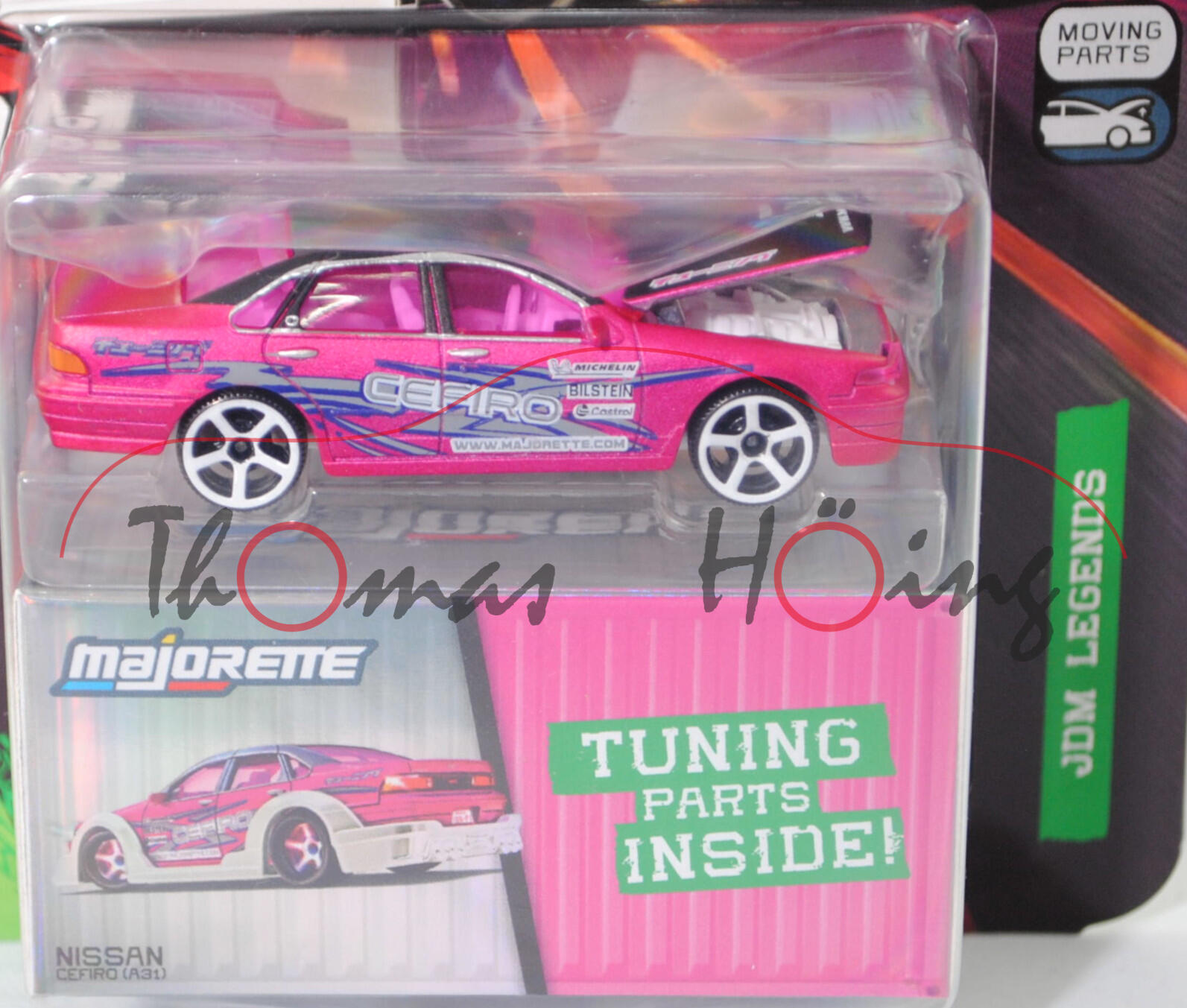 NISSAN Cefiro 2.5 A31 (1. Generation, Baureihe Cefiro, interne Bezeichnung ECA31 für diese Motorisierung, viertürige Stufenhecklimousine mit 5 Sitzplätzen, Rechtslenker (RHD = Right Hand Drive), Hinterradantrieb, Motor: Nissan Typ RB25DE wassergekühlter Sechszylinder-Reihen-Viertakt-Otto mit elektronische Einspritzung und zwei obenliegende Nockenwellen (DOHC = Double Overhead Camshaft) sowie 4 Ventile pro Zylinder und 2498 cm³ sowie 180 PS, Radstand 2670 mm, Länge 4690 mm, Modell 1988-1994) (Nr. 233A), Karosserie matt dunkel-erikaviolettmetallic, Dach einschschließlich Dachholme und Motorhaube schwarz, innen reinweiß, Sitze reinweiß, Lenkrad reinweiß (RHD = Right Hand Drive, Rechtslenker), Druck CEFIRO / WWW.MAJORETTE.COM in staubgrau auf reinweiß und Michelin-Männchen sowie MICHELIN / BILSTEIN / Castrol in schwarz auf reinweiß und Streifen in saphirblau/staubgrau auf den Seiten, Druck BILSTEIN / Michelin-Männchen / MICHELIN / WWW.MAJORETTE.COM in reinweiß auf der Motrorhaube, Motorhaube zu öffnen, Motor reinweiß,Verglasung bordauxviolett, 5-Arm-Felgen in reinweiß (Nissan Felgen Größe 6 J x 15 ET 40 mit Lochkreis 4 x 114,3 und Reifen 195/65 R 15), mit Sammelschachtel, Beilage: Bodykit und Tuning-Zubehör, majorette, 1:58, Blister (JDM Legends (JDM = Japanese Domestic Market bzw. Japanischer Inlandsmarkt) DELUXE CARS) (EAN 3467452077351)