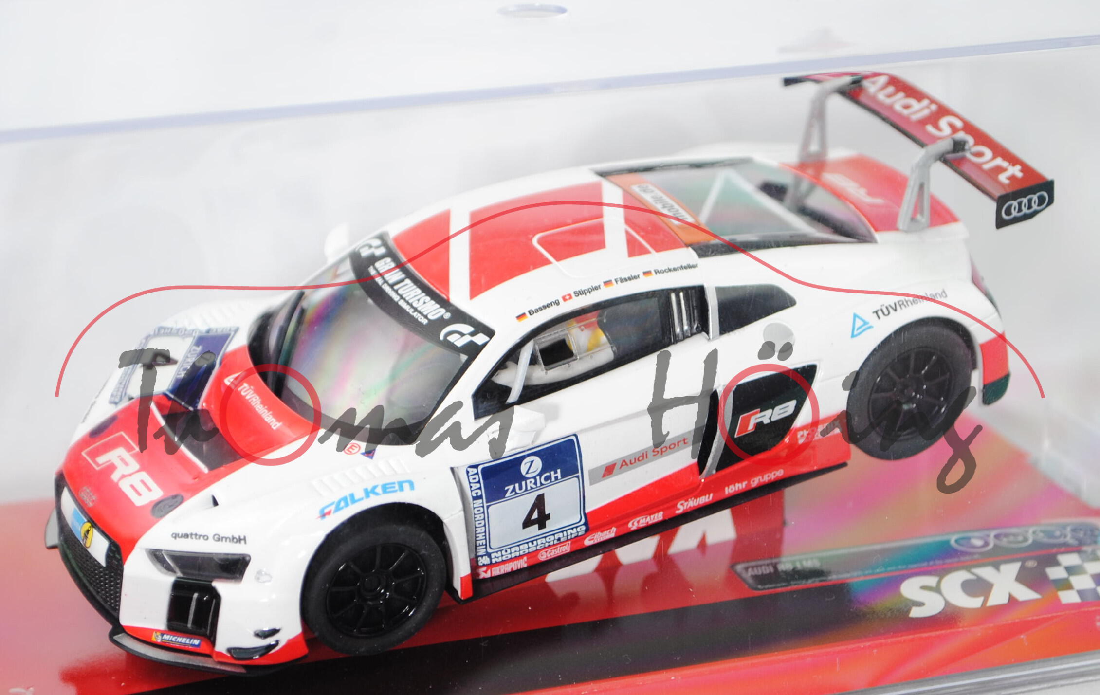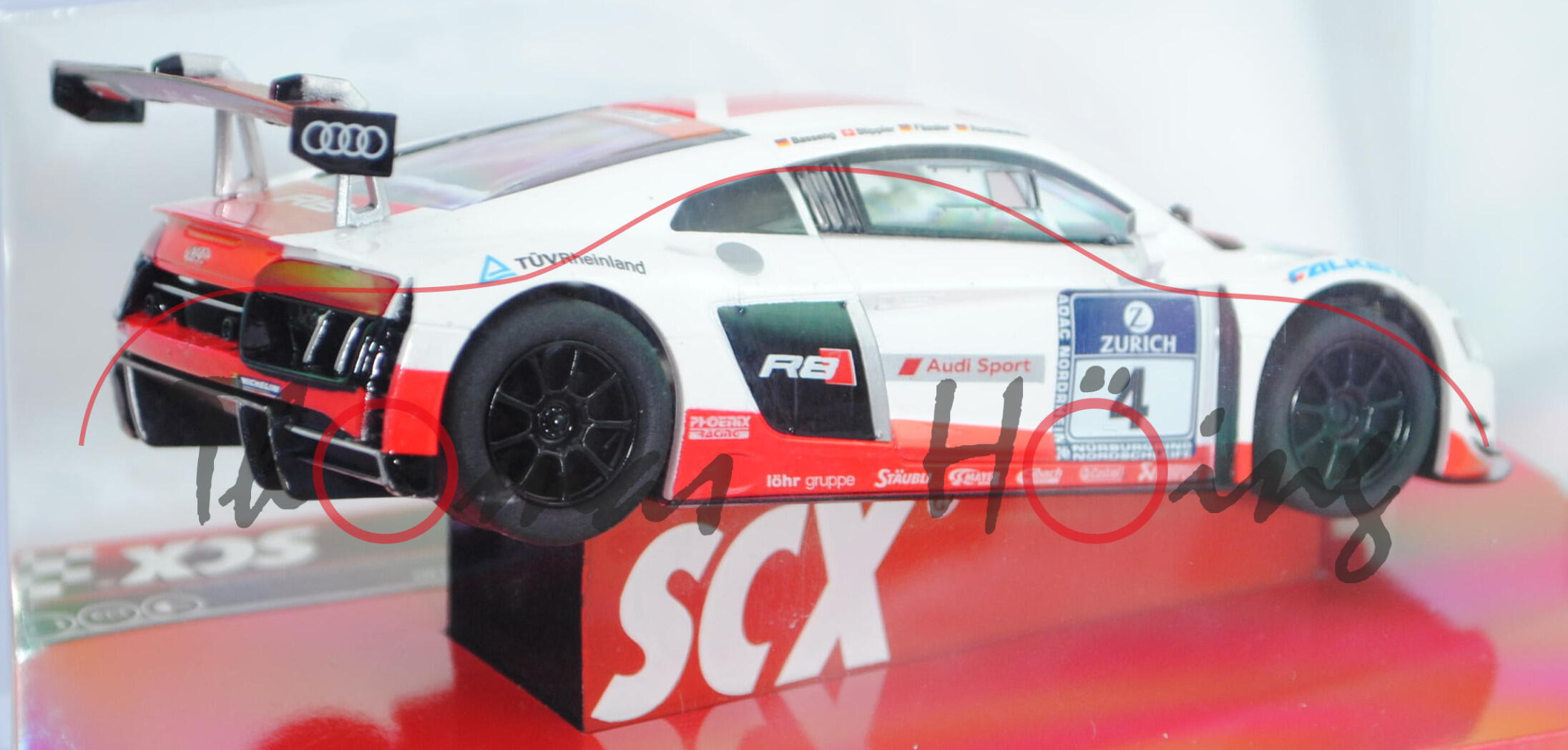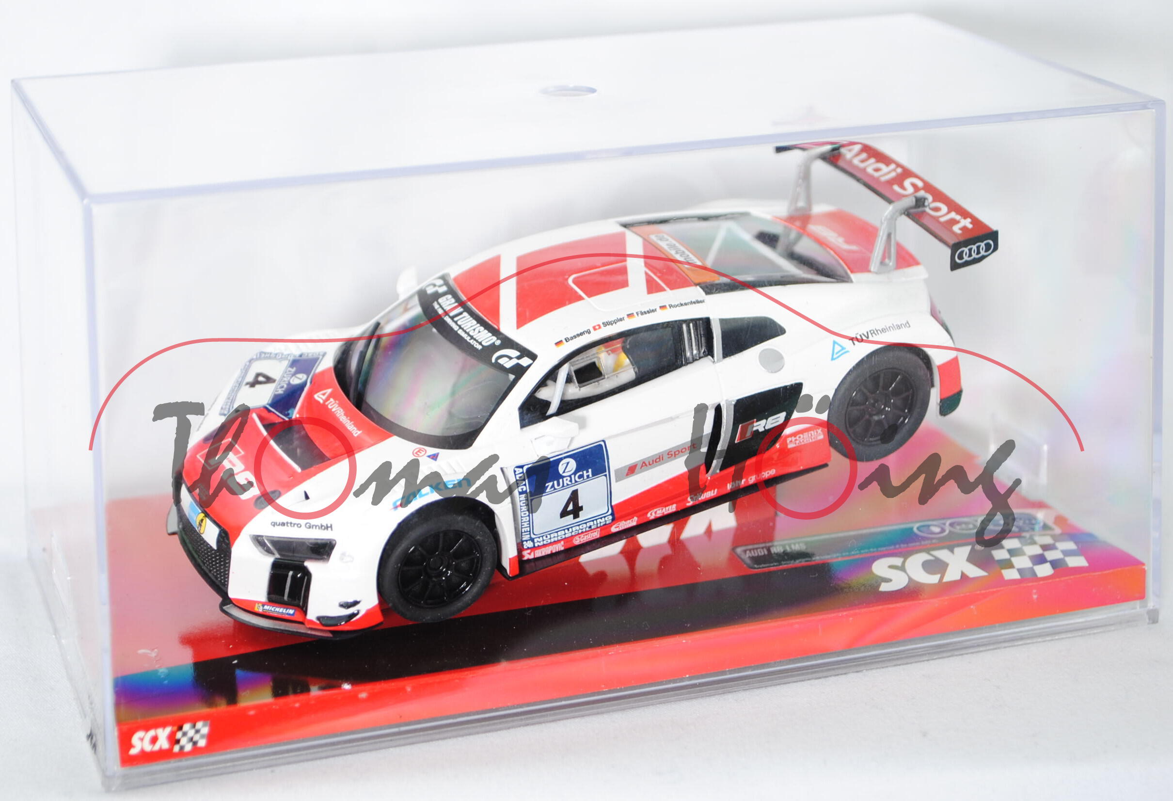 Audi R8 LMS (2016), reinweiß/verkehrsrot, 24h Nürburgring 2015 (16.-17.05.2015), Nr. 4 (Ausfall), Fahrer: Marc Basseng / Frank Stippler / Marcel Fässler / Mike Rockenfeller, Team: Audi Sport Team Phoenix, SCX, 1:32, PC-Box (EAN 8410788902403)
