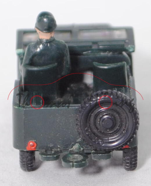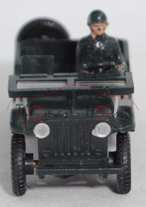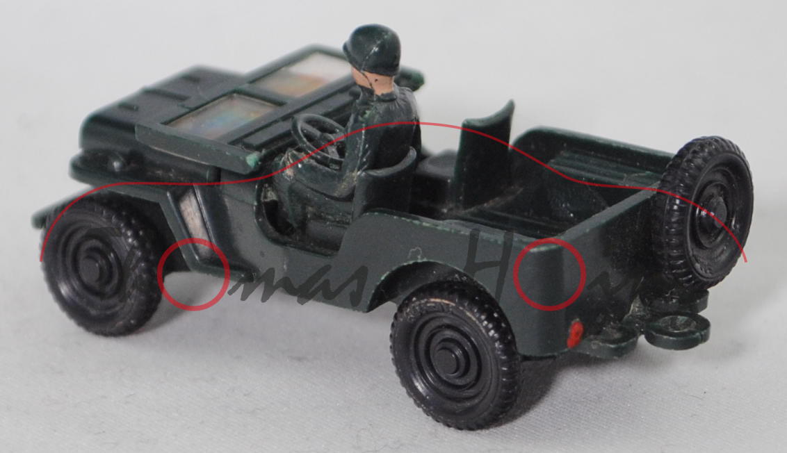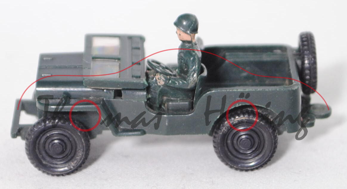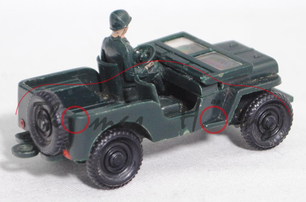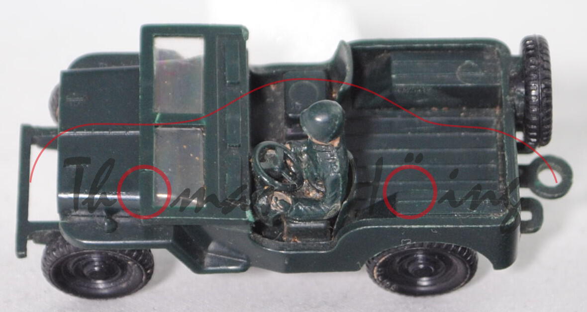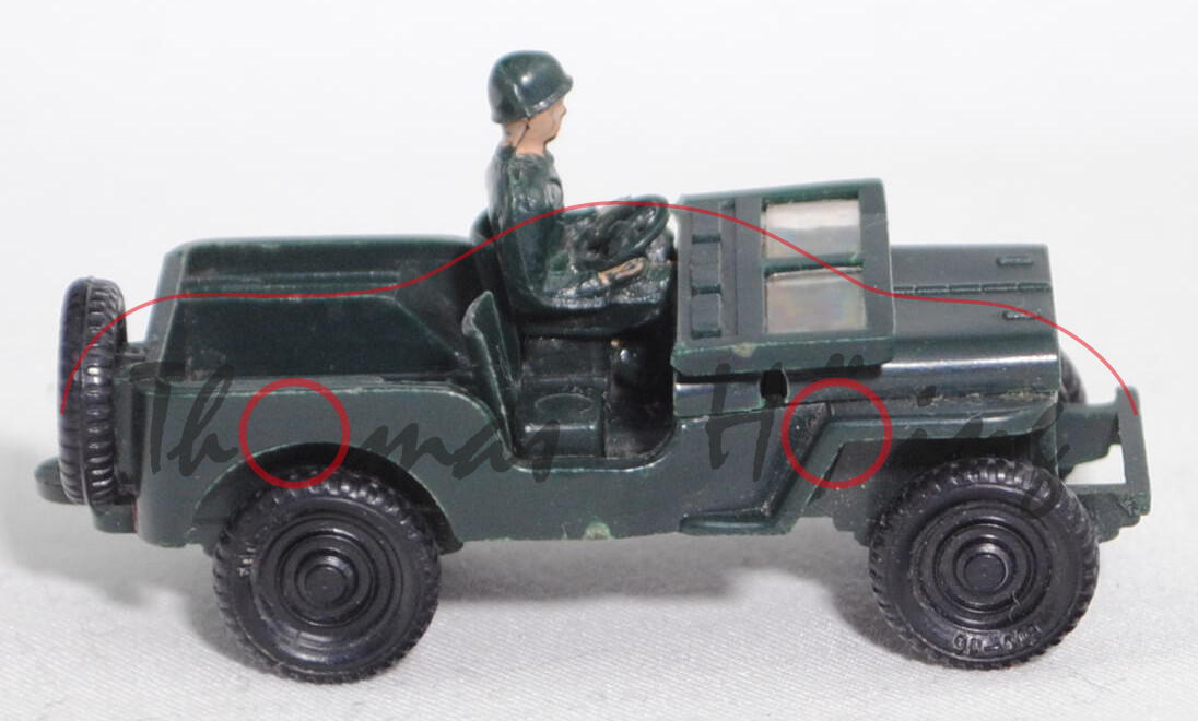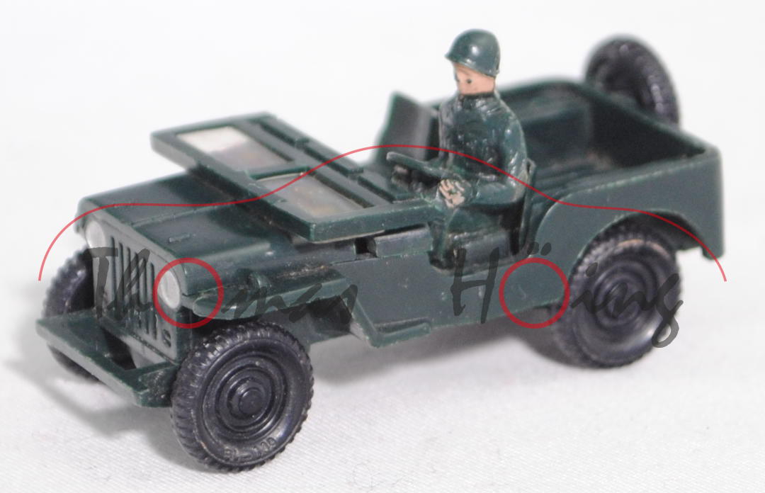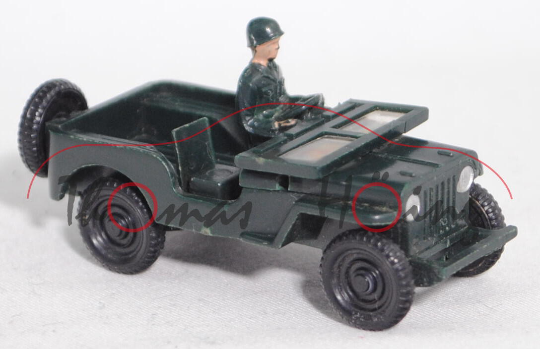 00001 Willys Jeep M38 / MC (Hersteller: Willys-Overland Motors, Armeebezeichnung ¼-ton 4 x 4 utility truck M38, Verglasung der Windschutzscheibe einteilig (Scheibenrahmen mit Mittelsteg von Siku hergestellt), Scheibenrahmen mit 3 Lüftungsklappen nicht klappbar (von Siku klappbar), zwei Schäkel vorne und hinten, Kühlergrill mit 7 Lüftungsschlitzen (von Siku mit 6 Lüftungsschlitzen hergestellt), Motor: Willys Typ L134 (Spitzname Willys Go Devil) Vierzylinder-Reihen-Viertakt-Otto mit 2199 cm³ und 60 PS, Radstand 2032 mm, Länge 3378 mm, Modell 1949-1952), flaschengrün, innen flaschengrün, Lenkrad flaschengrün, beschädigte Frontscheibe auf Motorhaube geklebt, mit Soldat als Fahrer in flaschengrüner Bekleidung und flaschengrünem Helm, Chassis flaschengrün, Stoßstangenecke vorne rechts weg, Abschleppöse mit Riss, RV 92 schwarz, Siku-Verkehrsmodelle aus Plastik 1:60, ca. 1:60 (EAN 4006874000920)