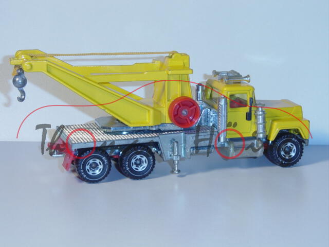 Mack Conventional R612 (Modell 1966-1990) Abschleppwagen, kadmiumgelb, Verglasung gelb, LKW10, 1 Horn + 2 Auspuffenden weg, mit Farbabplatzern