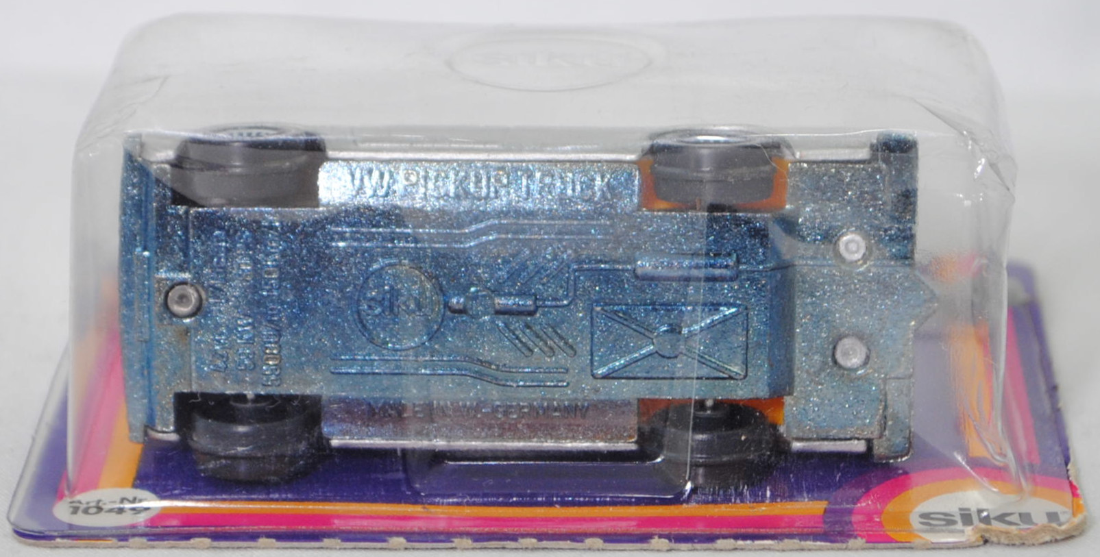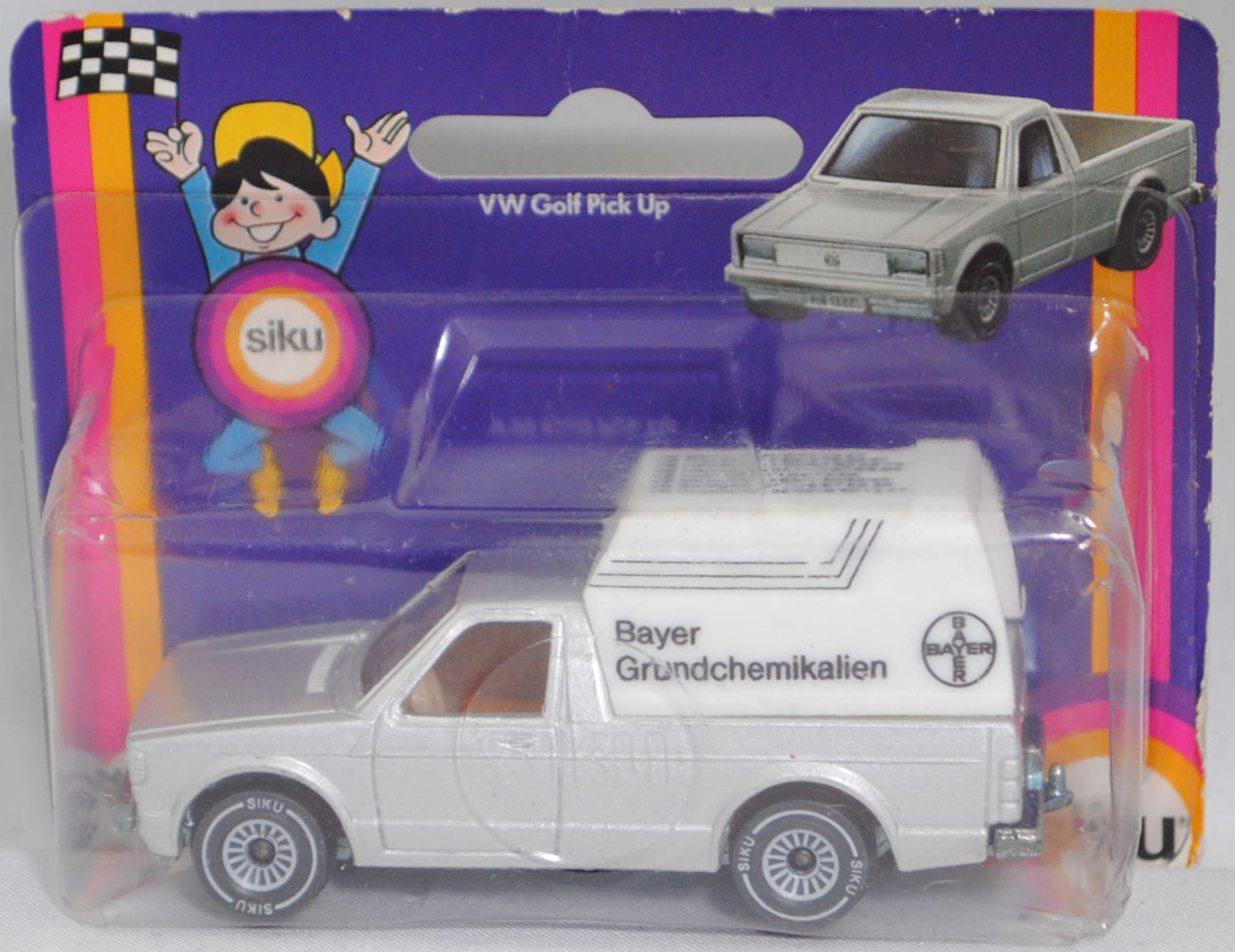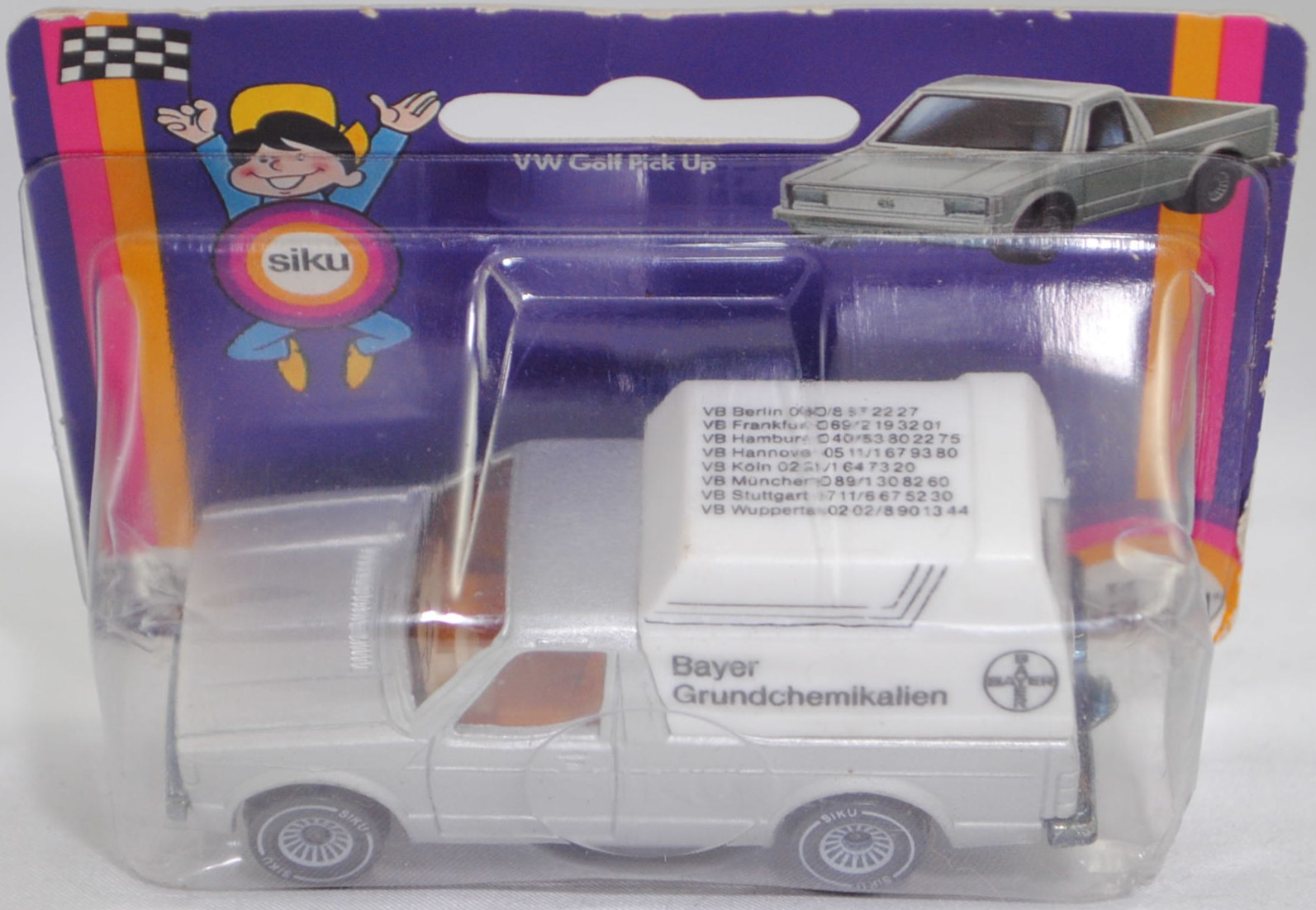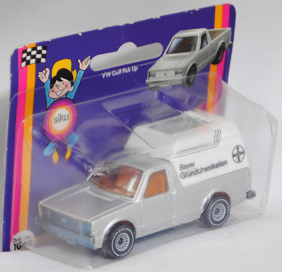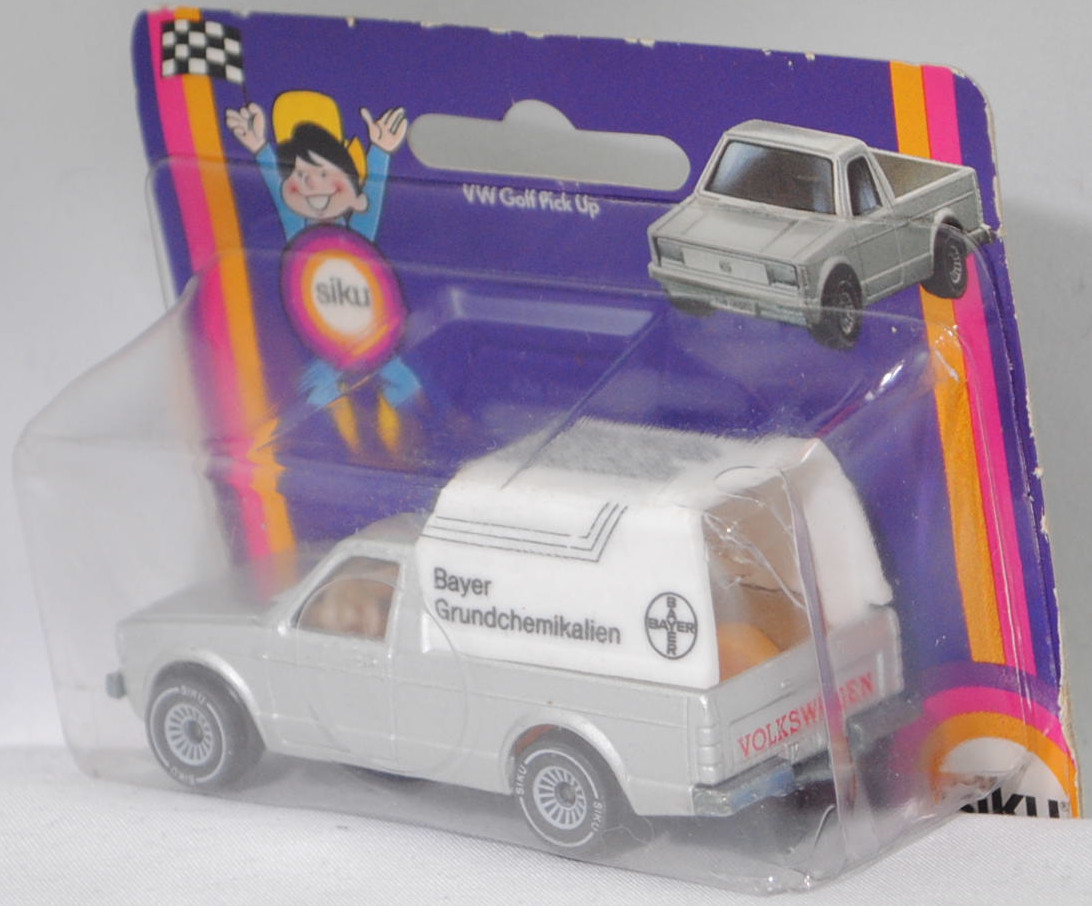 VW Pickup Truck LX (vgl. VW Caddy I) (1. Generation, Baureihe Pickup Truck / Caddy, interne Baureihenbezeichnung 14D, Typ 147 (LHD = left-hand drive bzw. Linkslenker), zweitüriger Pritschenwagen mit 2 Sitzplätzen, Ausstattungslinie LX: Halogenscheinwerfer als Rechteckscheinwerfer + Blinker vorne neben den Scheinwerfern + verchromte Stahlstoßfänger mit Kastenprofil vorne + verchromter geteilter Stahlstoßfänger mit Kastenprofil hinten mit Trittstufe mittig + Stoßfänger vorne und hinten mit Aufprallleisten + Armaturenbrettfarbe farblich abgestimmt + Instrumententafel mit zwei runden Instrumenten für Geschwindigkeitsanzeige einschl. Kilometer- und Tageskilometerzähler sowie Quarzuhr einschl. Wassertemperaturanzeige und Tankanzeige + klapp- und schwenkbare Sonnenblenden mit Make-up-Spiegel auf der Beifahrerseite + abblendbarer Sicherheitsinnenspiegel + AM/FM-Radio mit Druckknopf + anatomisch geformte Schalensitze mit Stoffsitzbezug in Tweed-Struktur-Streifen + Sitzscharnierabdeckung farblich abgestimmt + Handschuhfach abschließbar und beleuchtet + getönte Scheiben + Ausstellfenster + Scheibenwischersteuerung mit Intervallschaltung + 2 Kleiderhaken + strapezierfähiger Nylon-Teppichboden + vollsynchronisiertes 3+E-Schaltgetriebe mit Hochschaltanzeige + Katalysator + AGR-System (Abgasrückführung) + Stahl-Lochscheibenräder Größe 5 J x 13 mit Radial-Stahlgürtelreifen P165/75 R 13, Hersteller: Volkswagen Westmoreland Assembly 1001 Technology Drive 15666 Westmoreland in Pennsylvania USA, vollsynchronisiertes Viergang-Schaltgetriebe als Mittelschaltung, Frontantrieb, Motor: Audi Typ VW EA827 wassergekühlter Vierzylinder-Reihen-Viertakt-Otto mit kontinuierlicher Einspritzung (CIS = Continuous Injection System) und eine obenliegende Nockenwelle (SOHC = Single Overhead Camshaft) sowie 2 Ventile pro Zylinder und 1715 cm³ sowie 78 PS, Motorkennbuchstabe WT, Radstand 2625 mm, Länge 4346 mm, Modell 1981-1983) mit Kastenaufbau, silbergraumetallic (vgl. diamantsilbermetallic beim Original, Verkaufskennzeichen Z4, Lacknummer L97A), innen chromgelb, Sitze chromgelb, Lenkrad reinweiß, Druck Bayer / Grundchemikalien und BAYER-Emblem in schwarz auf den Seiten des Kastenaufbaues, Druck VB Berlin 030/8872227 / VB Frankfurt 069/2193201 / VB Hamburg 040/63802275 / VB Hannover 0511/1679380 / VB Köln 0221/1647320 / VB München 089/1308260 / VB Stuttgart 0711/6675230 / VB Wuppertal 0202/8901344 in schwarz von links aus lesbar auf dem Kastenaufbau, Druck VOLKSWAGEN in signalrot auf der Heckklappe, Kastenaufbau reinweiß, ohne Loch in der Bodenplatte (2. Ausführung), Chassis chrom mit Anhängerkupplung (AHK), Bpr. ohne CE-Zeichen, B4 (VW gestylte Stahl-Lochscheibenräder mit Tiefbettfelge im 8-Loch-Design Größe 5 J x 13 H2 ET 45 mit Lochkreis 4 x 100 (Teilenummer 321 601 025 K, Farbcode chromfarben) und Radzierkappen (Teilenummer 321 601 151 B, verchromt) sowie Radial-Stahlgürtelreifen P165/75 R 13), P18 (Vitrinenmodell, Schachtel mit Lagerspuren) (EAN 4006874010493)