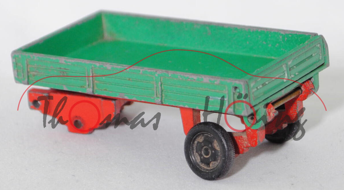 00000 2-Achs-Kippanhänger für LKW und Traktor (Typ 2-achsiger Drehschemelanhänger mit Kippbrücke als Hinterkipper, Radstand 2650 mm, Länge Kippbrücke 4085 mm, Baujahr 1963), Kippbrücke verkehrsgrün, Heckklappe (Pendelklappe) ohne zwei schräge Streben bei der unteren Verbretterung, Drehschemel mit Deichsel und Fahrgestell verkehrsrot, Abschlepploch in der Deichsel mit Ø 2 mm, mit offenem Loch oben im Fahrgestell im Bereich der Hohlniete, Drehschemel am Fahrgestell mit Unterlegscheibe zwischen Drehschemel und Hohlniete gehalten, Fahrgestell mit Blattfedern und X-Verstrebung mittig in verkehrsrot, X-Verstrebung im Fahrgestell hinten ohne Verstärkung, Bpr. Siku V225 hinten auf dem Drehschemel und mittig unter der Kippbrücke, Germ, LKW1, SIKU-SUPER-ZINKGUSS 1:60 (V-SERIE), ca. 1:60, c (Deichsel und Vorderachse weg, Unterlegscheibe bei der Hohlniete nicht original, Achse hinten krumm, Lackfehler) (EAN 4006874002252)