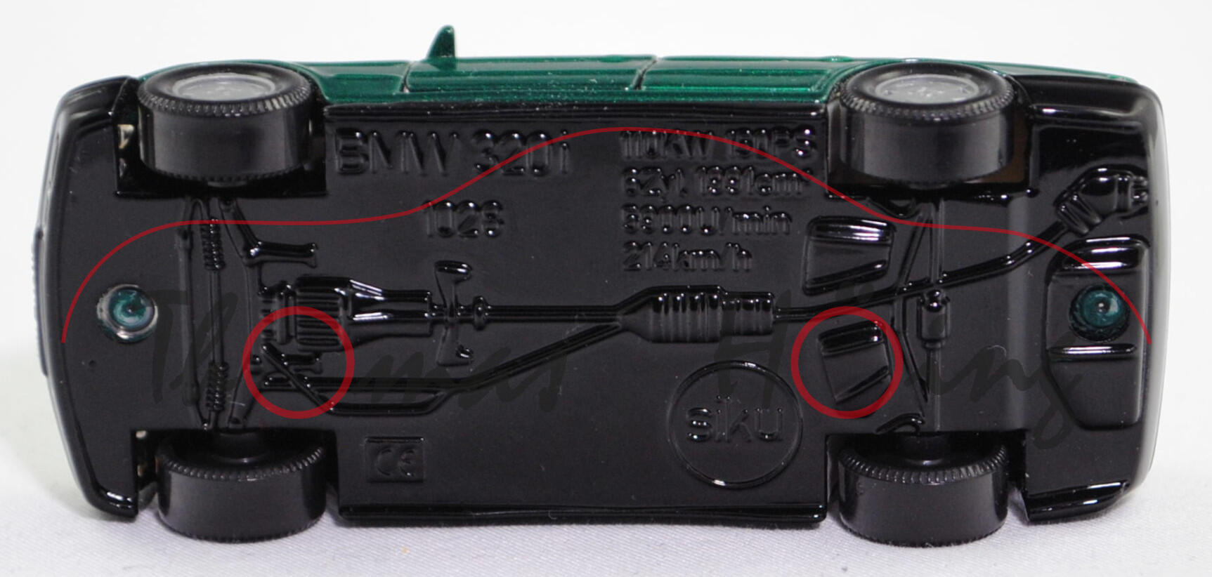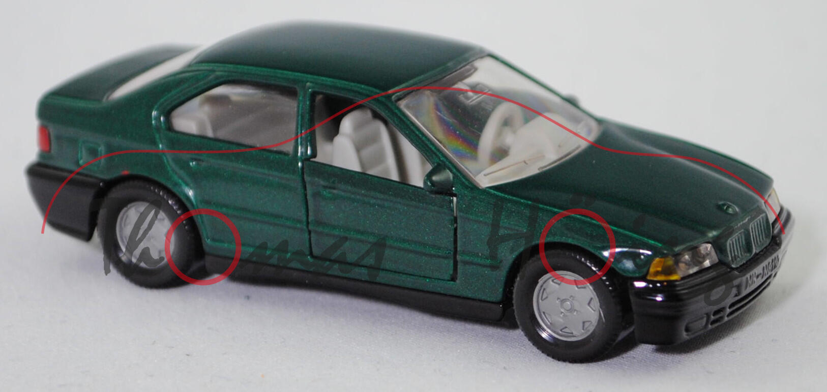 00000 BMW 325i Limousine (3. Generatiom 3er-Reihe, Baureihe 3er-Reihe, interne Baureihenbezeichnung E36, viertürige Stufenheck-Limousine mit 5 Sitzplätzen, Vorfacelift (bei BMW Vor-LCI = vor Lifecycle Impulse genannt), Frontscheinwerfer und Außenspiegel ohne Noppen an der Oberseite, Blinker vorne und hinten hinter gelber Verglasung, ohne Seitenblinker im vorderen Kotflügel, Ausstattungslinie 325i Limousine: Nebelscheinwerfer + Anti-Blockier-System (ABS) + Zentralverriegelung mit Diebstahlsicherung und Crash-Sensor + drehzahlabhängig geregelte Servolenkung + Drehzahlmesser mit Energy-Control + Sechszylinder Motor mit 2494 cm³ und 192 PS + Auspuffanlage mit 2 Katalysatorsträngen in paralleler Monolith-Anordnung und ovale Doppel-Endrohre + Leichtmetall-Gußräder Styling Typ Styling 6, 5-Gang-Schaltgetriebe, Hinterradantrieb, Motor: BMW Typ M50B25 wassergekühlter Sechszylinder-Reihen-Viertakt-Otto mit sequentielle Mehrpunkt-Saugrohreinspritzung und zwei obenliegende Nockenwelle (DOHC = Double Overhead Camshaft) sowie 4 Ventile pro Zylinder und 2494 cm³ sowie 192 PS, Radstand 2700 mm, Länge 4433 mm, Modell 1990-1992), moosgrünmetallic (vgl. lagunengrün metallic beim Original, Farbcode 266), innen lichtgrau (vgl. silbergrau beim Original), Sitze lichtgrau, Lenkrad lichtgrau, separat eingesetzte transparente klare Frontscheinwerfer, separat eingesetzte gelbe Blinker vorne, Heckleuchten rot lackiert, Chassis schwarz, Bpr. BMW 320i incl. einiger technischer Daten, mit CE-Zeichen, B6 (BMW Leichtmetall-Gußräder Styling Typ Styling 6 im 15-Loch-Design Größe 7 J x 15 ET 47 mit Lochkreis 5 x 120 (Teilenummer 36 11 1 180 447) und Nabenabdeckung mit Chromrand (Teilenummer 36 13 6 783 536) sowie Reifen 205/60 R 15 91V), SIKU SUPER, ca. 1:55, m (Vitrinenmodell) (EAN 4006874010288)