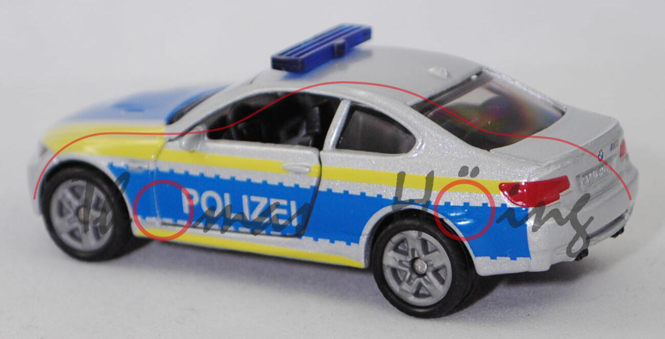 00000 BMW M3 Coupé (4. Generation M3, Baureihe M3 Coupé, interne Baureihenbezeichnung E92, zweitüriges Coupé mit 4 Sitzplätzen, Facelift 2010 (bei BMW LCI = Lifecycle Impulse genannt), Stoßfänger vorne um 29 mm verlängert, Verbreiterung des Seitenschwellers im unteren Bereich, Blinker hinten oben unter rotem Glas angeordnet, kleiner schmale Rückfahrscheinwerfer unten angeordnet, Ausstattungslinie M3 Coupé: Leichtbaudach aus Carbon (CFK) + Polsterung Stoff-/Lederkombination Speed mit geprägtem M Emblem in den Kopfstützen vorne + Fondsitzlehne umklappbar + Komforteinstieg zu den Fondsitzen durch Easy-Entry-Funktion für Fahrer- und Beifahrersitz + Gurtbringer vorne elektrisch + Graukeil-Frontscheibe, 6-Gang-Schaltgetriebe, Hinterradantrieb, Motor BMW Typ S65B40 wassergekühlter Achtzylinder-V-Viertakt-Otto mit Multi-Point-Einspritzung und zwei obenliegende Nockenwellen (DOHC = Double Overhead Camshaft) je Zylinderbank sowie 4 Ventile pro Zylinder und 3999 cm³ sowie 420 PS, Radstand 2761 mm, Länge 4615 mm, Modell 2010-2013) Polizei, weißaluminiummetallic, innen schwarzgrau, Sitze schwarzgrau, Lenkrad schwarzgrau, Druck Streifen in schwefelgelb/verkehrsblau auf den Seiten wobei POLIZEI und Reflektorstreifen in Wagenfarbe durchschimmern, Druck Motorhaube mittig in verkehrsblau wobei POLIZEI in Wagenfarbe durchschimmert, zusätzlicher Druck von schwefelgelben Steifen außen auf der Motorhaube, flache Blaulichtleiste auf dem Dach, integrierte Frontscheinwerfer silber bedruckt, integrierte Heckleuchten rot bedruckt, Druck BMW-Logo in reinweiß/schwarz/ultramarinblau auf der Motorhaube, Druck BMW-Logo in reinweiß/schwarz/ultramarinblau und M3 in silber auf dem Kofferraumdeckel, Heckstoßstange geschlossen, B47 geschlossen silbergrau (BMW Leichtmetallräder Typ Doppelspeiche 219 M vorne Größe 8,5 J x 18 ET 29 mit Lochkreis 5 x 120 (Teilenummer 3610 2284050, Farbcode reflexsilber) und Nabendeckel / Radzierkappe mit blau-weißem BMW-Logo und Chromrand (Ø 68 mm, Teilenummer 3613 6783536) sowie Mischbereifung 245/40 ZR 18 93Y bzw. hinten Größe 9,5 J x 18 ET 23 mit Lochkreis 5 x 120 (Teilenummer 3610 2284051, Farbcode reflexsilber) und Nabendeckel / Radzierkappe mit blau-weißem BMW-Logo und Chromrand (Ø 68 mm, Teilenummer 3613 6783536) sowie Mischbereifung 265/40 ZR 18 97Y), SIKU SUPER, ca. 1:58, P29f (EAN 4006874015320)