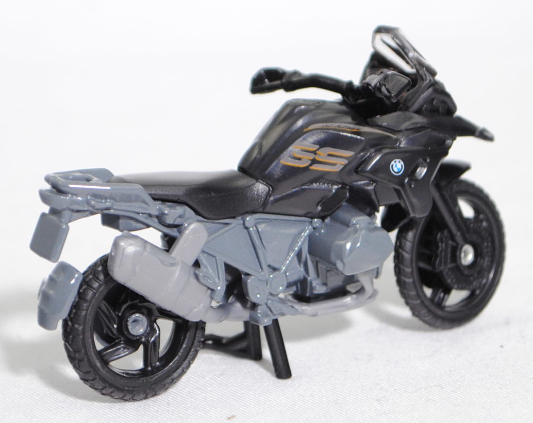 00000 BMW R 1250 GS Triple Black LCI (5. Generation, Baureihe GS, Typ K50 (0J91), geländegängiges teilverkleidetes Motorrad als Reiseenduro mit 1 Sitzplatz, Facelift 2020 (bei BMW LCI = Lifecycle Impulse genannt), Voll-LED-Scheinwerfer, Auspuffkrümmer unten aus den Zylindern geführt mit weiterem Verlauf nach hinten auf der rechten Seite, Sonderausstattung: Verlängerung Vorderradabdeckung + Rallye-Sitzbank niedrig mit Gepäckplatte, Kardanantrieb, Motor: BMW luft-/flüssigkeitsgekühlter Zweizylinder-Boxer-Viertakt-Otto mit vollsequentielle Einspritzung und zwei obenliegenden stirnradgetriebenen Nockenwellen (DOHC = Double Overhead Camshaft) sowie 4 Ventile pro Zylinder und 1254 cm³ sowie 136 PS, Radstand 1514 mm, Gesamtlänge 2207 mm, Modell 2020-2023) Motorrad, schwarz (vgl. blackstorm metallic beim Original, Farbcode ND2), Sitzbank schwarz, Lenker schwarz, Druck BMW-Logo in reinweiß/schwarz/signalblau auf der Seitenverkleidung, Druck Streifen in mausgrau/signalgelb und R 1250 in schwarz sowie GS in mausgrau/signalgelb auf den Seiten des Tanks, Hauptrahmen und Motor basaltgrau (vgl. achatgrau metallic beim Original, Farbcode M4B), mit Windschild (Windschutzscheibe), Frontscheinwerfer silber, Auspuff silbergrau, C66a / C66b schwarz (BMW Aluminium-Gussräder im 10-Speichen-Design in schwarz vorne Größe 3,00 x 19 (Teilenummer 36 31 8 404 713, Farbcode schwarz) mit Reifen 120/70 R 19 und hinten Größe 4,50 x 17 (Teilenummer 36 31 8 404 712, Farbcode schwarz) mit Reifen 170/60 R 17), SIKU SUPER, ca. 1:35, P29f (EAN 4006874013999)