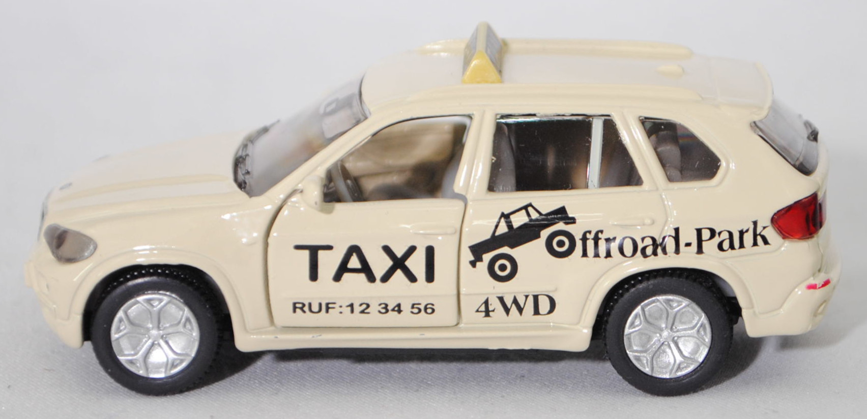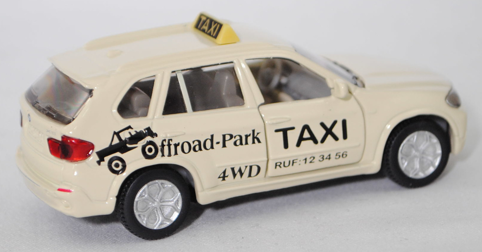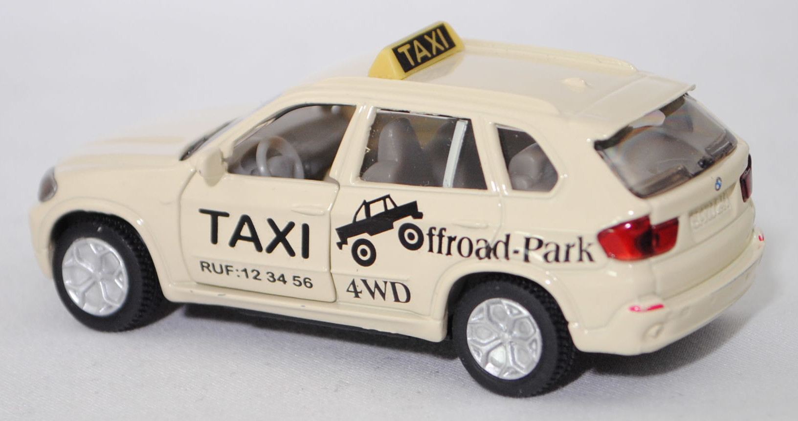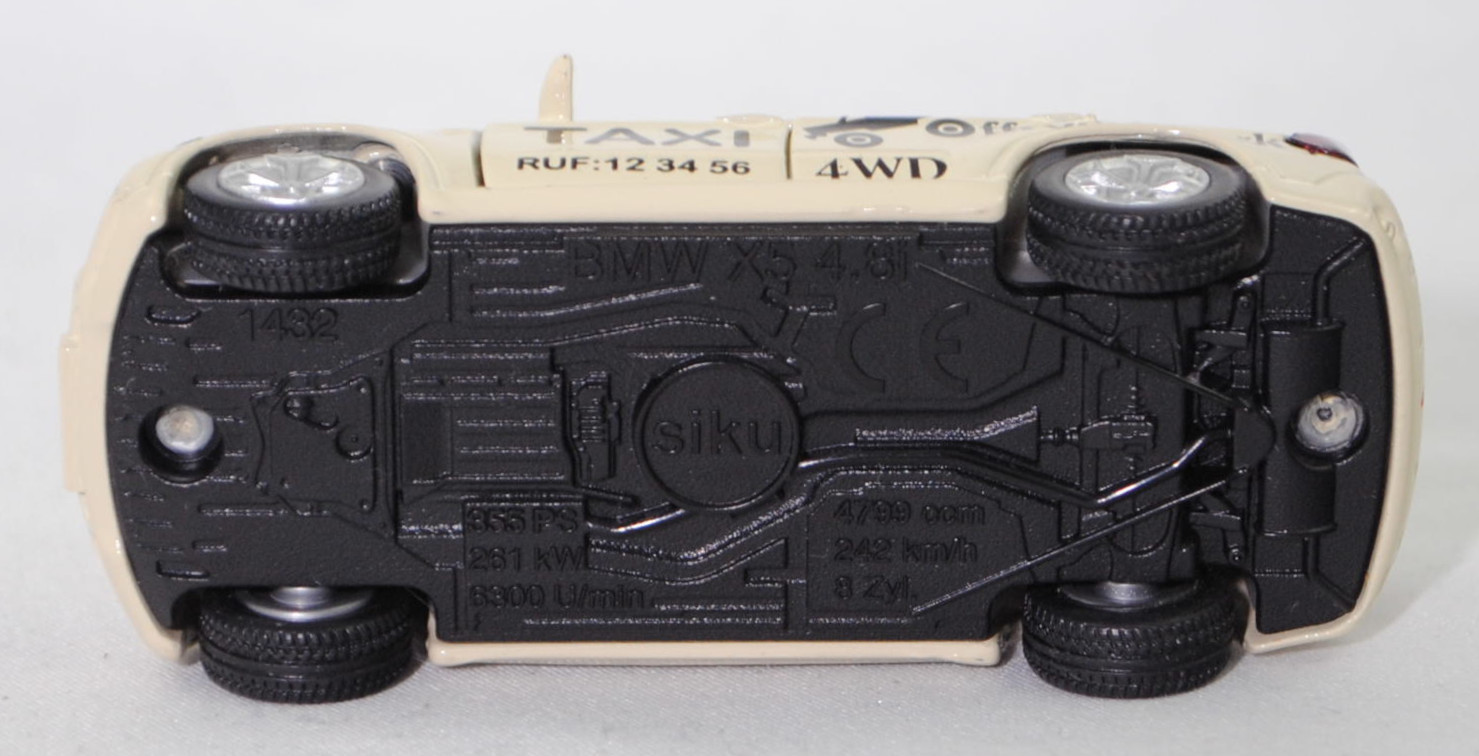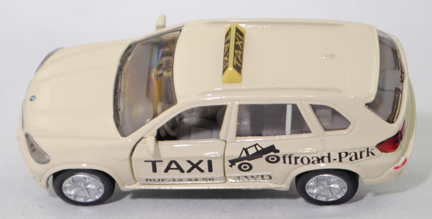 Produktinformationen "00000 BMW X5 3.0si / xDrive30i (E70, Modell 2006-2008) Taxi-Geländewagen, hellelfenbein, TAXI / RUF:12 34 56 / Offroad-Park / 4WD, SIKU SUPER, 1:58, m"