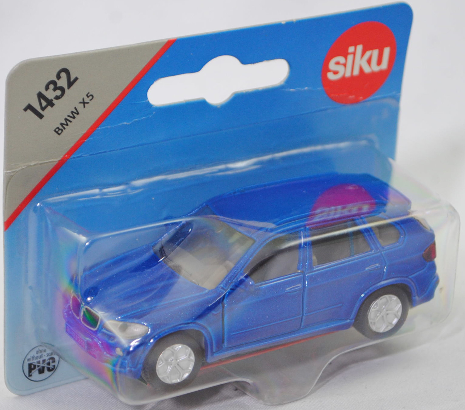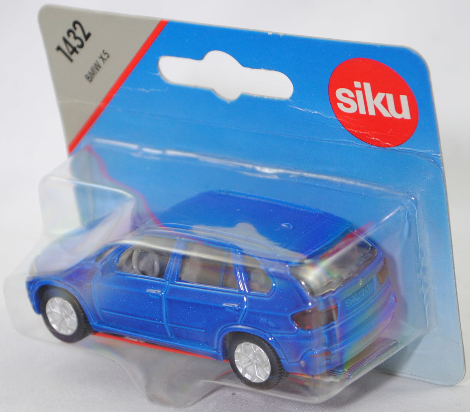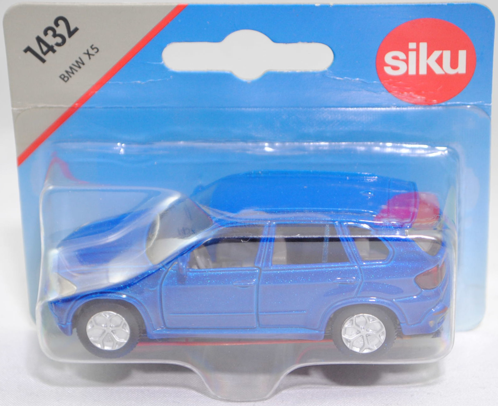 00000 BMW X5 3.0si / xDrive30i (2. Generation, Baureihe X5, interne Baureihenbezeichnung E70, fünftüriges Sport Utility Vehicle (SUV) mit 5 Sitzplätzen, Vorfacelift (vor LCI = vor Life Cycle Impulse bzw. vor Modellpflegemaßnahmen), Frontziergitter mit Nieren-Längsstreben in schwarz mit Chromeinfassung, Front- und Heckschürze nur im oberen Bereich in Wagenfarbe lackiert, breite flache Lüftungsöffnungen unten außen im Stoßfänger, mittlere Lüftungsöffnung im Stoßfänger nur bis auf halber Nummernschildhöhe geführt, runde Nebelscheinwerfer in trichterförmiger Aussparung im Stoßfänger, Stoßfänger hinten durchgehend ohne angedeuteten Diffusor, 2 runde Edelstahl-Auspuffendrohre je eins rechts und links, Ausstattungslinie 3.0si / xDrive30i: Halogen-Scheinwerfer + Nebelscheinwerfer + Frontziergitter mit Nieren-Längsstäben in schwarz, mit Chromeinfassung + Sechszylinder-Motor mit 2996 cm³ und 272 PS + 6-Gang-Automatic-Getriebe und elektronischem Gangwahlschalter inkl. Steptronic und adaptiver Getriebesteuerung + Außenspiegel asphärisch beheizt und elektrisch einstellbar + Innenspiegel automatisch abblendend + Interieurleisten Graphitan matt + Lederlenkrad im 3-Speichen Design mechanisch längs- und höhenverstellbar + Klimaautomatik + Sitzverstellung teilelektrisch für Fahrer und Beifahrer + Polsterung Stoff Twill + Fensterrahmenleiste in schwarz matt + Dachspoiler inkl. dritter Bremsleuchte + Heckklappe zweiteilig, Oberteil nach oben zu öffnen, Heckklappenunterteil manuell entriegelbar, Unterteil auf Ladekantenniveau abklappbar + Heckscheibenwischer + 2 Auspuffendrohre (je eins rechts und links), Edelstahl, rund + Leichtmetallräder Sternspeiche 209 Größe 8,5 J x 18 mit Reifen 255/55 R 18 Runflat, 6-Gang-Automatikgetriebe, Allradantrieb, Motor: BMW Typ N52B30 wassergekühlter Sechszylinder-Reihen-Viertakt-Otto mit Saugrohreinspritzung und zwei obenliegende Nockenwellen (DOHC = Double Overhead Camshaft) sowie 4 Ventile pro Zylinder und 2996 cm³ sowie 272 PS, Radstand 2933 mm, Länge 4854 mm, Modell 2006-2008 als X5 3.0si bzw. 2008-2010 als X5 xDrive30i), dunkel-verkehrsblaumetallic (vgl. tiefseeblau metallic beim Original, Farbcode A76), innen achatgrau, Sitze achatgrau, Lenkrad achatgrau, Bpr. 1432 beim linken Vorderrad, Bpr. ohne Adresse, ohne Chargendruck auf dem Chassis, B41 silber (BMW Leichtmetallräder Sternspeiche 209 (5-Speichen-Design) Größe 8,5 J x 18 ET 46 mit Lochkreis 5 x 120 (Teilenummer 36 11 6 770 200, Farbe silber) und Nabenabdeckung (Ø 67 mm mit Chromrand, Teilenummer 36 13 6 783 536) sowie Reifen 255/55 R 18 109V Runflet), SIKU SUPER, ca. 1:58, P29a (Vitrinenmodell, Schachtel mit Lagerspuren) (EAN 4006874014323)