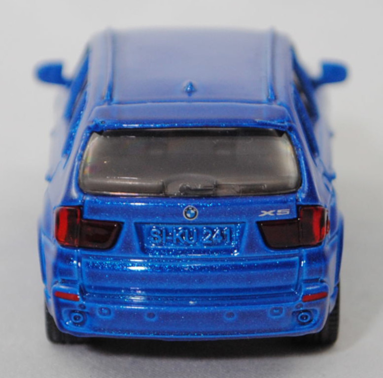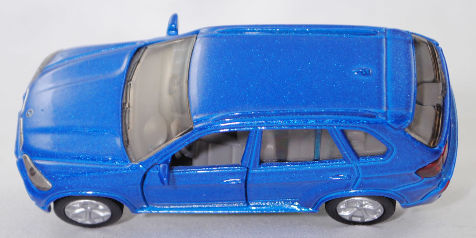 00000 BMW X5 3.0si / xDrive30i (2. Generation, Baureihe X5, interne Baureihenbezeichnung E70, fünftüriges Sport Utility Vehicle (SUV) mit 5 Sitzplätzen, Vorfacelift (vor LCI = vor Life Cycle Impulse bzw. vor Modellpflegemaßnahmen), Frontziergitter mit Nieren-Längsstreben in schwarz mit Chromeinfassung, Front- und Heckschürze nur im oberen Bereich in Wagenfarbe lackiert, breite flache Lüftungsöffnungen unten außen im Stoßfänger, mittlere Lüftungsöffnung im Stoßfänger nur bis auf halber Nummernschildhöhe geführt, runde Nebelscheinwerfer in trichterförmiger Aussparung im Stoßfänger, Stoßfänger hinten durchgehend ohne angedeuteten Diffusor, 2 runde Edelstahl-Auspuffendrohre je eins rechts und links, Ausstattungslinie 3.0si / xDrive30i: Halogen-Scheinwerfer + Nebelscheinwerfer + Frontziergitter mit Nieren-Längsstäben in schwarz, mit Chromeinfassung + Sechszylinder-Motor mit 2996 cm³ und 272 PS + 6-Gang-Automatic-Getriebe und elektronischem Gangwahlschalter inkl. Steptronic und adaptiver Getriebesteuerung + Außenspiegel asphärisch beheizt und elektrisch einstellbar + Innenspiegel automatisch abblendend + Interieurleisten Graphitan matt + Lederlenkrad im 3-Speichen Design mechanisch längs- und höhenverstellbar + Klimaautomatik + Sitzverstellung teilelektrisch für Fahrer und Beifahrer + Polsterung Stoff Twill + Fensterrahmenleiste in schwarz matt + Dachspoiler inkl. dritter Bremsleuchte + Heckklappe zweiteilig, Oberteil nach oben zu öffnen, Heckklappenunterteil manuell entriegelbar, Unterteil auf Ladekantenniveau abklappbar + Heckscheibenwischer + 2 Auspuffendrohre (je eins rechts und links), Edelstahl, rund + Leichtmetallräder Sternspeiche 209 Größe 8,5 J x 18 mit Reifen 255/55 R 18 Runflat, 6-Gang-Automatikgetriebe, Allradantrieb, Motor: BMW Typ N52B30 wassergekühlter Sechszylinder-Reihen-Viertakt-Otto mit Saugrohreinspritzung und zwei obenliegende Nockenwellen (DOHC = Double Overhead Camshaft) sowie 4 Ventile pro Zylinder und 2996 cm³ sowie 272 PS, Radstand 2933 mm, Länge 4854 mm, Modell 2006-2008 als X5 3.0si bzw. 2008-2010 als X5 xDrive30i), dunkel-verkehrsblaumetallic (vgl. tiefseeblau metallic beim Original, Farbcode A76), innen achatgrau, Sitze achatgrau, Lenkrad achatgrau, Bpr. 1432 beim linken Vorderrad, Bpr. ohne Adresse, ohne Chargendruck auf dem Chassis, B41 silber (BMW Leichtmetallräder Sternspeiche 209 (5-Speichen-Design) Größe 8,5 J x 18 ET 46 mit Lochkreis 5 x 120 (Teilenummer 36 11 6 770 200, Farbe silber) und Nabenabdeckung (Ø 67 mm mit Chromrand, Teilenummer 36 13 6 783 536) sowie Reifen 255/55 R 18 109V Runflet), SIKU SUPER, ca. 1:58, m (Vitrinenmodell) (EAN 4006874014323)