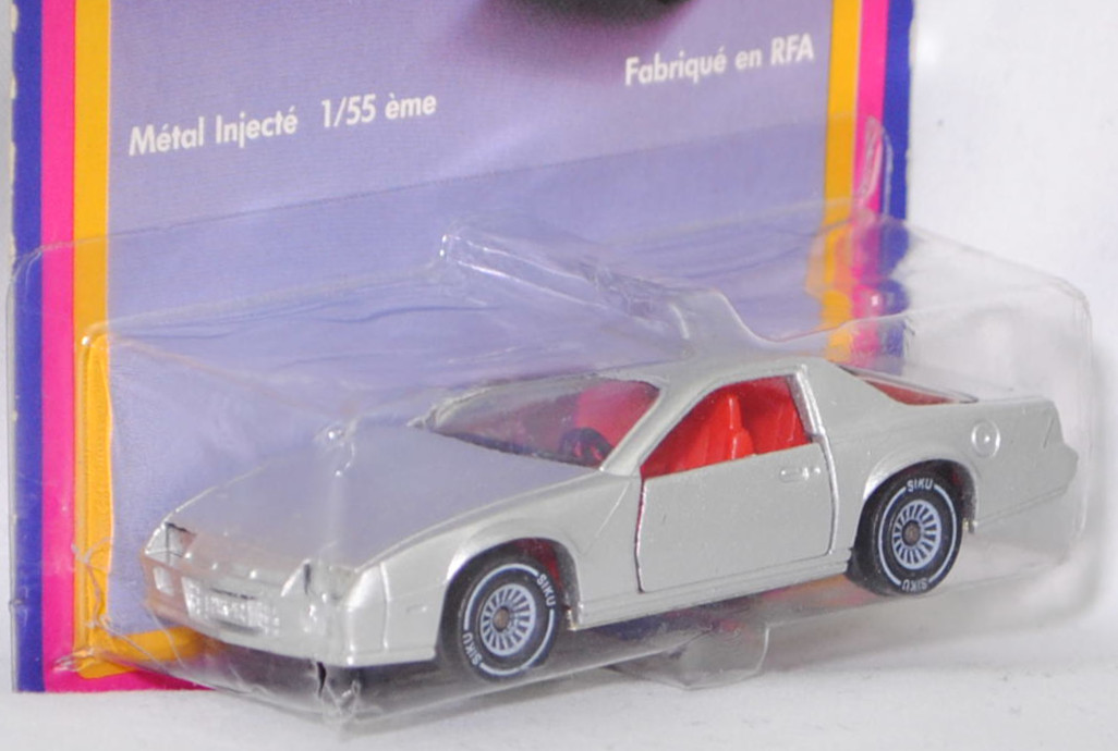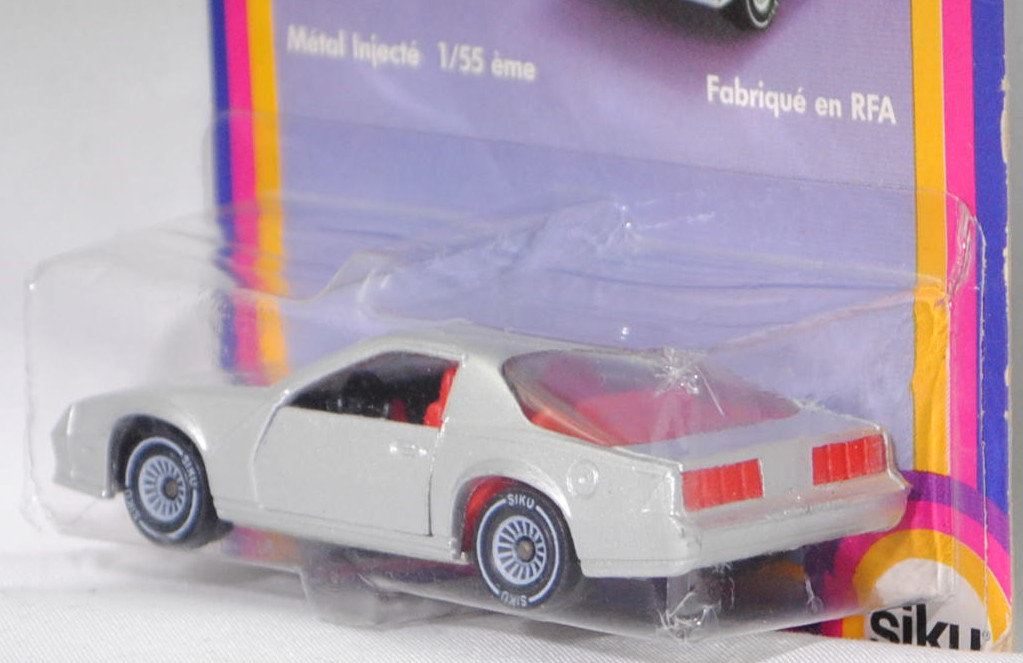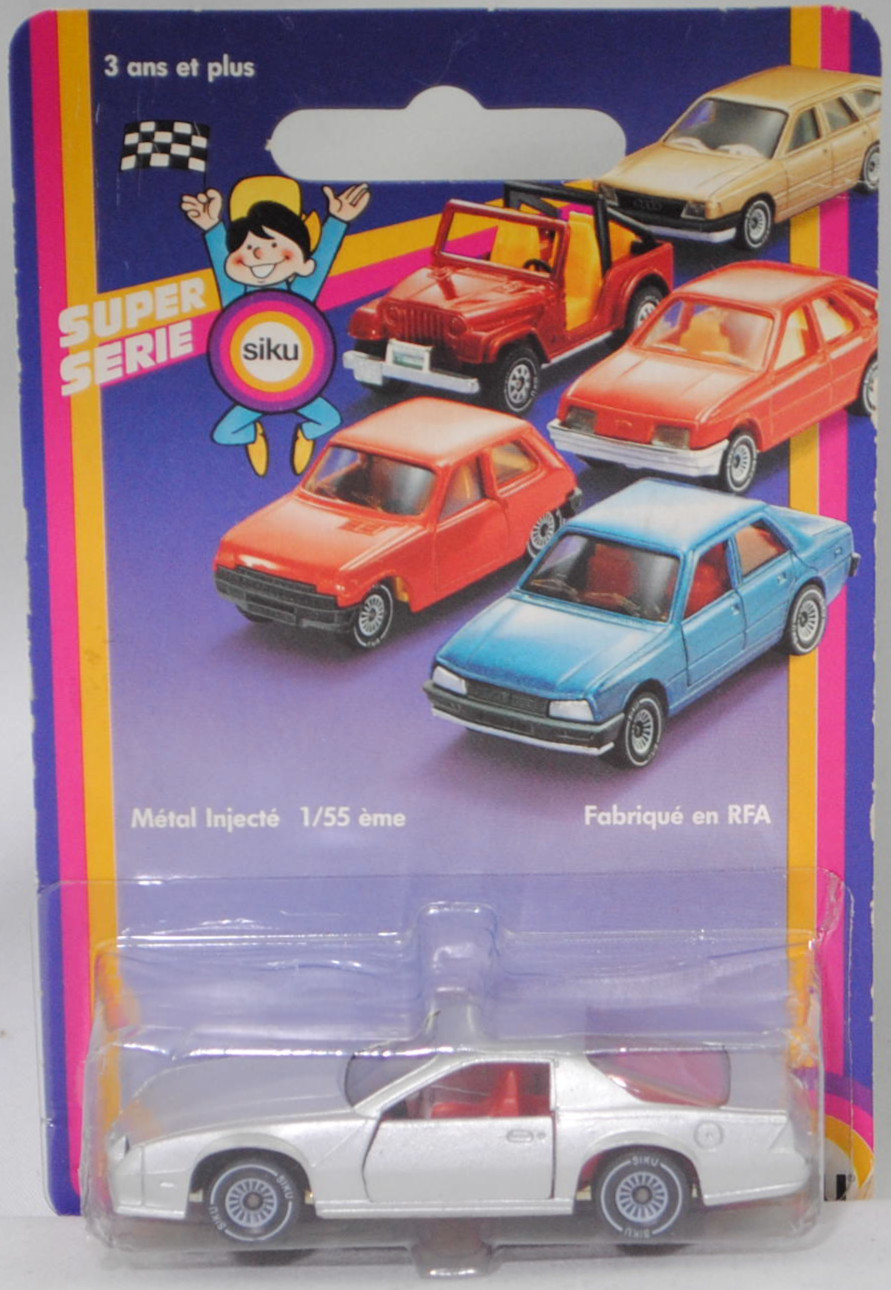 00000 Chevrolet Camaro Berlinetta 5.0L V8 (3. Generation, Baureihe Camaro, F-Body-Plattform der 3. Generation, zweitüriger Sportwagen als Coupé mit 4 Sitzplätzen, Vorfacelift, Frontschürze vorne leicht abgewinkelt und nicht so tief heruntergezogen, Ausstattungslinie Berlinetta: schwarz lackierte Scheinwerferhöhlen + Stoßfänger vorne mit 3 Lüftungsschlitzen zwischen den Frontscheinwerfern + Blinker im Stoßfänger vorne quadratisch + Stoßfänger vorne und hinten in Wagenfarbe + Motorhaube ohne Lüftungsschlitze + Sportspiegel in Wagenfarbe, links elektrisch verstellbar und rechts manuell + vollständige Instrumentierung mit Tachometer, Drehzahlmesser, Tageskilometerzähler, Kraftstoff-, Voltmeter-, Öl- und Temperaturanzeigen + elektrische Quarz-Analoguhr + abgedecktes Staufach + gepolstertes Lenkrad mit quadratischer Nabe + Zweiklang Hupe + verstellbare Vordersitze und umklappbare Rücksitzlehne + Türverkleidungen unten mit Teppichbezug + mit Teppich bezogene Radkästen und Seitenwände + Innenraumbeleuchtung + Zierstreifen in gold/schwarz unten rundherum + Deluxe-Gepäckraumverkleidung + Heckscheibe mit schwarzem Rand + Tankdeckel + goldfarbene Embleme und Typenbezeichnungen + spezielles komfortables Fahrwerk + 14'' x 7'' Aluminiumfelgen im Flossen-Design gold akzentuiert + Stahlgürten-Radialreifen 205/70 R 14, Sonderausstattung gegen Mehrpreis: Chevrolet 5,0 Liter 4-Bbl. V8 Motor mit 5001 cm³ und 147 PS (1982) bzw. 152 PS (1982-1984) + 3-Gang Automatikgetriebe, 3-Gang Automatikgetriebe, Hinterradantrieb, Motor: General Motors-Chevrolet Motor Division Typ 5.0 Liter 4-Bbl. V8 (Turbo-Fire V-8, Small Block mit 305,2 cui, Bestellcode LG4) wassergekühlter Achtzylinder-V-Viertakt-Otto mit einem Fallstrom-Doppel-Registervergaser Rochester E4ME-4 barrel und eine zentrale Nockenwelle sowie OHV-Ventilsteuerung (OHV = overhead valves) und 2 Ventile pro Zylinder sowie 5001 cm³ und 147 PS (1982) bzw. 152 PS (1982-1984), Radstand 2565 mm, Länge 4770 mm, Modell 1982-1984), silbergraumetallic (vgl. silver metallic beim Original, Verkaufskennzeichen 15, Farbcode WA7448), innen verkehrsrot, Sitze verkehrsrot, Lenkrad schwarz, Bpr. CAMARO Z 28, W-Germ, Chassis chrom, ohne CE-Zeichen, Verglasung rauch, B4 (Chevrolet Aluminiumfelgen im Flossen-Design mit 15 Speichen gold akzentuiert Größe 7 J x 14 ET 8,6 mit Lochkreis 5 x 120,65 (Teilenummer 14048328, Farbcode gold akzentuiert (chrom/gold)) und Nabendeckel / Radzierdeckel (Teilenummer Deckel 14035580 mit Farbcode chrom sowie Teilenummer Abdeckkappe 14035578 mit Farbcode schwarz und Schriftzug berlinetta in gold) sowie Stahlgürten-Radialreifen 205/70 R 14), SIKU SUPER, ca. 1:59, P20 (französische Blisterkarte) (Vitrinenmodell, Schachtel mit Lagerspuren, Blister hinten offen) (EAN 4006874010516)