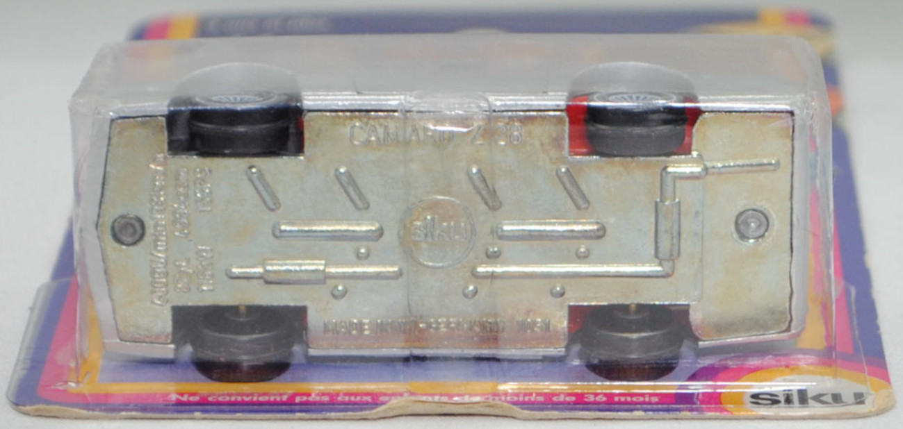 00000 Chevrolet Camaro Berlinetta 5.0L V8 (3. Generation, Vorfacelift, Modell 1982-1984), silber, Bpr. CAMARO Z 28, W-Germ, Chassis chrom, ohne CE-Zeichen, B4, SIKU SUPER, 1:59, P20