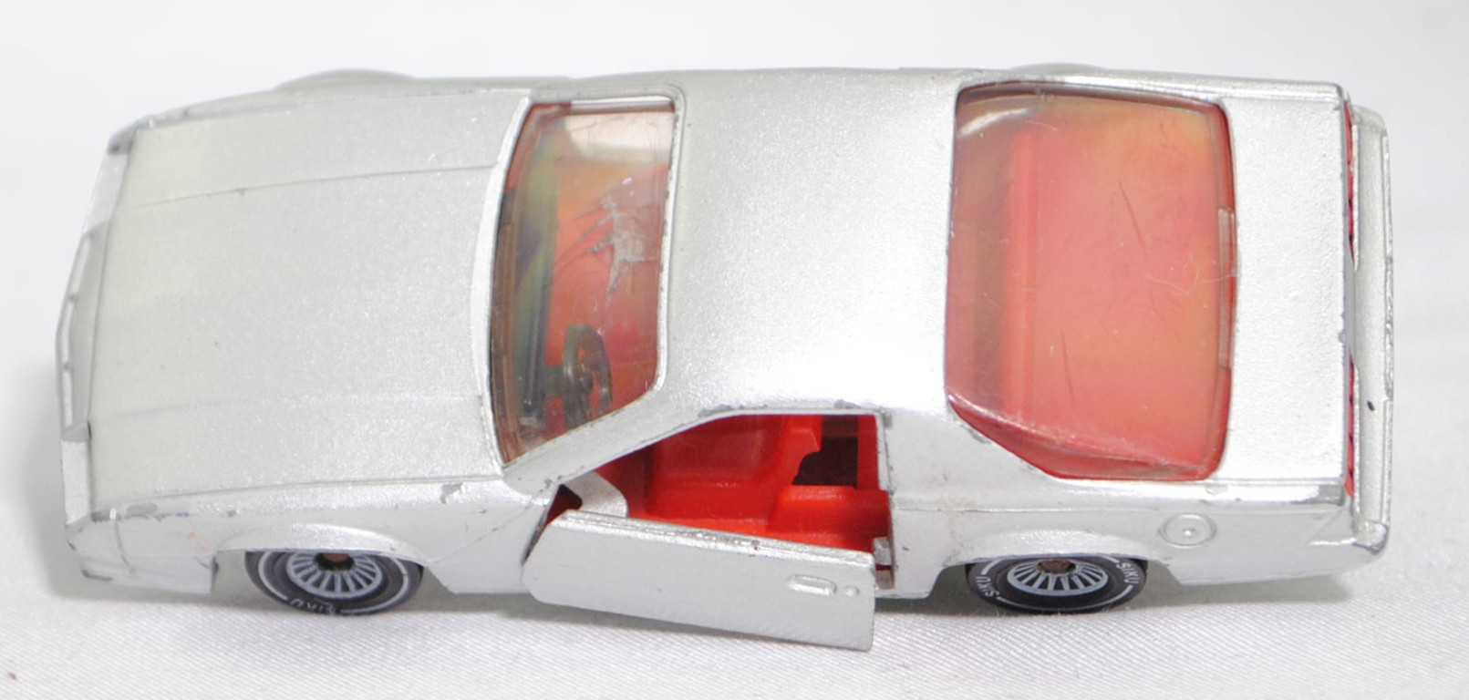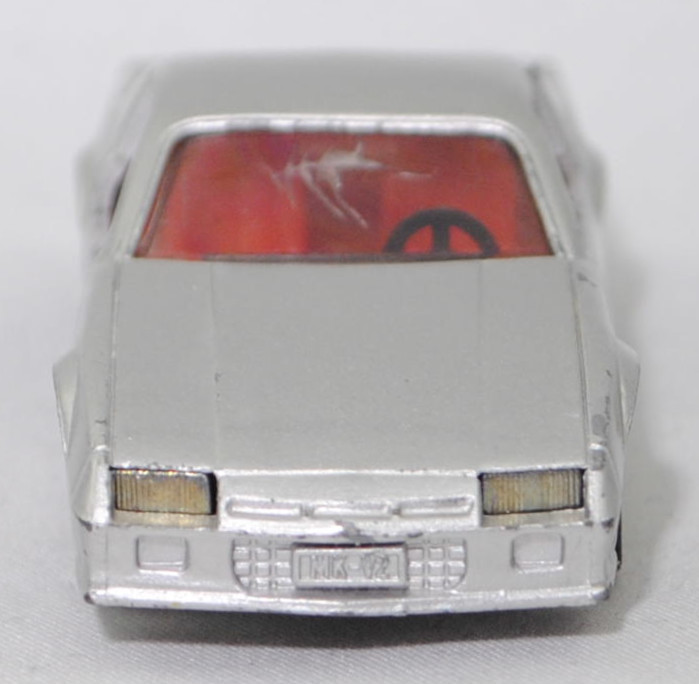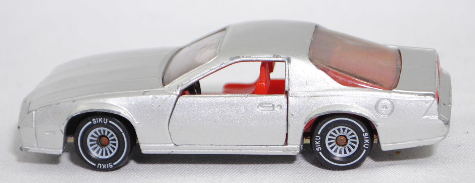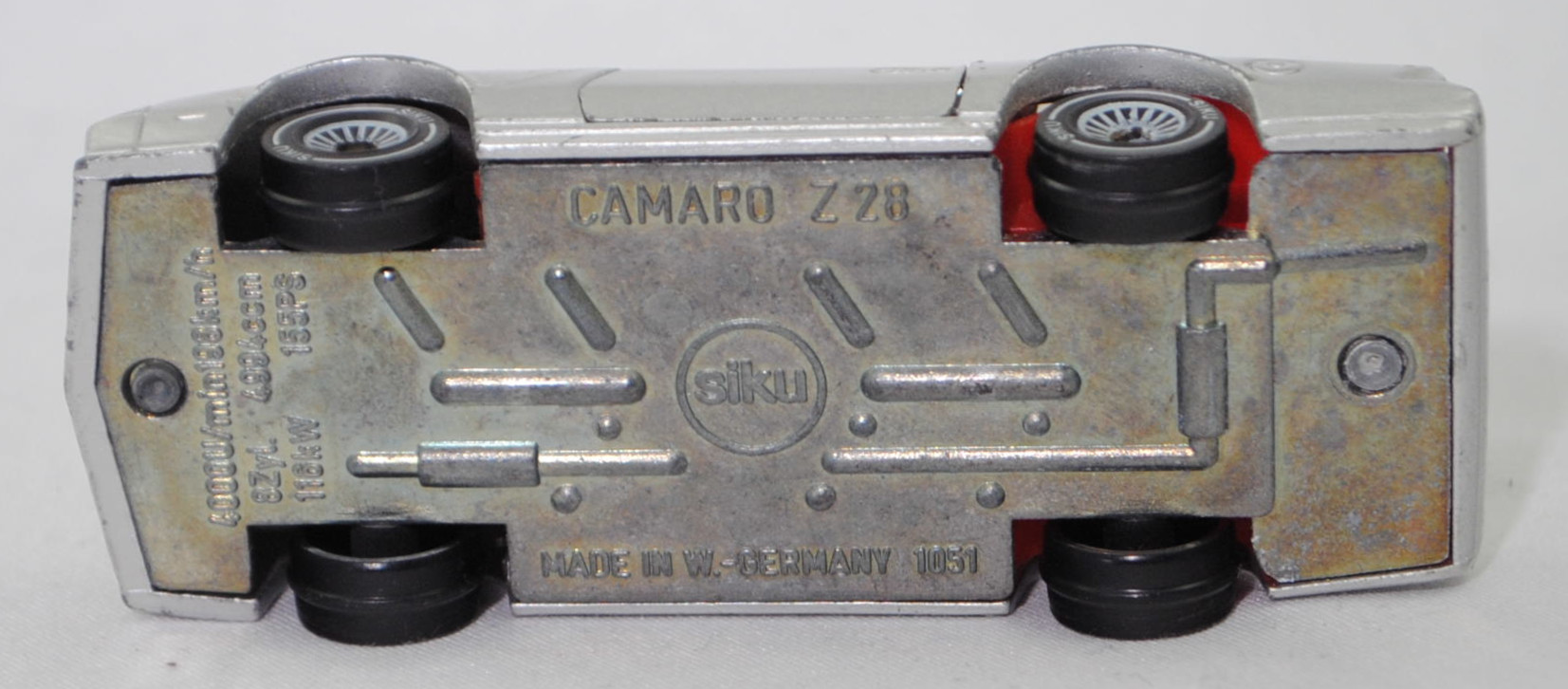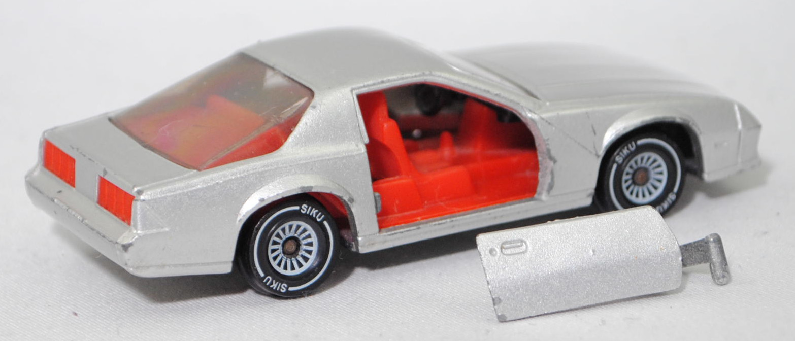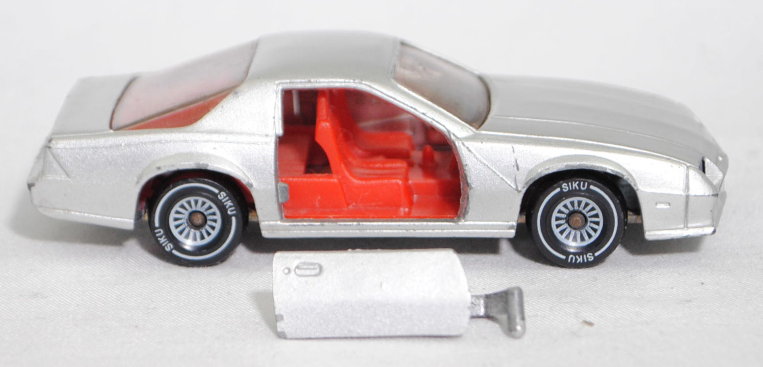00000 Chevrolet Camaro Berlinetta 5.0L V8 (3. Generation, Baureihe Camaro, F-Body-Plattform der 3. Generation, zweitüriger Sportwagen als Coupé mit 4 Sitzplätzen, Vorfacelift, Frontschürze vorne leicht abgewinkelt und nicht so tief heruntergezogen, Ausstattungslinie Berlinetta: schwarz lackierte Scheinwerferhöhlen + Stoßfänger vorne mit 3 Lüftungsschlitzen zwischen den Frontscheinwerfern + Blinker im Stoßfänger vorne quadratisch + Stoßfänger vorne und hinten in Wagenfarbe + Motorhaube ohne Lüftungsschlitze + Sportspiegel in Wagenfarbe, links elektrisch verstellbar und rechts manuell + vollständige Instrumentierung mit Tachometer, Drehzahlmesser, Tageskilometerzähler, Kraftstoff-, Voltmeter-, Öl- und Temperaturanzeigen + elektrische Quarz-Analoguhr + abgedecktes Staufach + gepolstertes Lenkrad mit quadratischer Nabe + Zweiklang Hupe + verstellbare Vordersitze und umklappbare Rücksitzlehne + Türverkleidungen unten mit Teppichbezug + mit Teppich bezogene Radkästen und Seitenwände + Innenraumbeleuchtung + Zierstreifen in gold/schwarz unten rundherum + Deluxe-Gepäckraumverkleidung + Heckscheibe mit schwarzem Rand + Tankdeckel + goldfarbene Embleme und Typenbezeichnungen + spezielles komfortables Fahrwerk + 14'' x 7'' Aluminiumfelgen im Flossen-Design gold akzentuiert + Stahlgürten-Radialreifen 205/70 R 14, Sonderausstattung gegen Mehrpreis: Chevrolet 5,0 Liter 4-Bbl. V8 Motor mit 5001 cm³ und 147 PS (1982) bzw. 152 PS (1982-1984) + 3-Gang Automatikgetriebe, 3-Gang Automatikgetriebe, Hinterradantrieb, Motor: General Motors-Chevrolet Motor Division Typ 5.0 Liter 4-Bbl. V8 (Turbo-Fire V-8, Small Block mit 305,2 cui, Bestellcode LG4) wassergekühlter Achtzylinder-V-Viertakt-Otto mit einem Fallstrom-Doppel-Registervergaser Rochester E4ME-4 barrel und eine zentrale Nockenwelle sowie OHV-Ventilsteuerung (OHV = overhead valves) und 2 Ventile pro Zylinder sowie 5001 cm³ und 147 PS (1982) bzw. 152 PS (1982-1984), Radstand 2565 mm, Länge 4770 mm, Modell 1982-1984), silbergraumetallic (vgl. silver metallic beim Original, Verkaufskennzeichen 15, Farbcode WA7448), innen verkehrsrot, Sitze verkehrsrot, Lenkrad schwarz, Bpr. CAMARO Z 28, W-Germ, Chassis chrom, ohne CE-Zeichen, Verglasung rauch, B4 (Chevrolet Aluminiumfelgen im Flossen-Design mit 15 Speichen gold akzentuiert Größe 7 J x 14 ET 8,6 mit Lochkreis 5 x 120,65 (Teilenummer 14048328, Farbcode gold akzentuiert (chrom/gold)) und Nabendeckel / Radzierdeckel (Teilenummer Deckel 14035580 mit Farbcode chrom sowie Teilenummer Abdeckkappe 14035578 mit Farbcode schwarz und Schriftzug berlinetta in gold) sowie Stahlgürten-Radialreifen 205/70 R 14), SIKU SUPER, ca. 1:59, vsc (Vitrinenmodell, Windschutzscheibe beschädigt, Türhalterung oben rechts abgebrochen, minimale Farbabplatzer) (EAN 4006874010516)