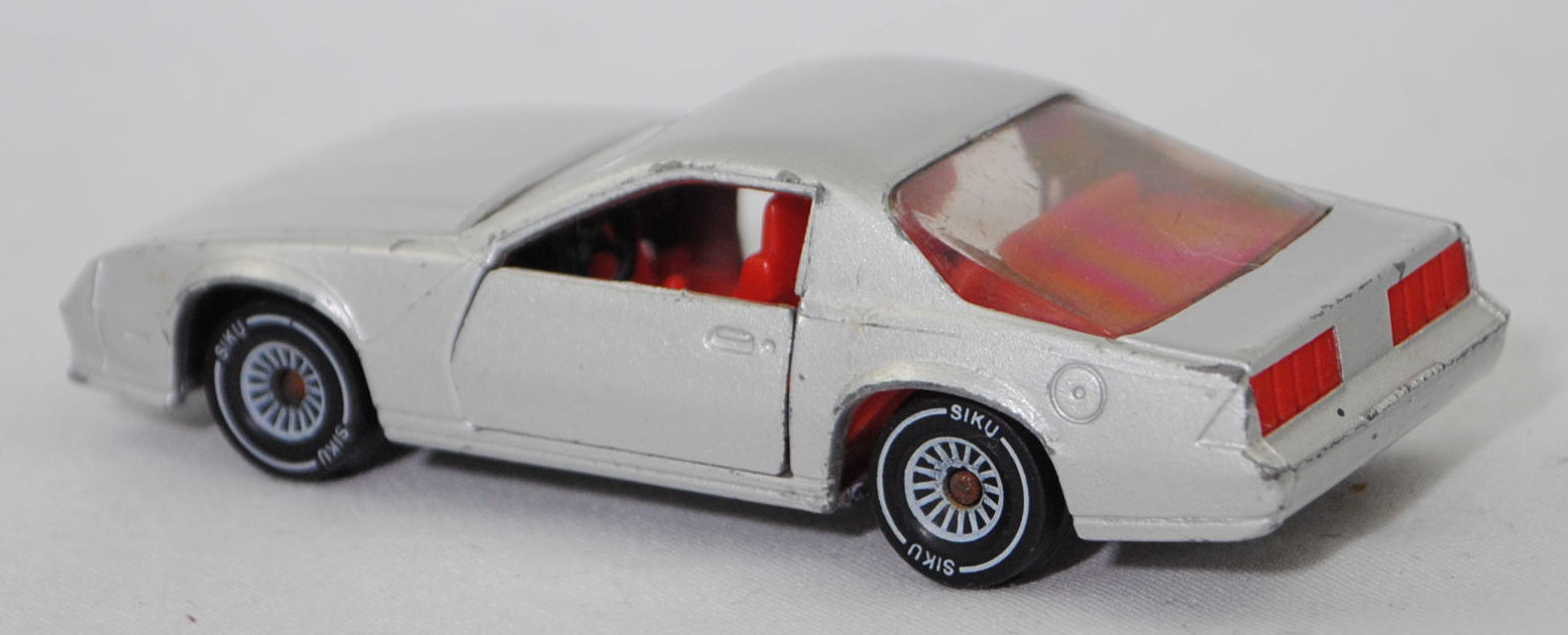00000 Chevrolet Camaro Berlinetta 5.0L V8 (3. Generation, Vorfacelift, Modell 1982-1984), silber, Bpr. CAMARO Z 28, W-Germ, Chassis chrom, ohne CE-Zeichen, B4, SIKU SUPER, 1:59, vsc