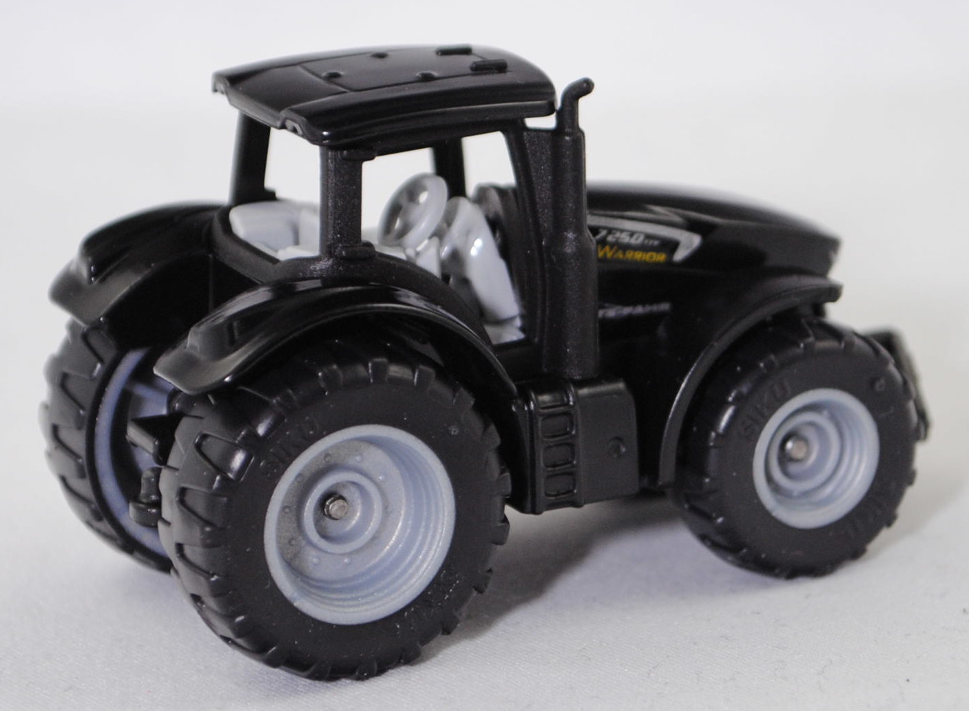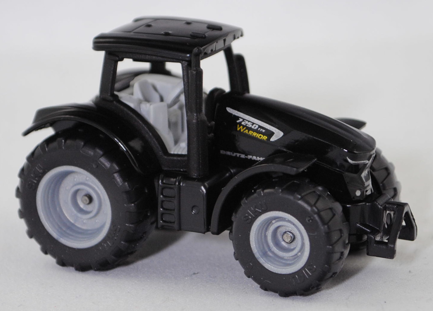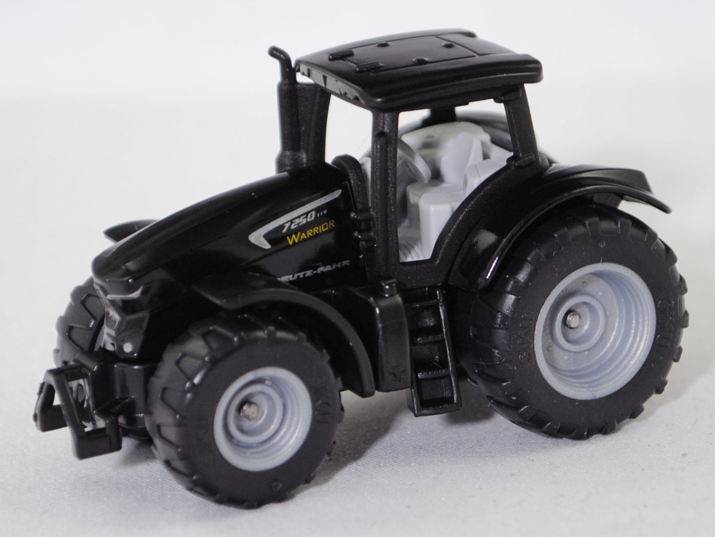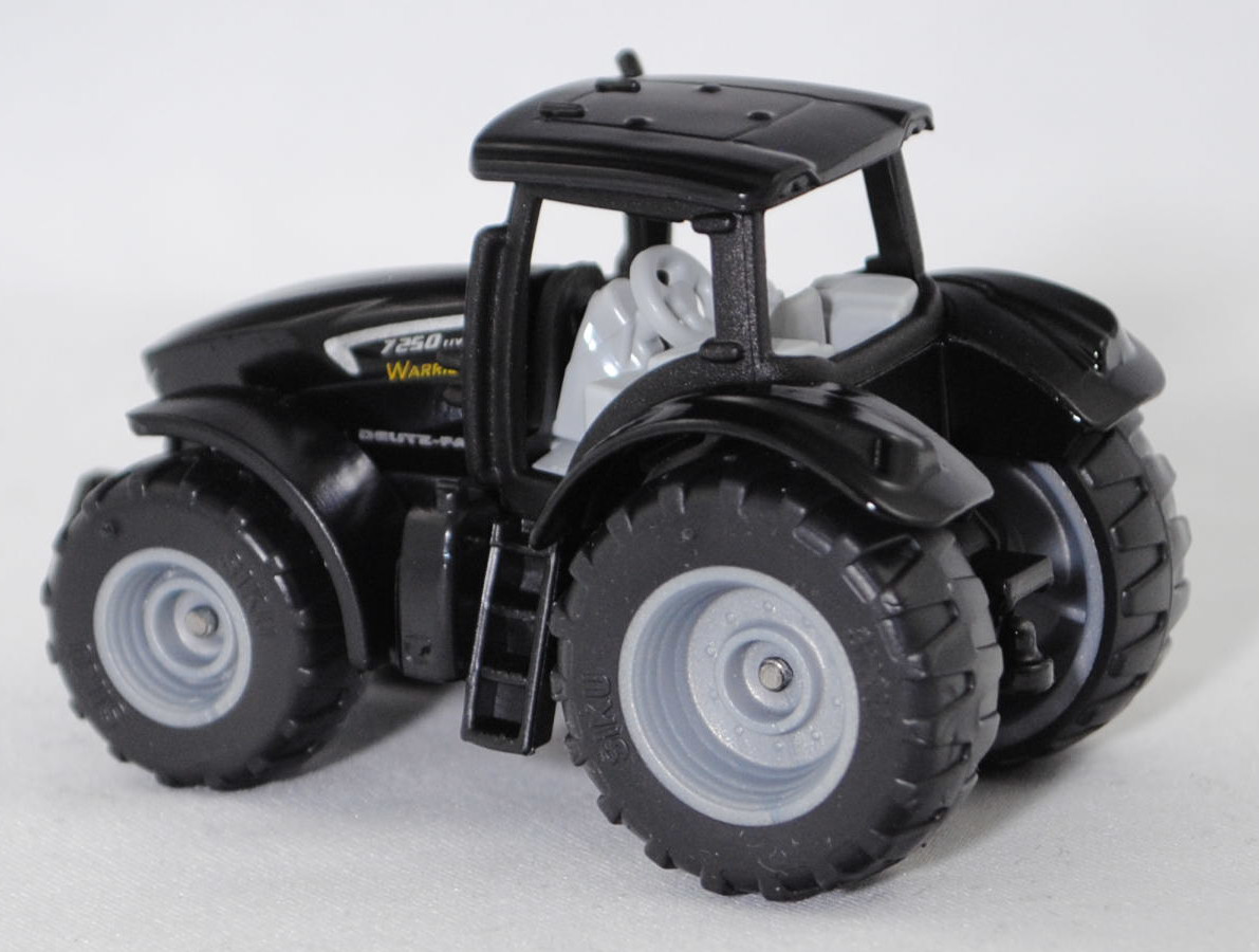 00000 DEUTZ-FAHR 7250 TTV Agrotron Warrior (Typ Serie 7 TTV Agrotron, Sondermodell / LIMITED EDITION, WARRIOR Schriftzug, mit WARRIOR LED-Lichtpaket, WARRIOR Komfortsitz, mit Klimaautomatik, Auspuff mit Edelstahlblende, Allradantrieb, Motor: Deutz Typ TCD 6.1 L06 Sechszylinder-Reihen-Turbo-Viertakt-Diesel mit 6057 cm³ und 246 PS, Radstand 2868 mm, Länge 4972 mm, Modell 2016-) Traktor, schwarz (vgl. brillantschwarz beim Original), innen hell-lichtgrau, Sitz hell-lichtgrau, Lenkrad hell-lichtgrau, Druck 7250 TTV / WARRIOR / DEUTZ-FAHR in silber/gold auf den Seiten der Motorhaube, C77 silbergrau / C78 silbergrau (Bereifung vorne 600/70 R 30 und hinten 710/70 R 38), SIKU SUPER, ca. 1:77, P29f (EAN 4006874013975)
