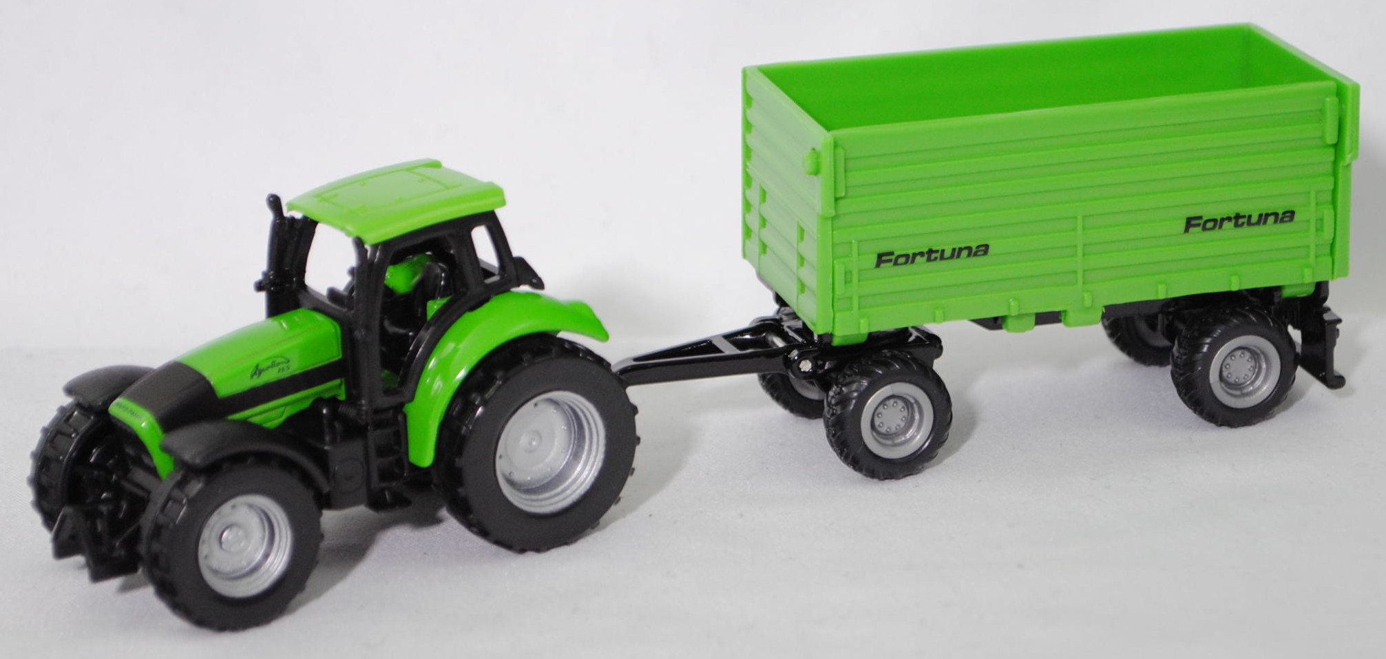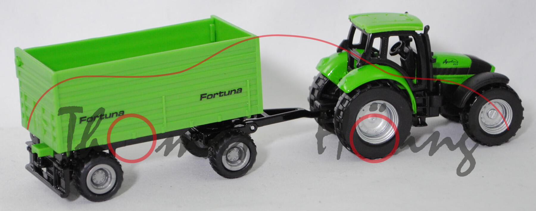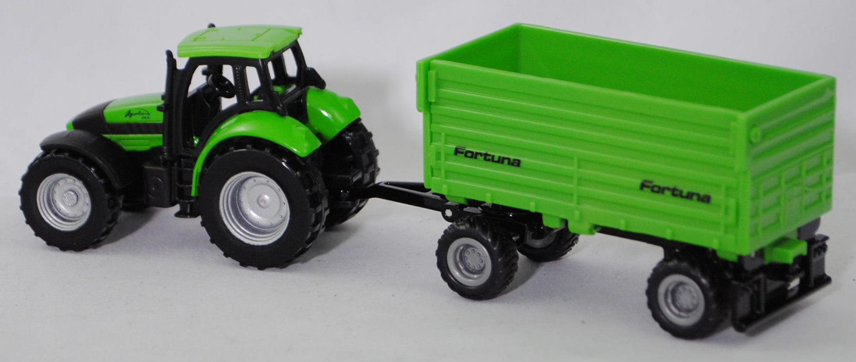 00000 DEUTZ-FAHR Agrotron 265 Traktor (4. Generation, Baureihe Agrotron, interne Baureihenbezeichnung MK4, Typ Großtraktor, Ausstattungslinie 265: PowerCon S-Bedienhebel + pneumatische Kabinenfederung + hydropneumatische Vorderachsfederung + Deutz Motor mit 262 PS Maximalleistung, Leergewicht 9050 kg, zulässiges Gesamtgewicht 14000 kg, Lastschaltgetriebe mit APS (Automatic Powershift) und 40 Vorwärts- sowie 40 Rückwärtsgängen, Allradantrieb, Motor: Deutz Typ BF6M 1013 EC stehender wassergekühlter Sechszylinder-Reihen-Viertakt-Turbo-Diesel mit Bosch Direkteinspritzung und eine seitlich im Kurbelgehäuse angeordnete Nockenwelle sowie 2 Ventile pro Zylinder und Ladeluftkühler sowie 7146 cm³ und 250 PS (Nennleistung) bzw. 262 PS (Maximalleistung), Radstand 3089 mm, Länge von Vorderreifen bis Hinterreifen 5002 mm, Modell 2003-2007) (vgl. 0859) mit Fortuna Zweiachs-Dreiseitenkipper K 180 / 5.2 (1. Generation, Baureihe Zweiachs-Dreiseitenkipper, Ausstattungslinie K 180 / 5.2: Länge Brückeninnenmaß 5200 mm + Kotflügel 40 km/h Ausführung + Unterfahrschutz 40 km/h Ausführung + LKW-Rückleuchten, zulässiges Gesamtgewicht 18.000 kg, Brückeninnenmaße 5200 x 2250/2300 mm (konisch), Bordwandhöhe 800 mm, Pendelaufsatz 800 mm hoch, Modell 1983-) (2-Achs-Anhänger) (vgl. 1077, 2. Ausführung), Traktor: Dach Fahrerhaus gelbgrün, Fensterrahmen schwarz, Sitz schwarz, Lenkrad schwarz, Druck Agrotron / 265 in saphirblau auf den Seiten der Motorhaube, Druck DEUTZ-FAHR in schwarz vorne auf der Motorhaube, Kotflügel vorne schwarz und hinten gelbgrün, Chassis schwarz, C24 silber / C25 silber (Standardbereifung vorne 520/70 R 38 AS und hinten 710/70 R 42 AS), ca. 1:74; 2-Achs-Anhänger: Brücke und Bordwand mit Pendelaufsatz gelbgrün, Druck Fortuna Fortuna in schwarz auf den Seiten der Brücke, nach links kippbar, Bordwand mit Pendelaufsatz links zu öffnen, Drehschemel mit Deichsel und schwarz, Fahrgestell schwarz, C45 silbergrau (Bereifung 560/60 R 22,5), ca. 1:74, SIKU SUPER, P29f (EAN 4006874016068)