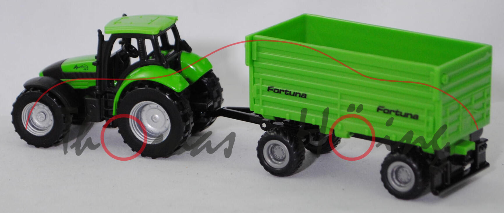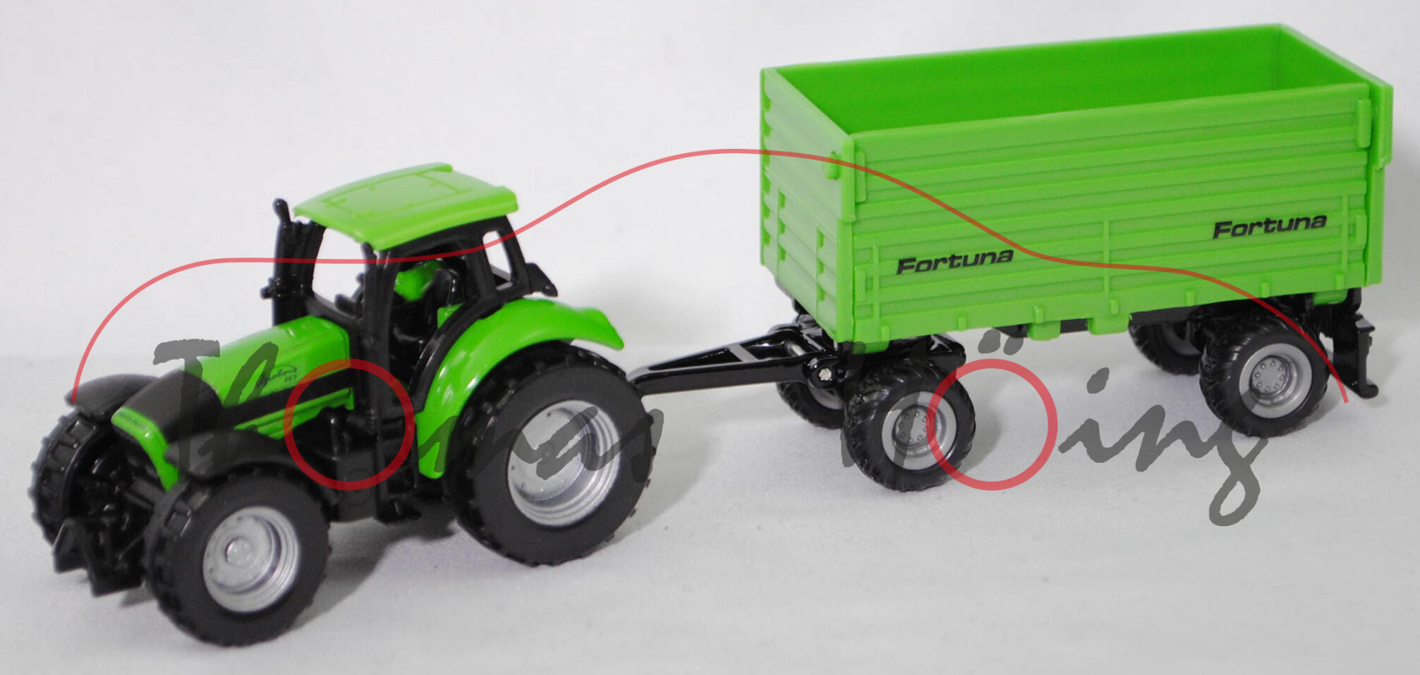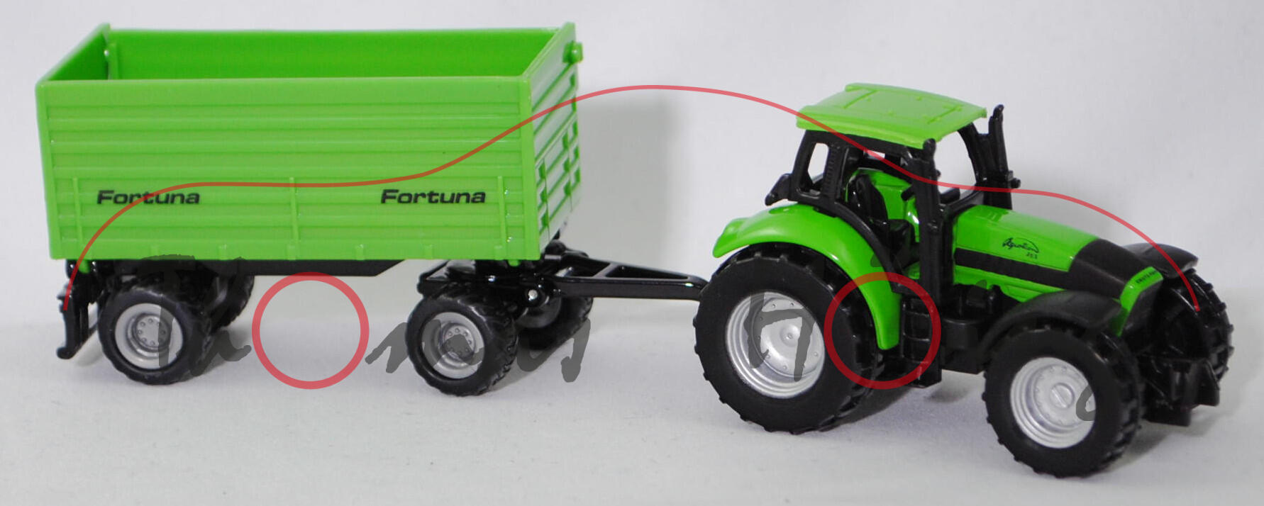 00000 DEUTZ-FAHR Agrotron 265 Traktor (4. Generation, Baureihe Agrotron, interne Baureihenbezeichnung MK4, Typ Großtraktor, Ausstattungslinie 265: PowerCon S-Bedienhebel + pneumatische Kabinenfederung + hydropneumatische Vorderachsfederung + Deutz Motor mit 262 PS Maximalleistung, Leergewicht 9050 kg, zulässiges Gesamtgewicht 14000 kg, Lastschaltgetriebe mit APS (Automatic Powershift) und 40 Vorwärts- sowie 40 Rückwärtsgängen, Allradantrieb, Motor: Deutz Typ BF6M 1013 EC stehender wassergekühlter Sechszylinder-Reihen-Viertakt-Turbo-Diesel mit Bosch Direkteinspritzung und eine seitlich im Kurbelgehäuse angeordnete Nockenwelle sowie 2 Ventile pro Zylinder und Ladeluftkühler sowie 7146 cm³ und 250 PS (Nennleistung) bzw. 262 PS (Maximalleistung), Radstand 3089 mm, Länge von Vorderreifen bis Hinterreifen 5002 mm, Modell 2003-2007) (vgl. 0859) mit Fortuna Zweiachs-Dreiseitenkipper K 180 / 5.2 (1. Generation, Baureihe Zweiachs-Dreiseitenkipper, Ausstattungslinie K 180 / 5.2: Länge Brückeninnenmaß 5200 mm + Kotflügel 40 km/h Ausführung + Unterfahrschutz 40 km/h Ausführung + LKW-Rückleuchten, zulässiges Gesamtgewicht 18.000 kg, Brückeninnenmaße 5200 x 2250/2300 mm (konisch), Bordwandhöhe 800 mm, Pendelaufsatz 800 mm hoch, Modell 1983-) (2-Achs-Anhänger) (vgl. 1077, 2. Ausführung), Traktor: Dach Fahrerhaus gelbgrün, Fensterrahmen schwarz, Sitz schwarz, Lenkrad schwarz, Druck Agrotron / 265 in saphirblau auf den Seiten der Motorhaube, Druck DEUTZ-FAHR in schwarz vorne auf der Motorhaube, Kotflügel vorne schwarz und hinten gelbgrün, Chassis schwarz, C24 silber / C25 silber (Standardbereifung vorne 520/70 R 38 AS und hinten 710/70 R 42 AS), ca. 1:74; 2-Achs-Anhänger: Brücke und Bordwand mit Pendelaufsatz gelbgrün, Druck Fortuna Fortuna in schwarz auf den Seiten der Brücke, nach links kippbar, Bordwand mit Pendelaufsatz links zu öffnen, Drehschemel mit Deichsel und schwarz, Fahrgestell schwarz, C45 silbergrau (Bereifung 560/60 R 22,5), ca. 1:74, SIKU SUPER, P29f (EAN 4006874016068)