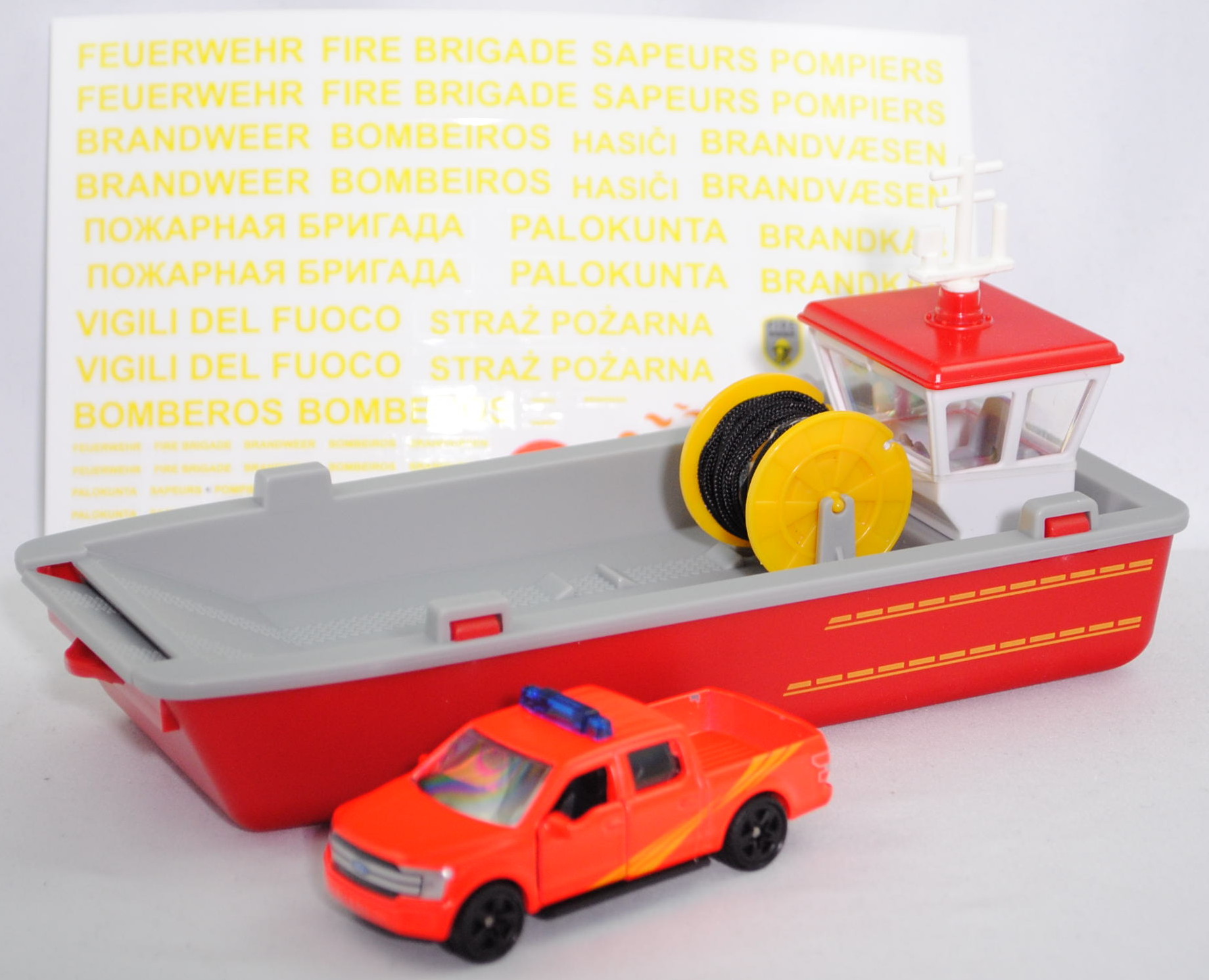 Produktinformationen "00000 Feuerwehr Arbeitsboot / Mehrzweckboot (MZB) mit Ladegut, grau/rot, Ladegut: Ford F-150 (Modell 2018-2020) Feuerwehr, leuchthellrot, SIKU SUPER 1:50, L17mpK"