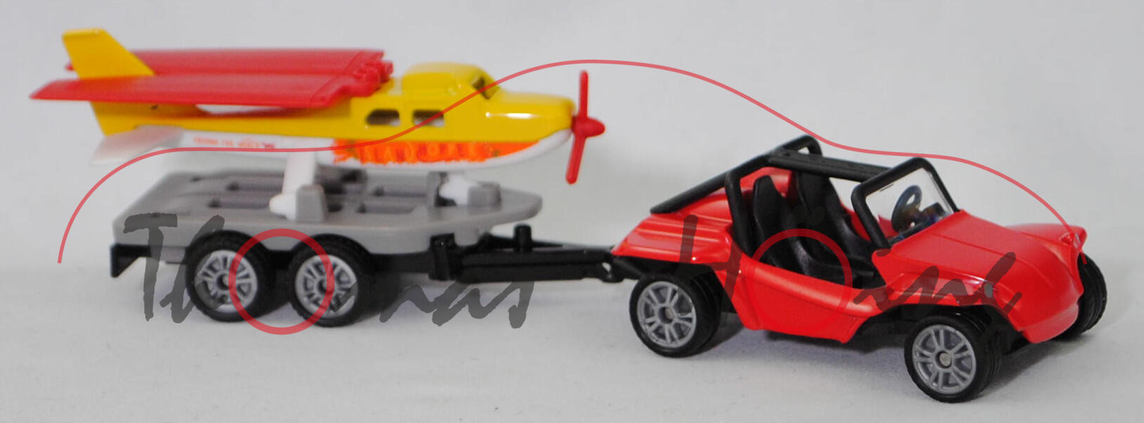 00000 Hazard-Buggy / HAZ-Buggy (Modell 1968-1992) mit Anhänger und Sportflugzeug (vgl. Cessna Skyhawk 172S, Modell 1998-), rot + grau/schwarz + rot/gelb/weiß, SIKU SUPER, P29f