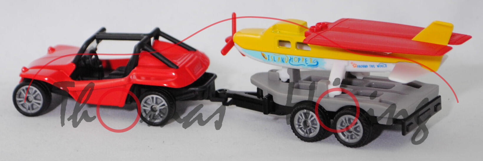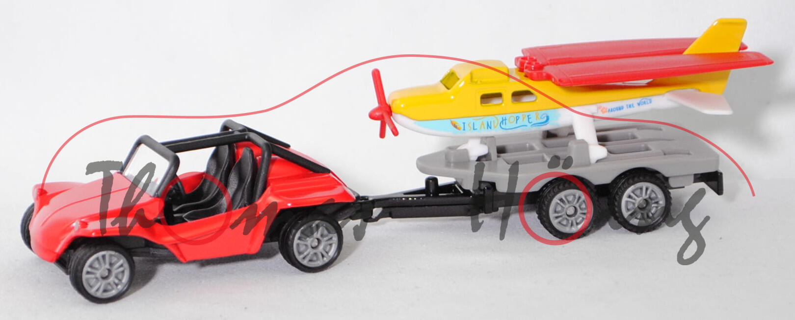 00000 Hazard-Buggy / HAZ-Buggy (gekürtztes Chassis eines VW Käfer 1200 mit GFK-Karosserie, Hersteller: Autohaus Rudolf Kühn KG Billhorner Deich 99 2000 Hamburg 28 (1968-1983) bzw. Buggy-Center-Hamburg Gisela Kühn Stadtbahnstraße 94 2000 Hamburg 65 (1983-1990) oder Umfirmierung zur GmbH an gleicher Anschrift (1990-1992), Motor: Volkswagen Typ 122/2 1,2 l luftgekühlter Vierzylinder-Boxer-Viertakt-Otto mit einem Solex 28 PICT-1 Fallstromvergaser und einer zentralen Nockenwelle sowie OHV-Ventilsteuerung (OHV = overhead valves) und 2 Ventile pro Zylinder sowie 1192 cm³ und 34 PS, Radstand 2027 mm, Länge 3210 mm, Modell 1968-1992, Baujahr 1972) (vgl. 1057, 3. Ausführung) mit Tandem-Anhänger und Sportflugzeug (vgl. Cessna Skyhawk 172S, Typ viersitziges einmotoriges Leichtflugzeug, abgesenkter Rumpfrücken, mit Heckfenster (von Siku nicht umgesetzt), Motor: Lycoming IO-360L2A luftgekühlter Vierzylinder-Boxer-Viertakt mit Saugrohreinspritzung und untenliegender Nockenwelle sowie OHV-Ventilsteuerung (Overhead valve engine) und 5917 cm³ sowie 180 PS, Treibstoff AvGas (Aviation Gasoline = Flugbenzin), Spannweite 11000 mm, Länge 8280 mm, Modell 1998-) (vgl. 1101), Buggy: verkehrsrot, innen schwarz, Lenkrad schwarz, Scheibenrahmen schwarz, Überrollbügel schwarz, B49 geschlossen silbergrau, ca. 1:48; Anhänger: Halterung Sportflugzeug silbergrau, Fahrgestell mit Deichsel schwarz, B49 geschlossen silbergrau; Sportflugzeug: hell-karminrot/verkehrsgelb/reinweiß, Druck ISLANDHOPPER in signalblau/zitronengelb und Feder in orangenbraun/zitronengelb sowie Welle in signalblau auf blass-lichtblau und Sterne in reinorange sowie ARROUND THE WORLD in signalblau auf der linken Seite des unteren Rumpfwerkes, Druck ARROUND THE WORLD in reinorange und Flugzeug in rubinrot sowie ISLANDHOPPER in rubinrot/zitronengelb und Palme in smaragdgrün sowie Blume in rubinrot/smaragdgrün auf reinorange auf der rechten Seite des unteren Rumpfwerkes, klappbare Tragflächen und Propeller hell-karminrot, Oberteil Rumpfwerk mit integriertem Seitenleitwerk verkehrsgelb, Unterteil Rumpfwerk mit integriertem Höhenleitwerk und Fahrwerk reinweiß, ca. 1:103, SIKU SUPER, P29f (EAN 4006874916969)
