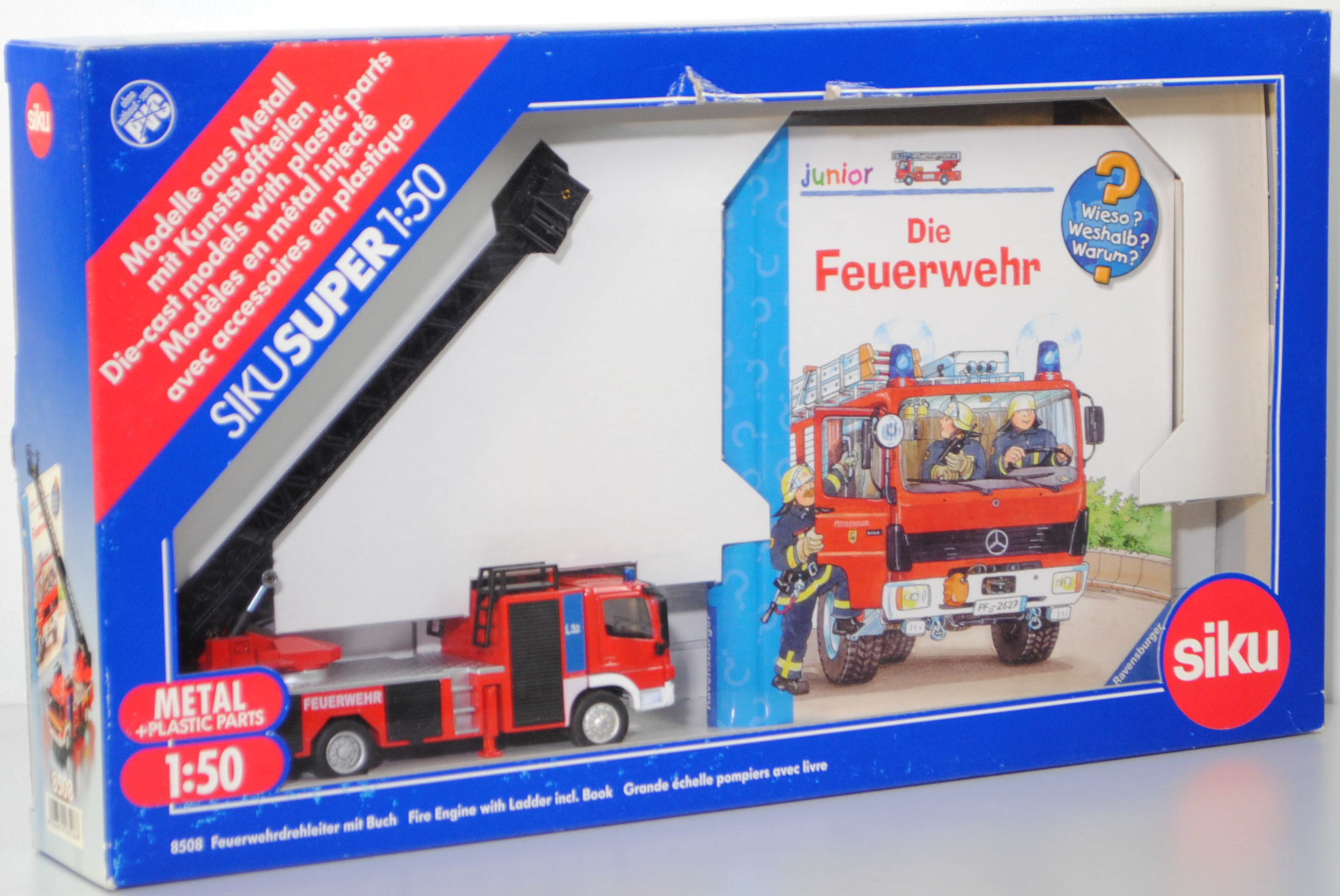 00000 Hubrettungsfahrzeug ROSENBAUER L32A-XS (Metz Technology, Arbeitshöhe 32 m, Leiterpark XS (XS = extra small), abgeneigter Korbarm, Modell 2005-2013) auf Fahrgestell Mercedes-Benz Atego 1528 4x2 (1. Generation, Baureihe LKN Facelift 1 von 2004, S-Fahrerhaus, Kühlergrill so breit wie die Motorklappe, Kühlergrill mit 3 Lüftungsschlitzen, abgerundete quadratische Blinker unten in den Ecken des Kühlergrills, Motor: Mercedes-Benz OM 906 LA wassergekühlter Sechszylinder-Reihen-Viertakt-Diesel mit Direkteinspritzung und einer obenliegenden Nockenwelle (SOHC = Single Overhead Camshaft) sowie 3 Ventilen pro Zylinder und Ladeluftkühler sowie 6374 cm³ und 279 PS, Radstand 4760 mm, Länge 10000 mm, Modell 2004-2006) Feuerwehr-Drehleiter mit Rettungskorb (DLAK 23/12, DLAK = vollautomatische Drehleiter mit Rettungskorb, Nennrettungshöhe 23 m bei Nennausladung 12 m) (vgl. 2106) mit Buch, verkehrsrot/reinweiß, innen lichtgrau, Lenkrad lichtgrau, FEUERWEHR in reinweiß, ohne Druck auf den Türen, Streifen hinter dem Fahrerhaus enzianblau, Drehleiter und Rettungskorb schwarz, Plattform Aufbau weißaluminiummetallic, Leitern und Rolläden schwarz, LKW25 silber, SIKU SUPER 1:50, ca. 1:50, Beilage: Buch Die Feuerwher, L16nmp (Limited Edition) (Vitrinenmodell, Schachtel mit Lagerspuren) (EAN 4006874085088)