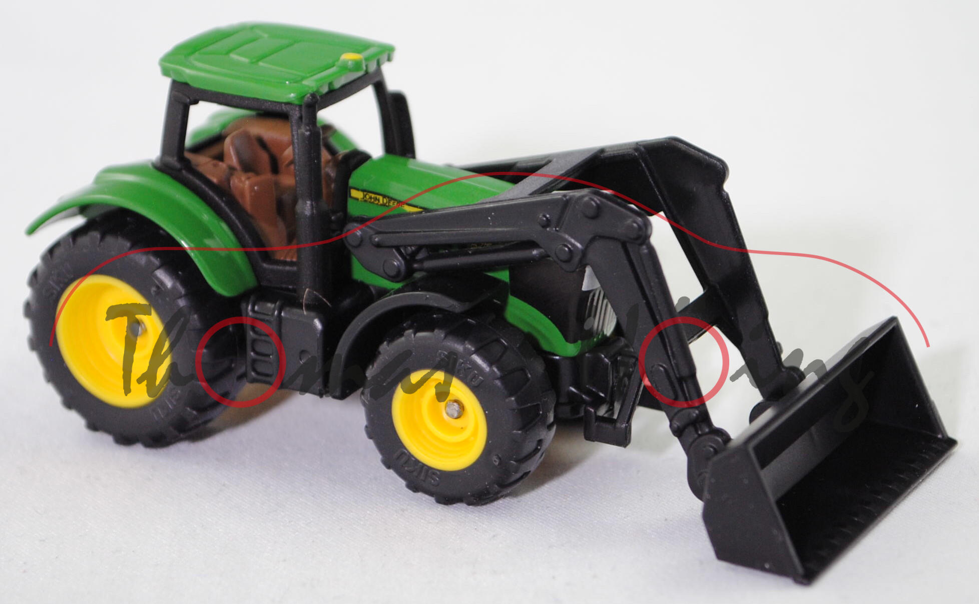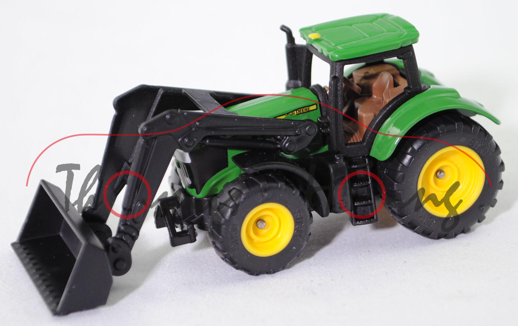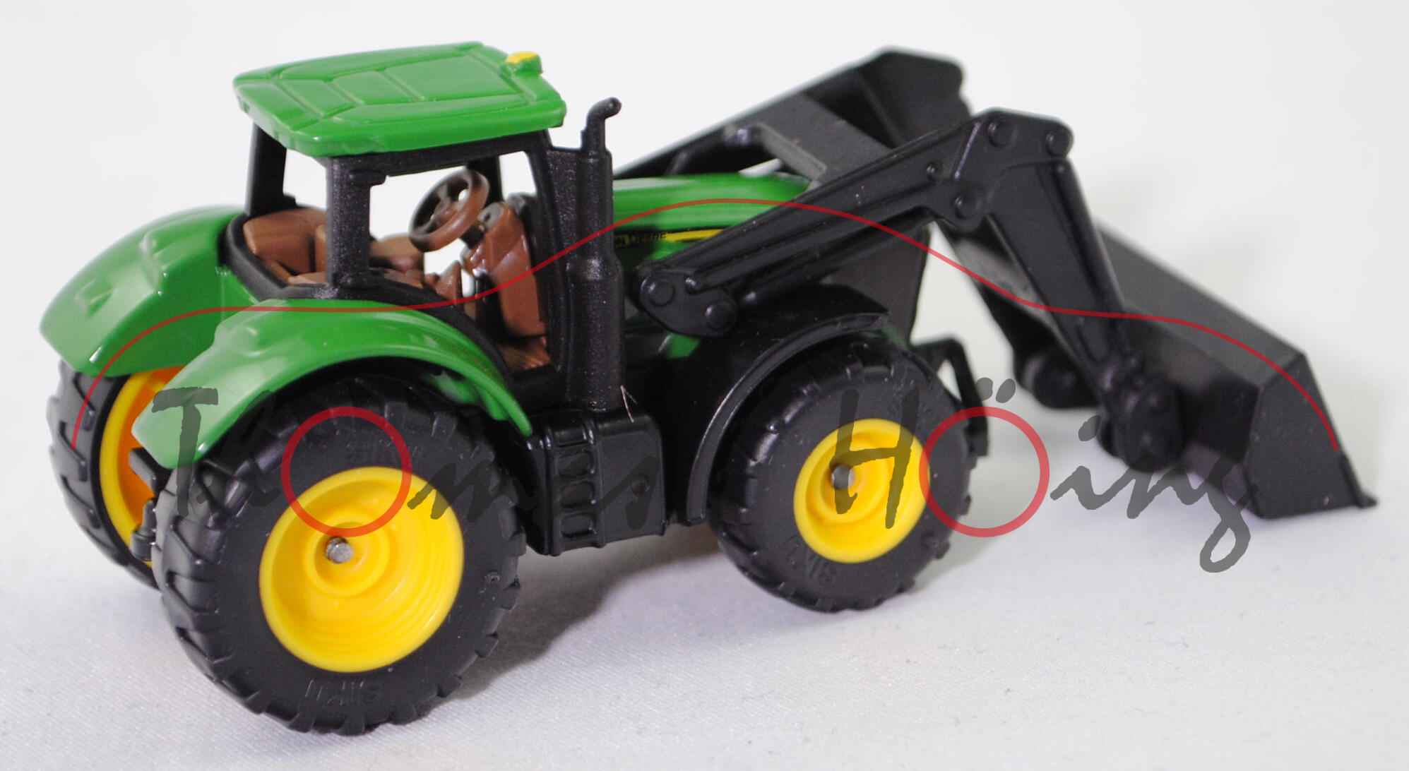 00000 John Deere 6215R ULTIMATE (2. Generation, Baureihe Serie 6R, Typ Traktor mit großem Rahmen, Einführung der SCR-Technologie (selektive catalytic reduction, Abgasreinigung bzw. Reduktion von Stickoxiden in Abgasen), Ausstattungslinie ULTIMATE: Auto-Powr-Getriebe mit CommandPRO und CommandCenter 4600, Leergewicht 8500 kg, zulässiges Gesamtgewicht 13450 kg, Auto-Powr-Getriebe mit zwei Fahrbereichen, elektrohydraulich zuschalbarer Allradantrieb, Motor: John Deere PowerTech PVS Typ 6068HL501B nach Abgasstufe IV (Tier 4 final, 2014-2018) bzw. Abgasstufe V (2018-2022) wassergekühlter Sechszylinder-Reihen-Viertakt-Diesel und Abgasturbolader (ATL) mit variabler Turbinen-Geometrie (VTG) sowie Hochdruck-Common-Rail-Einspritzung und eine zentrale Nockenwelle sowie OHV-Ventilsteuerung (Overhead valve engine) und 4 Ventile pro Zyliner sowie Ladeluftkühler und 6788 cm³ sowie 215 PS (Nennleistung ohne IPM ( intelligent Power Management) bzw. 255 PS (Nennleistung mit IPM ( intelligent Power Management) oder 237 PS (Maximalleistung ohne IPM ( intelligent Power Management) bzw. 259 PS (Maximalleistung mit IPM ( intelligent Power Management), Radstand 2800 mm, Länge 5050 mm, Modell 2014-2022) Traktor mit John Deere Frontlader 663R NSL (Frontlader Serie R, NSL = ohne Parallelführung, maximale Hubhöhe 4520 mm) und Erdschaufel (Gewicht der Schaufel 355 kg, verstärkte Schaufel 2450 mm, Gesamtlänge 5668 mm), smaragdgrün/mattschwarz, Dach smaragdgrün, innen blaßbraun, Sitz blaßbraun, Lenkrad blaßbraun, Kotflügel vorne mattschwarz, Frontlader mit Schaufel schwarz, C77 zinkgelb / C78 zinkgelb (Bereifung vorne 600/70 R 30 und hinten 800/70 R 38), SIKU SUPER, ca. 1:76, P29f (EAN 4006874013951)