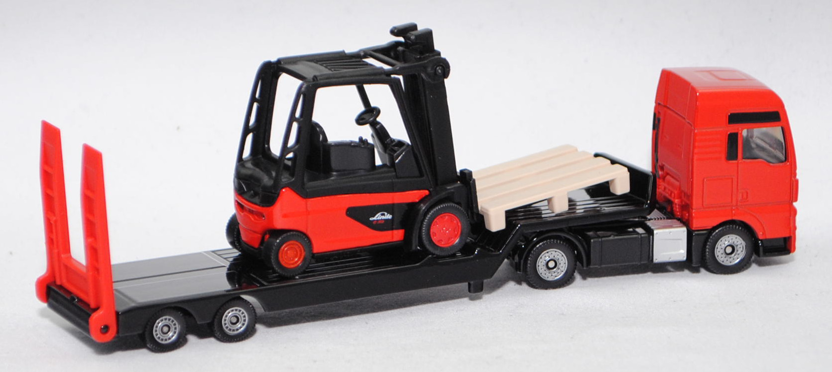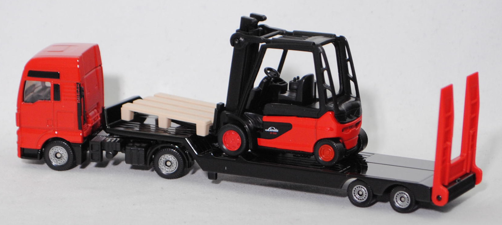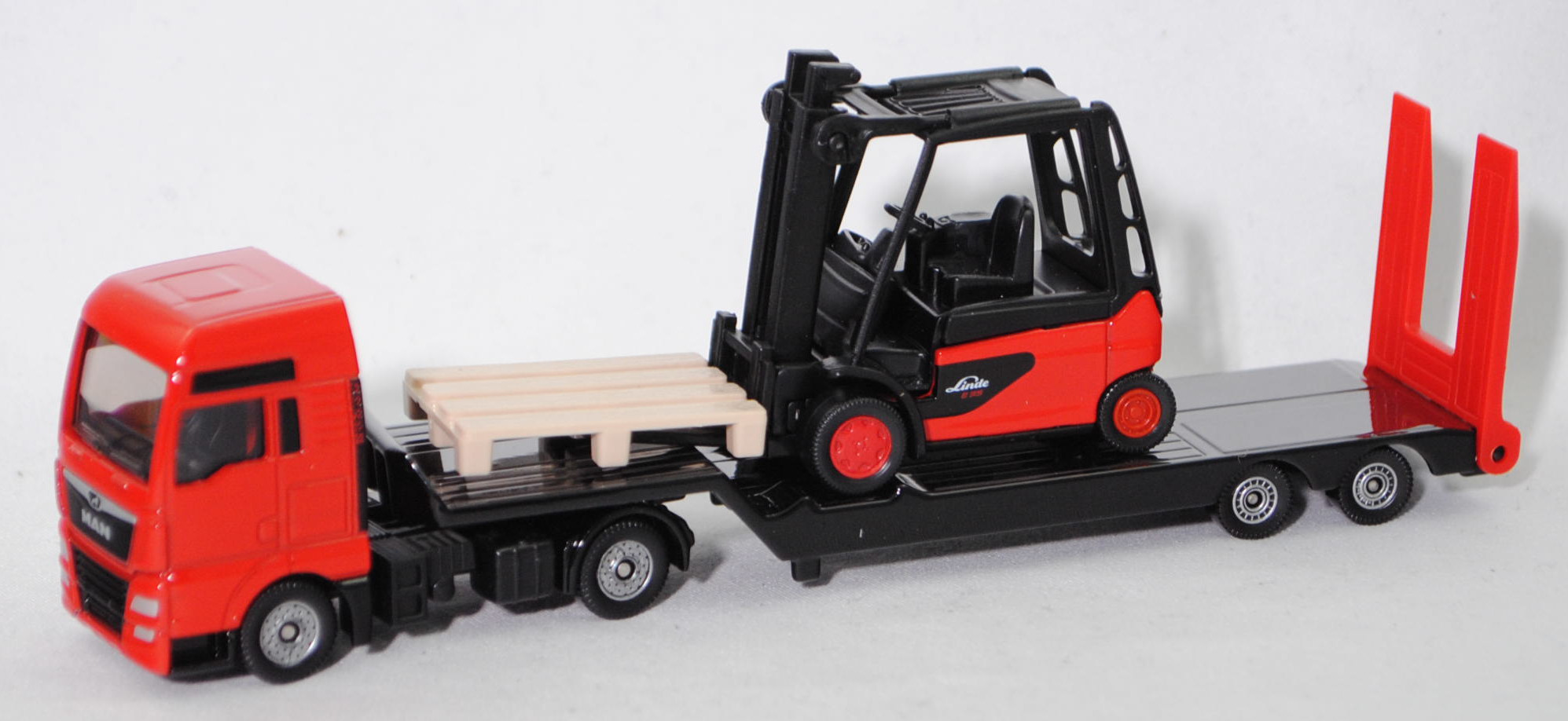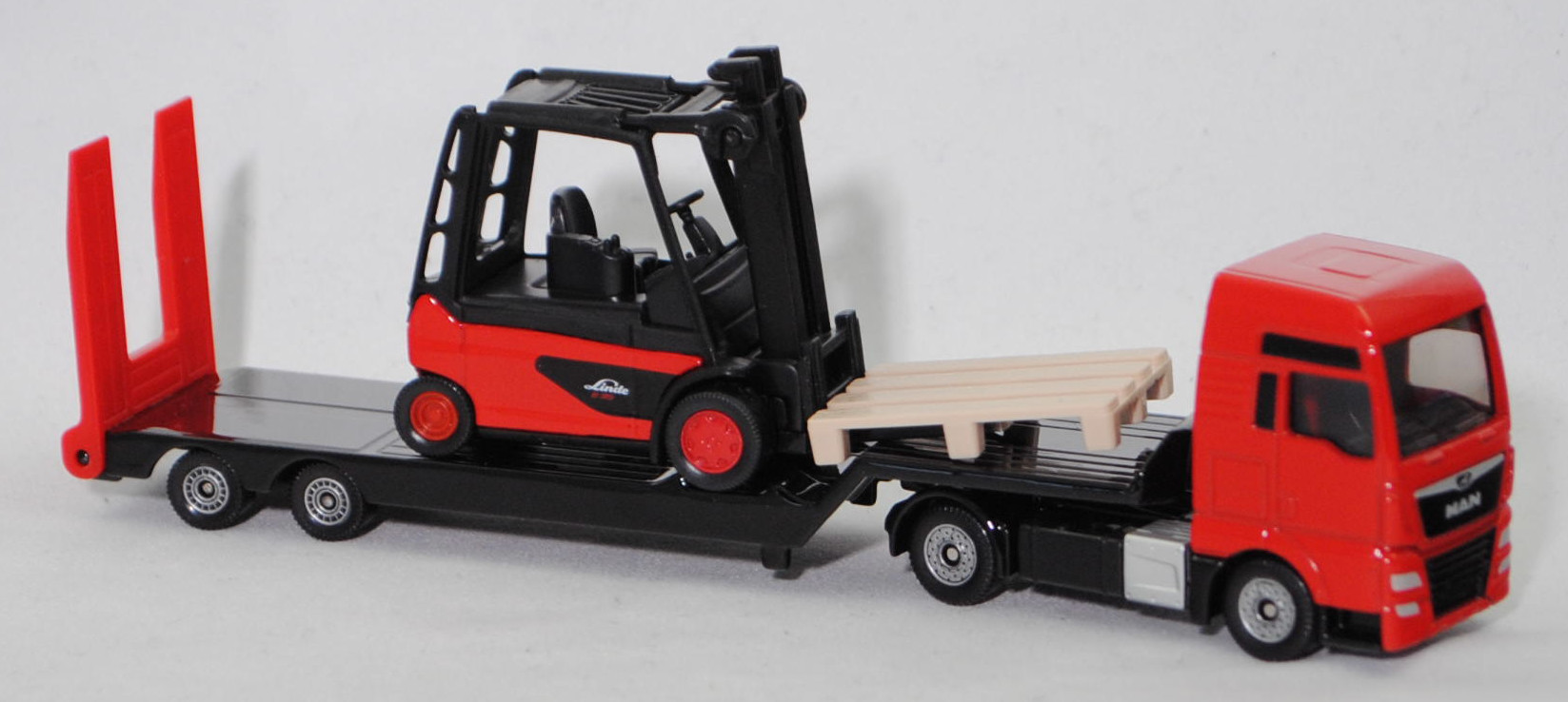 00000 MAN TGX 18.580 D38 XXL 4x2 (1. Generation, Baureihe TGX, Fahrerhaus XXL, Facelift 2017, Fahrerhaus vorne mit Chromspange und Löwe auf schwarzem Grund, 2 zusätzliche Kühlrippen zwischen den Frontscheinwerfern, Hinterradantrieb, Motor: MAN Typ D3876 wassergekühlter Sechszylinder-Reihen-Viertakt-Turbo-Diesel mit Bosch Common-Rail-Hochdruckeinspritzung und eine obenliegende Nockenwelle sowie 4 Ventile pro Zylinder und Ladeluftkühlung sowie 15248 cm³ und 580 PS, Radstand 3600 mm, Länge 5875 mm, Modell 2017-2019) Sattelzugmaschine und 2-Achs-Tiefbett Sattelauflieger mit Nachlaufachsen (Typ Tieflader mit Hochplateau) sowie Linde Elektro-Gegengewichtsstapler E35/600H (4-Rad-Gabelstapler, Baureihe 388, Tragfähigkeit 3,5 t, Hubhöhe 3100 mm, Lastschwerpunkt 600 mm, Eigengewicht inkl. Batterie 6875 kg, Vorderradantrieb, Motoren: wartungsfreie Drehstrom-Antriebsmotoren mit 2x 11,9 kW und wartungsfreier Drehstrom-Hubmotor mit 25 kW, Radstand 1905 mm, Länge Gabelzinken 1000 mm, Länge einschl. Gabelrücken 2712 mm, Gesamtlänge einschl. Gabelzinken 3712 mm, Modell 2011-2017) (vgl. 1311, 4. Ausführung), Sattelzugmaschine: Fahrerhaus und Stoßstange hell-verkehrsrot, innen schwarz, Sitze schwarz, Lenkrad schwarz, LKW-Radkästen schwarz, Chassis schwarz mit Schalldämpfer der Auspuffanlage auf der rechten Seite hinter dem Fahrerhaus in silbergraumetallic und AHK (Anhängerkupplung), Bpr. Adresse hinter der Vorderachse mittig auf dem Chassis, Bpr. CE-Zeichen mittig auf der linken Seite und siku unter der Hinterachse, Druck Chargennummer unter der Vorderachse, C36, ca. 1:88; Sattelauflieger: Tieflader schwarz, Rampe verkehrsrot, Bpr. Adresse auf der linken Seite des Tiefbettes, Bpr. CE-Zeichen mittig auf dem Chassis des Tiefbettes und siku-Logo dahinter, Druck Teil der Chargennummer vorne mittig auf dem Chassis des Tiefbettes, Achshalterungen schwarz, C80 schwarz mit silbernem Druck, ca. 1:87; Ladegut: verkehrsrot/schwarz, Sitz schwarz, Lenkrad schwarz, Schutzkäfig schwarz, Bpr. mit Adresse, Druck Chargennummer auf dem Chassis, B6 karminrot / C9 karminrot (Linde Stahlfelgen vorne Größe 15 Zoll mit Reifen 355/45-15 und hinten Größe 10 Zoll mit Reifen 225/75-10), Zubehör: 1 hell-beige strukturierte Palette, ca. 1:53, SIKU SUPER 1:87, L17mpK (EAN 4006874017638)