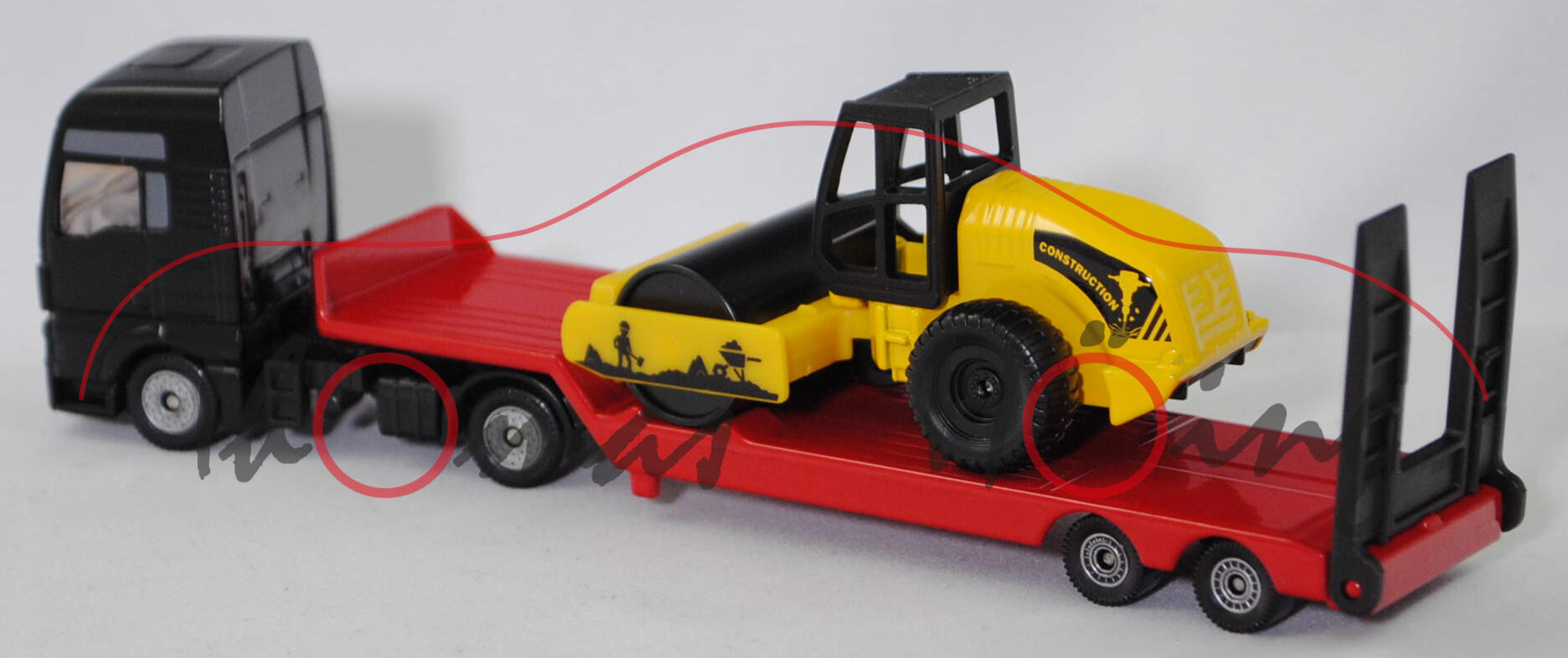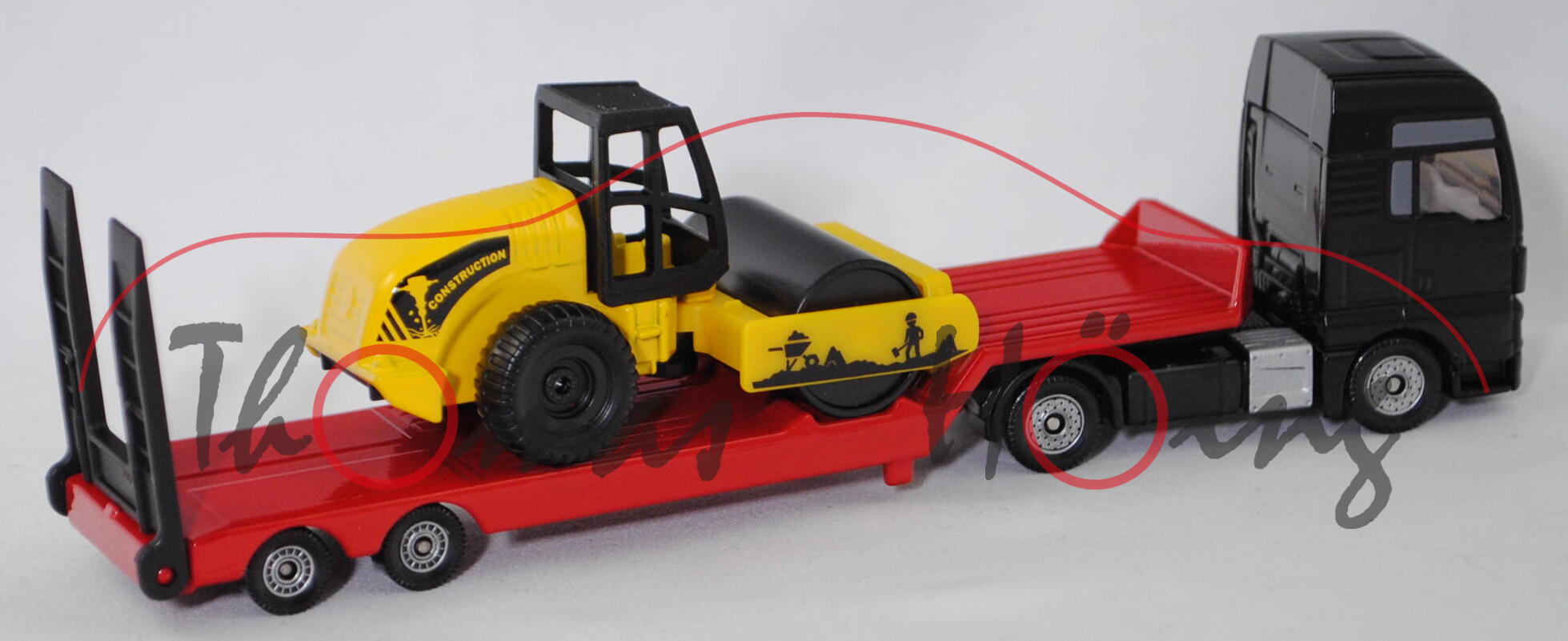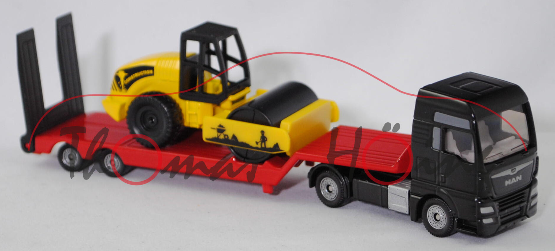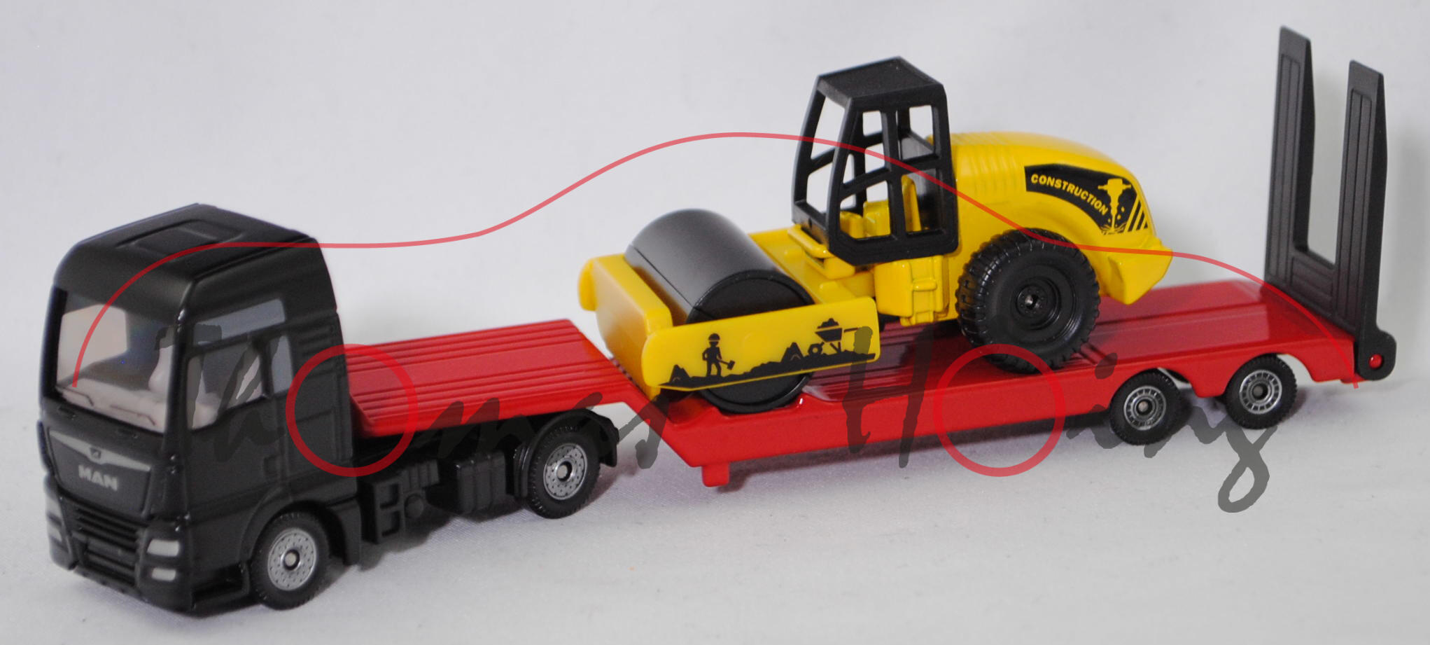 00000 MAN TGX 18.580 D38 XXL 4x2 (1. Generation, Baureihe TGX, Fahrerhaus XXL, Facelift 2017, Fahrerhaus vorne mit Chromspange und Löwe auf schwarzem Grund, 2 zusätzliche Kühlrippen zwischen den Frontscheinwerfern, Hinterradantrieb, Motor: MAN Typ D3876 wassergekühlter Sechszylinder-Reihen-Viertakt-Turbo-Diesel mit Bosch Common-Rail-Hochdruckeinspritzung und eine obenliegende Nockenwelle sowie 4 Ventile pro Zylinder und Ladeluftkühlung sowie 15248 cm³ und 580 PS, Modell 2017-2019) Sattelzugmaschine und 2-Achs-Tiefbett Sattelauflieger mit Nachlaufachsen (Typ Tieflader mit Hochplateau) sowie HAMM 3625 HT Walzenzug mit Vibrationsglattbandage und HAMMTRONIC (Baureihe Serie 3000, Typ Walzenzug, Fahrerkabine ROPS, Eigengewicht 24785 kg, hydrostatischer Allradantrieb, Motor: Deutz BF6M 1013 EC stehender wassergekühlter Sechszylinder-Reihen-Viertakt-Turbo-Diesel mit Direkteinspritzung und eine seitlich obenliegende Nockenwelle mit CIH-Ventilsteuerung (Cam-in-Head = Nockenwelle im Zylinderkopf) und 2 Ventile pro Zylinder sowie Ladeluftkühler und 7145 cm³ sowie 236,7 PS, Achsabstand 3230 mm, Länge 6355 mm, Modell 2000-2007) (Straßenwalze) (vgl. 0895), Sattelzugmaschine: Fahrerhaus und Stoßstange schwarz, innen lichtgrau, Sitze lichtgrau, Lenkrad lichtgrau, LKW-Radkästen schwarz, Chassis schwarz mit Schalldämpfer der Auspuffanlage auf der rechten Seite hinter dem Fahrerhaus in weißaluminiummetallic und AHK (Anhängerkupplung), Bpr. Adresse hinter der Vorderachse mittig auf dem Chassis, Bpr. CE-Zeichen mittig auf der linken Seite und siku unter der Hinterachse, Druck Chargennummer unter der Vorderachse, C36, ca. 1:88; Sattelauflieger: Tieflader karminrot, Rampe schwarz, Bpr. Adresse auf der linken Seite des Tiefbettes, Bpr. CE-Zeichen mittig auf dem Chassis des Tiefbettes und siku-Logo dahinter, Druck Teil der Chargennummer vorne mittig auf dem Chassis des Tiefbettes, Achshalterungen schwarz, C80 schwarz mit silbernem Druck, ca. 1:87; Ladegut: Hinterwagen und Abstreifer verkehrsgelb, Fahrerkabine schwarz ohne Verglasung, Sitz verkehrsgelb, Lenkrad verkehrsgelb, Druck Baustelle mit Arbeiter und Schubkarre in schwarz auf den Seiten des Abstreifers, schwarzer Druck auf den Seiten des Hinterwagens wobei CONSTRUKTION in Wagenfarbe durchschimmert, Vibrationsglattbandage schwarz mit schwarzem Innenteil, C79 schwarz, ca. 1:93, SIKU SUPER 1:87, L17mpK (EAN 4006874017607)