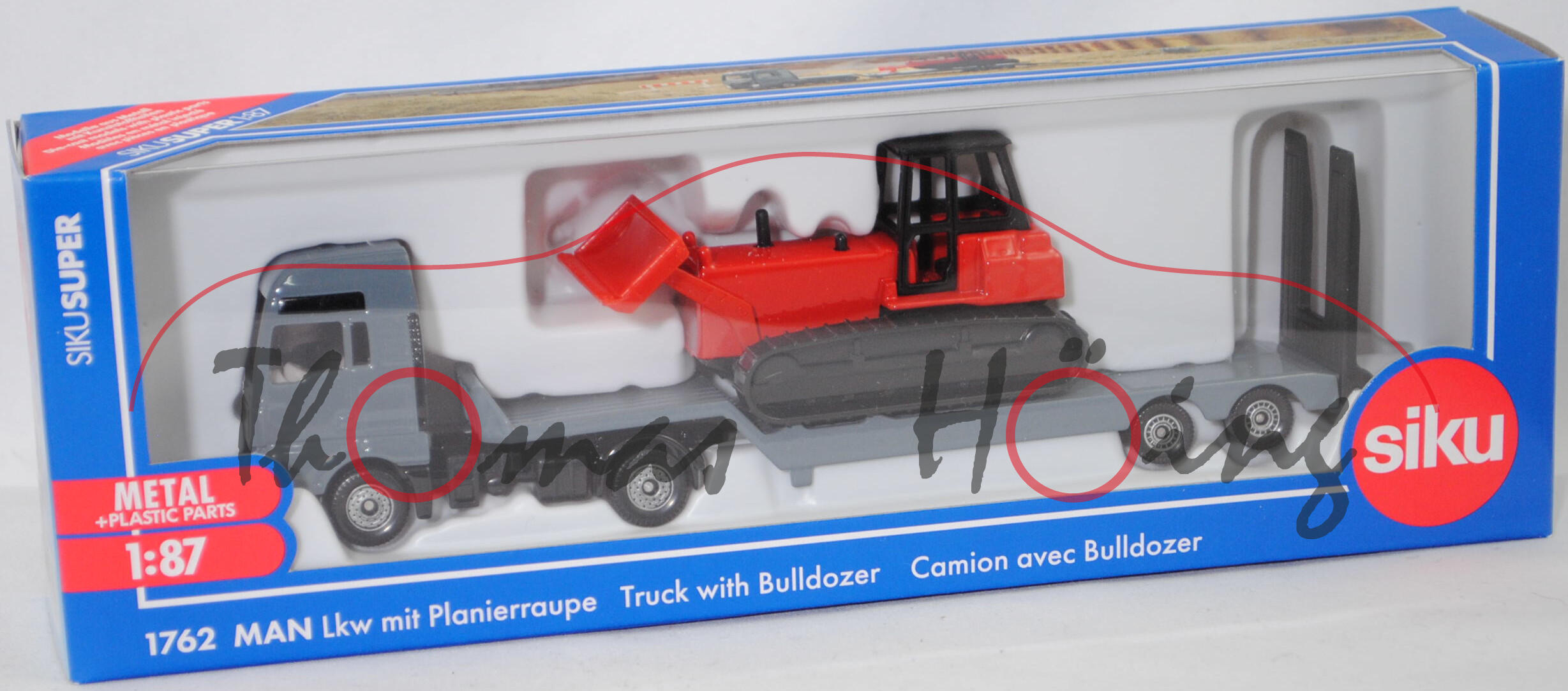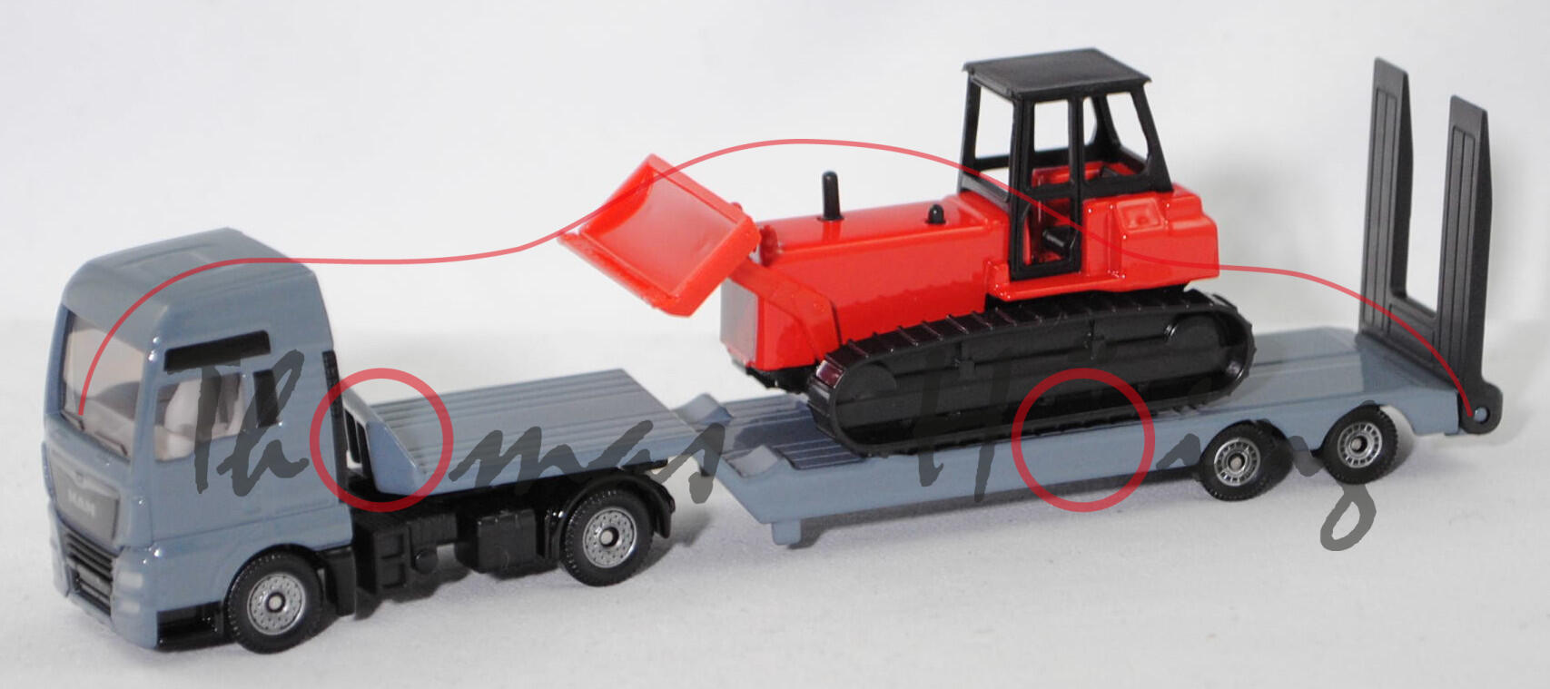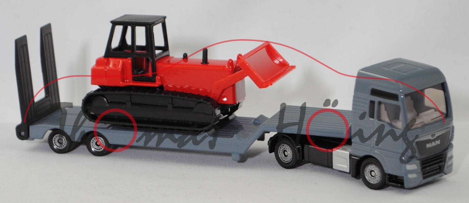 00000 MAN TGX 18.580 D38 XXL 4x2 (1. Generation, Baureihe TGX, Fahrerhaus XXL, Facelift 2017, Fahrerhaus vorne mit Chromspange und Löwe auf schwarzem Grund, 2 zusätzliche Kühlrippen zwischen den Frontscheinwerfern, Hinterradantrieb, Motor: MAN Typ D3876 wassergekühlter Sechszylinder-Reihen-Viertakt-Turbo-Diesel mit Bosch Common-Rail-Hochdruckeinspritzung und eine obenliegende Nockenwelle sowie 4 Ventile pro Zylinder und Ladeluftkühlung sowie 15248 cm³ und 580 PS, Modell 2017-2019) Sattelzugmaschine und 2-Achs-Tiefbett Sattelauflieger mit Nachlaufachsen (Typ Tieflader mit Hochplateau) sowie Planierraupe (vgl. 1295), Sattelzugmaschine: Fahrerhaus und Stoßstange hell-blaugrau, innen lichtgrau, Sitze lichtgrau, Lenkrad lichtgrau, LKW-Radkästen schwarz, Chassis schwarz mit Schalldämpfer der Auspuffanlage auf der rechten Seite hinter dem Fahrerhaus in weißaluminiummetallic und AHK (Anhängerkupplung), Bpr. Adresse hinter der Vorderachse mittig auf dem Chassis, Bpr. CE-Zeichen mittig auf der linken Seite und siku unter der Hinterachse, Druck Chargennummer unter der Vorderachse, C36, ca. 1:88; Sattelauflieger: Tieflader hell-blaugrau, Rampe schwarz, Bpr. Adresse auf der linken Seite des Tiefbettes, Bpr. CE-Zeichen mittig auf dem Chassis des Tiefbettes und siku-Logo dahinter, Druck Teil der Chargennummer vorne mittig auf dem Chassis des Tiefbettes, Achshalterungen schwarz, C80 schwarz mit silbernem Druck, ca. 1:87; Ladegut: Motorhaube und Karosserie verkehrsrot, Sitz schwarz, Auspuff schwarz, Kabine schwarz, Druck Kühlerschutzgritter in schwarz, Schild verkehrsrot, Chassis schwarz, Bpr. Adresse zwischen den Hinterrädern mittig auf dem Chassis, Bpr. siku mittig auf der linken Seite zwischen Vorder- und Hinterrad sowie CE-Zeichen mittig auf der rechten Seite zwischen Vorder- und Hinterrad auf dem Chassis, Druck Chargennummer zwischen den Vorderrädern mittig auf dem Chassis, Raupenfahrwerk mit integrierten Ketten schwarz, SIKU SUPER 1:87, L17mpK (EAN 4006874017621)