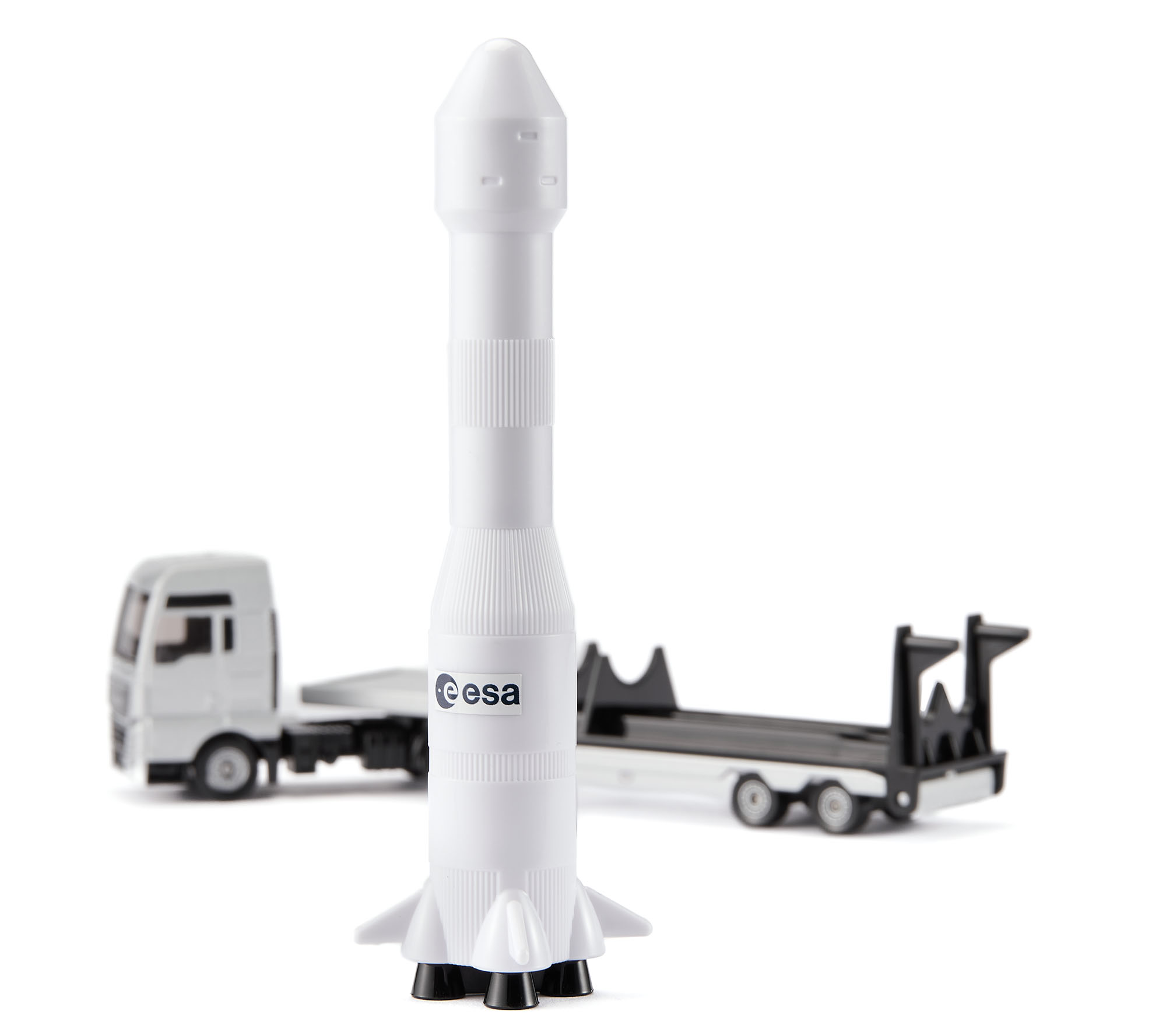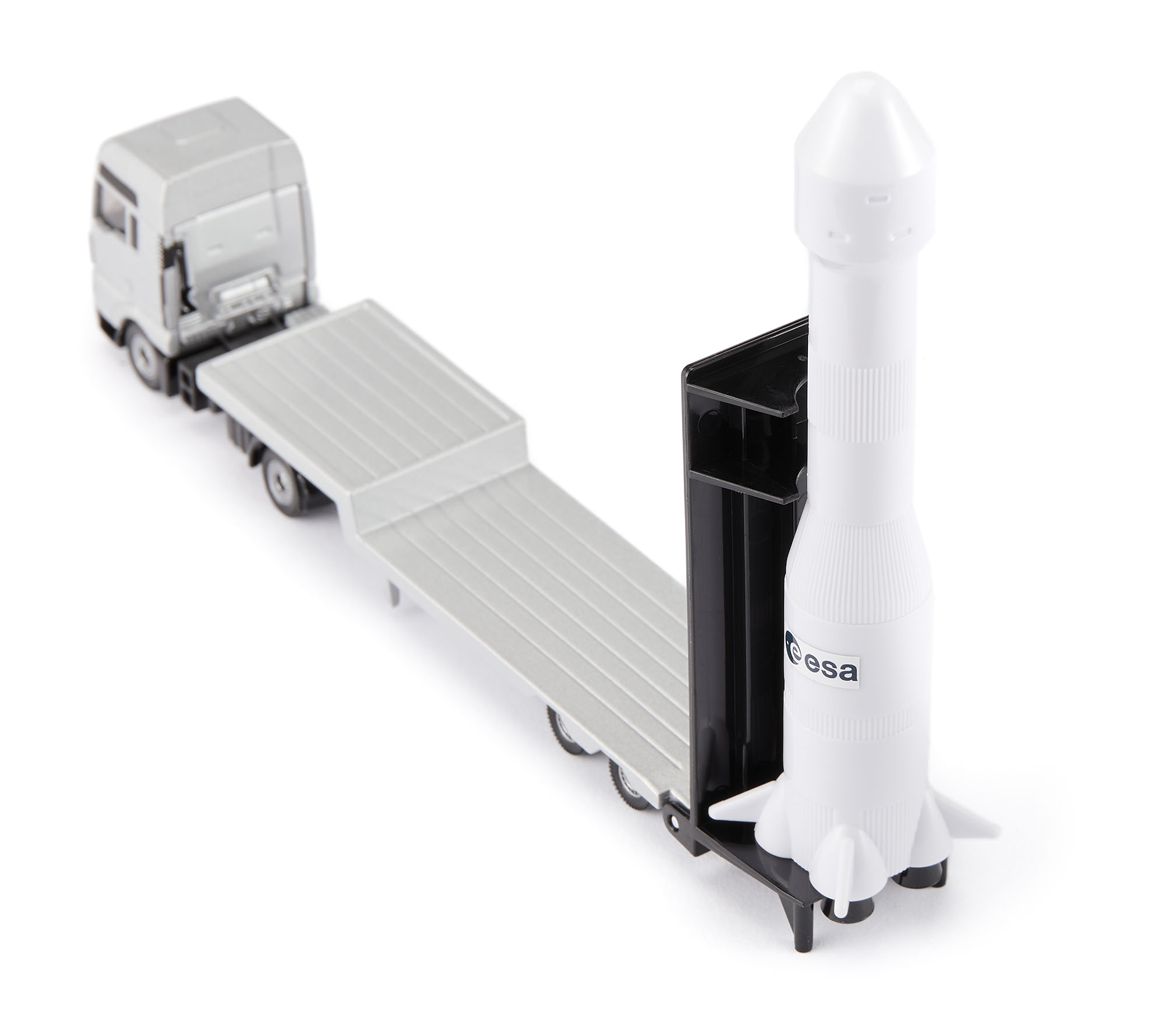 00000 MAN TGX 18.580 D38 XXL 4x2 (1. Generation, Baureihe TGX, Fahrerhaus XXL, Facelift 2017, Fahrerhaus vorne mit Chromspange und Löwe auf schwarzem Grund, 2 zusätzliche Kühlrippen zwischen den Frontscheinwerfern, Hinterradantrieb, Motor: MAN Typ D3876 wassergekühlter Sechszylinder-Reihen-Viertakt-Turbo-Diesel mit Bosch Common-Rail-Hochdruckeinspritzung und eine obenliegende Nockenwelle sowie 4 Ventile pro Zylinder und Ladeluftkühlung sowie 15248 cm³ und 580 PS, Radstand 3600 mm, Länge 5875 mm, Modell 2017-2019) Sattelzugmaschine und 2-Achs-Tiefbett Sattelauflieger mit Nachlaufachsen (Typ Tieflader) und Rakete (Typ ESA Trägerrakete Ariane 40, Modell 22.01.1990 - 03.12.1999), Sattelzugmaschine: Fahrerhaus und Stoßstange silbergraumetallic, innen lichtgrau, Sitze lichtgrau, Lenkrad lichtgrau, LKW-Radkästen schwarz, Chassis schwarz mit Schalldämpfer der Auspuffanlage auf der rechten Seite hinter dem Fahrerhaus in silbergraumetallic und AHK (Anhängerkupplung), Bpr. Adresse hinter der Vorderachse mittig auf dem Chassis, Bpr. CE-Zeichen mittig auf der linken Seite und siku unter der Hinterachse, Druck Chargennummer unter der Vorderachse, C36, ca. 1:88; Sattelauflieger: Tieflader silbergraumetallic, Startrampe schwarz, C2 silber; Ladegut: Rakete reinweiß, Druck 2x esa-Logo und esa in hell-grünblau auf der Rakete, ca. 1:423, SIKU SUPER 1:87, L17mpK (EAN 4006874017584) (ab ca. 1. Halbjahr 2026 lieferbar)