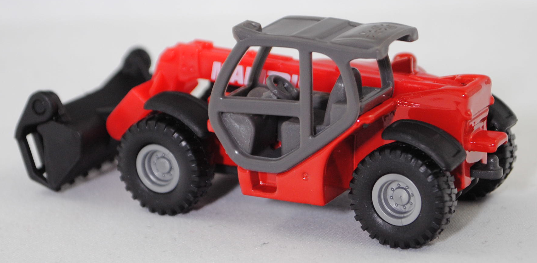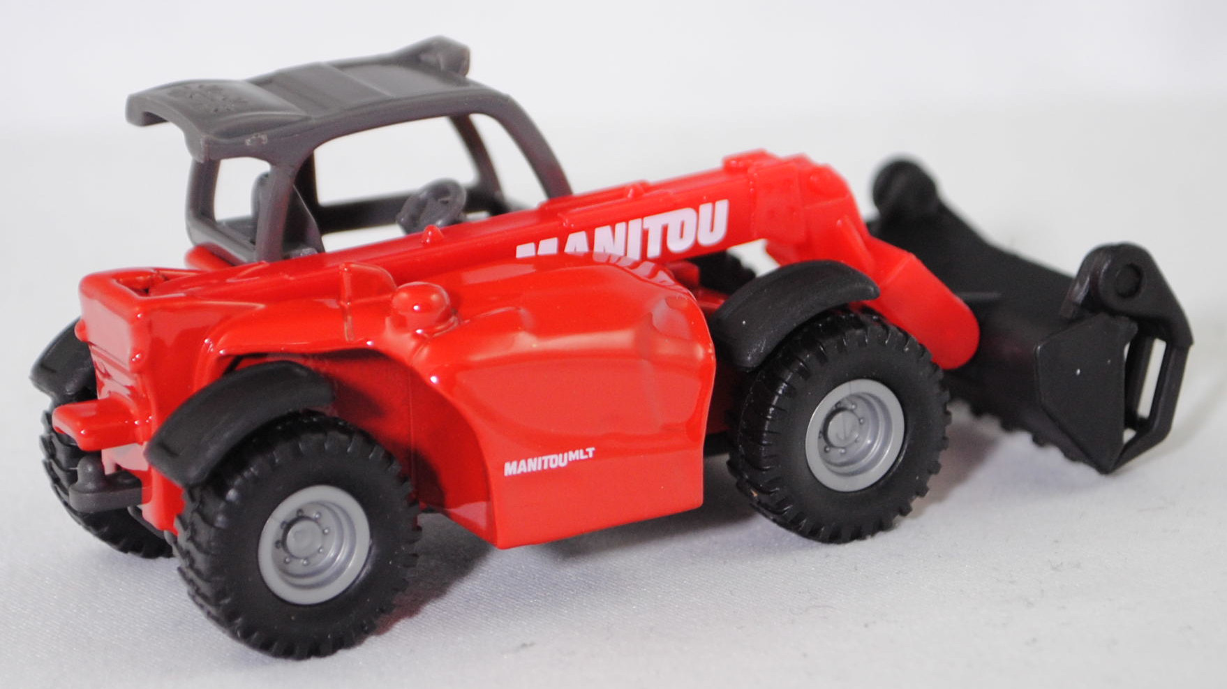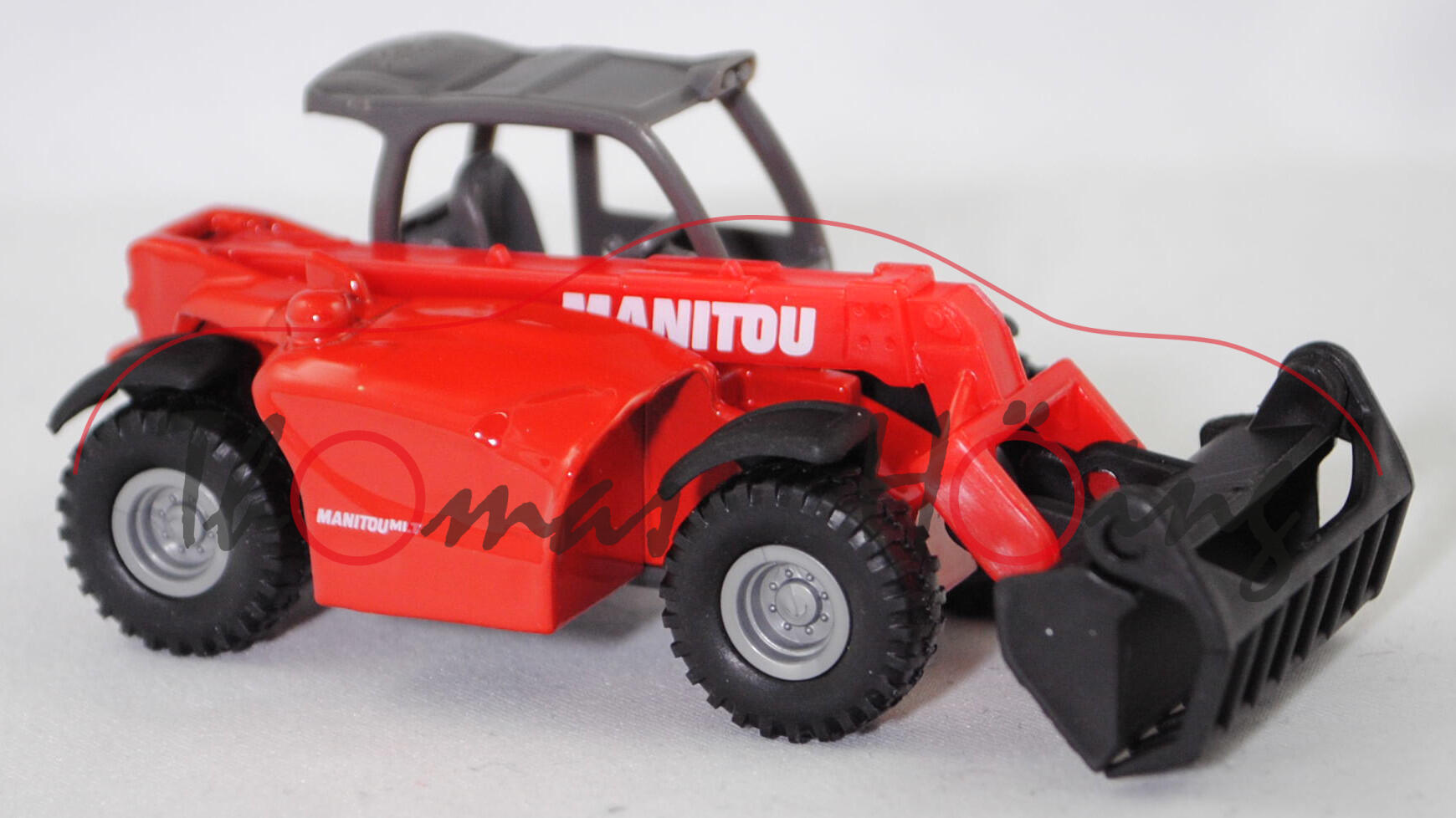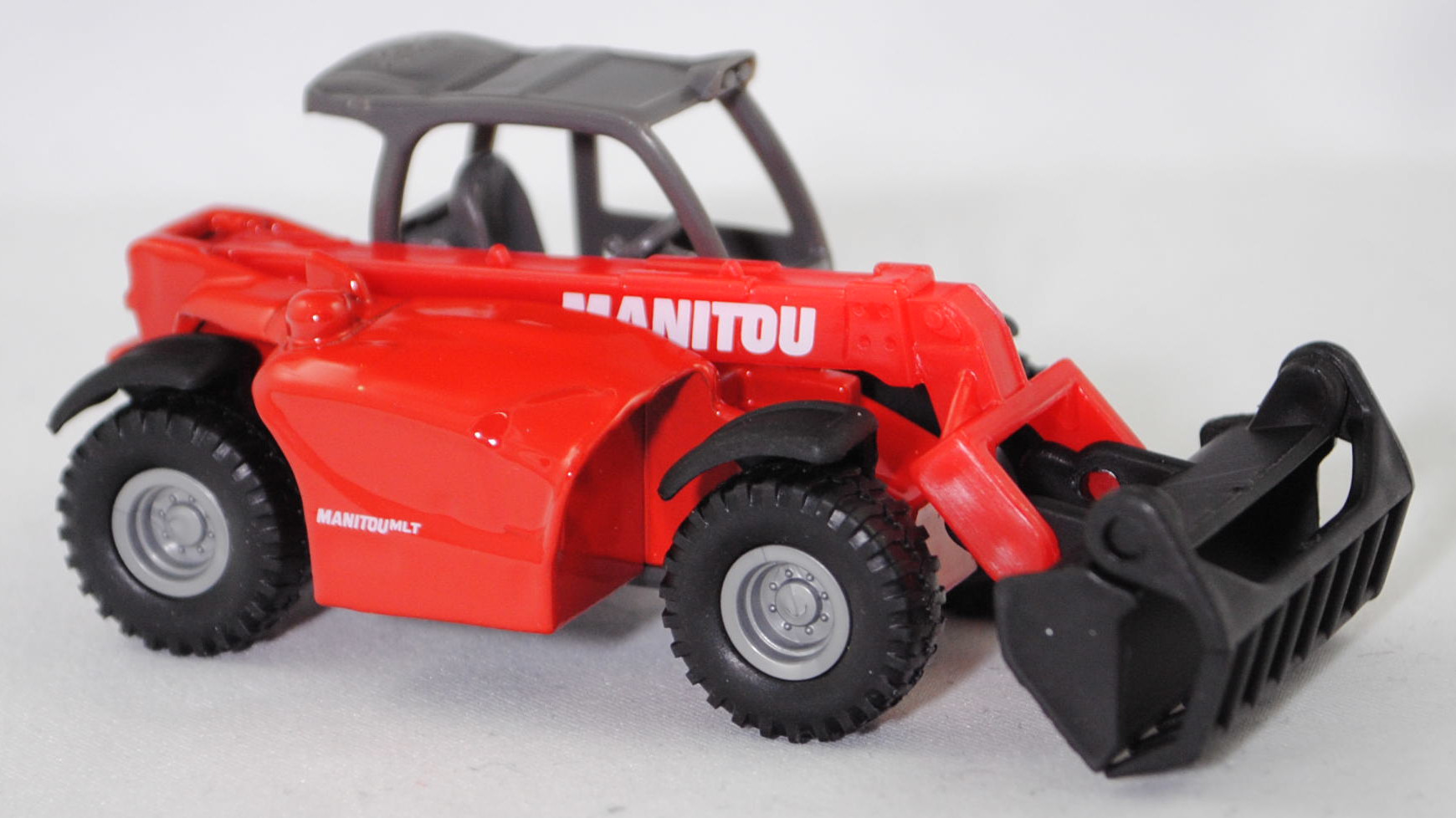 00000 Mantiou MLT Teleskoplader mit Multifunktionsgreifschaufel für die Landwirtschaft (FO), Kabine dunkel-verkehrsgrau, Karosserie und Teleskoparm verkehrsrot, innen dunkel-verkehrsgrau, Sitze dunkel-verkehrsgrau, Lenkrad dunkel-verkehrsgrau, Druck MANITOU in reinweiß auf den Seiten des Teleskoparmes, Druck MANITOU MLT in reinweiß auf der rechten Seite, Multifunktionsgreifschaufel mattschwarz, Kotflügel mattschwarz, Chassis mit Anhängerkupplung (AHK) dunkel-verkehrsgrau, Bpr. mit Adresse mittig auf der rechten Seite, C37b silbergrau, SIKU SUPER, ca. 1:61, P29f (EAN 4006874014828)