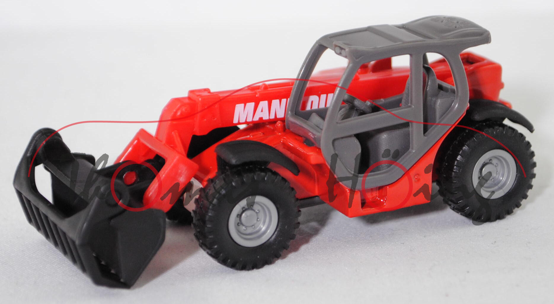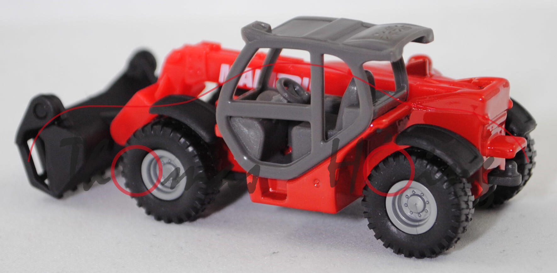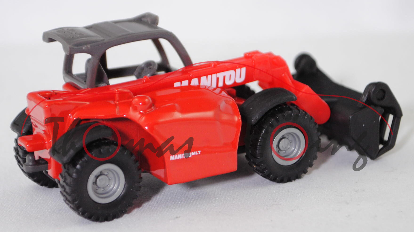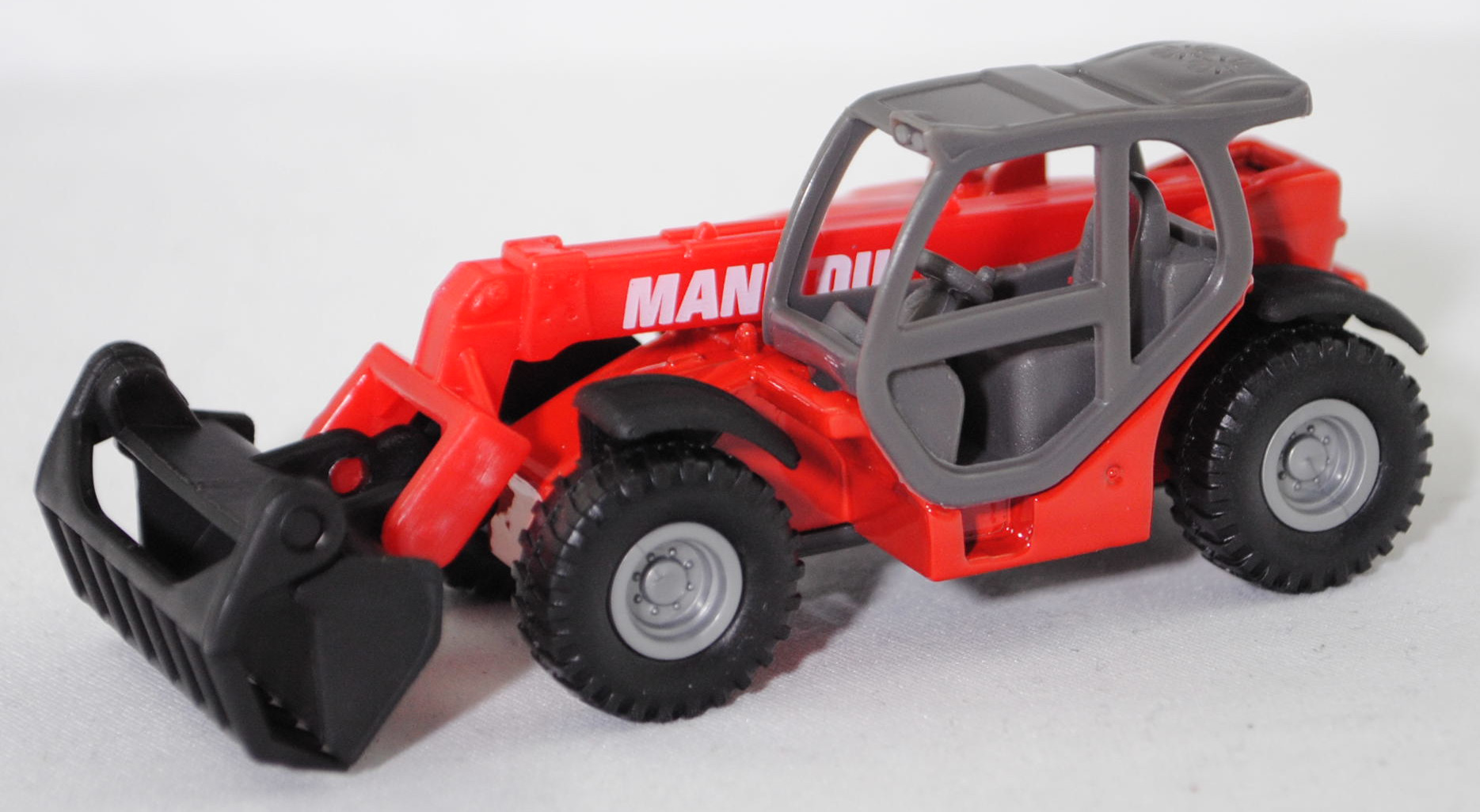 00000 Mantiou MLT Teleskoplader mit Multifunktionsgreifschaufel für die Landwirtschaft (FO), Kabine dunkel-verkehrsgrau, Karosserie und Teleskoparm verkehrsrot, innen dunkel-verkehrsgrau, Sitze dunkel-verkehrsgrau, Lenkrad dunkel-verkehrsgrau, Druck MANITOU in reinweiß auf den Seiten des Teleskoparmes, Druck MANITOU MLT in reinweiß auf der rechten Seite, Multifunktionsgreifschaufel mattschwarz, Kotflügel mattschwarz, Chassis mit Anhängerkupplung (AHK) dunkel-verkehrsgrau, Bpr. mit Adresse mittig auf der rechten Seite, C37b silbergrau, SIKU SUPER, ca. 1:61, P29f (EAN 4006874014828)