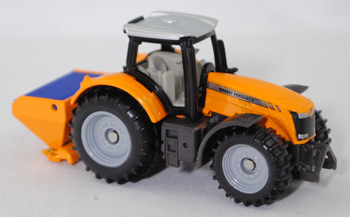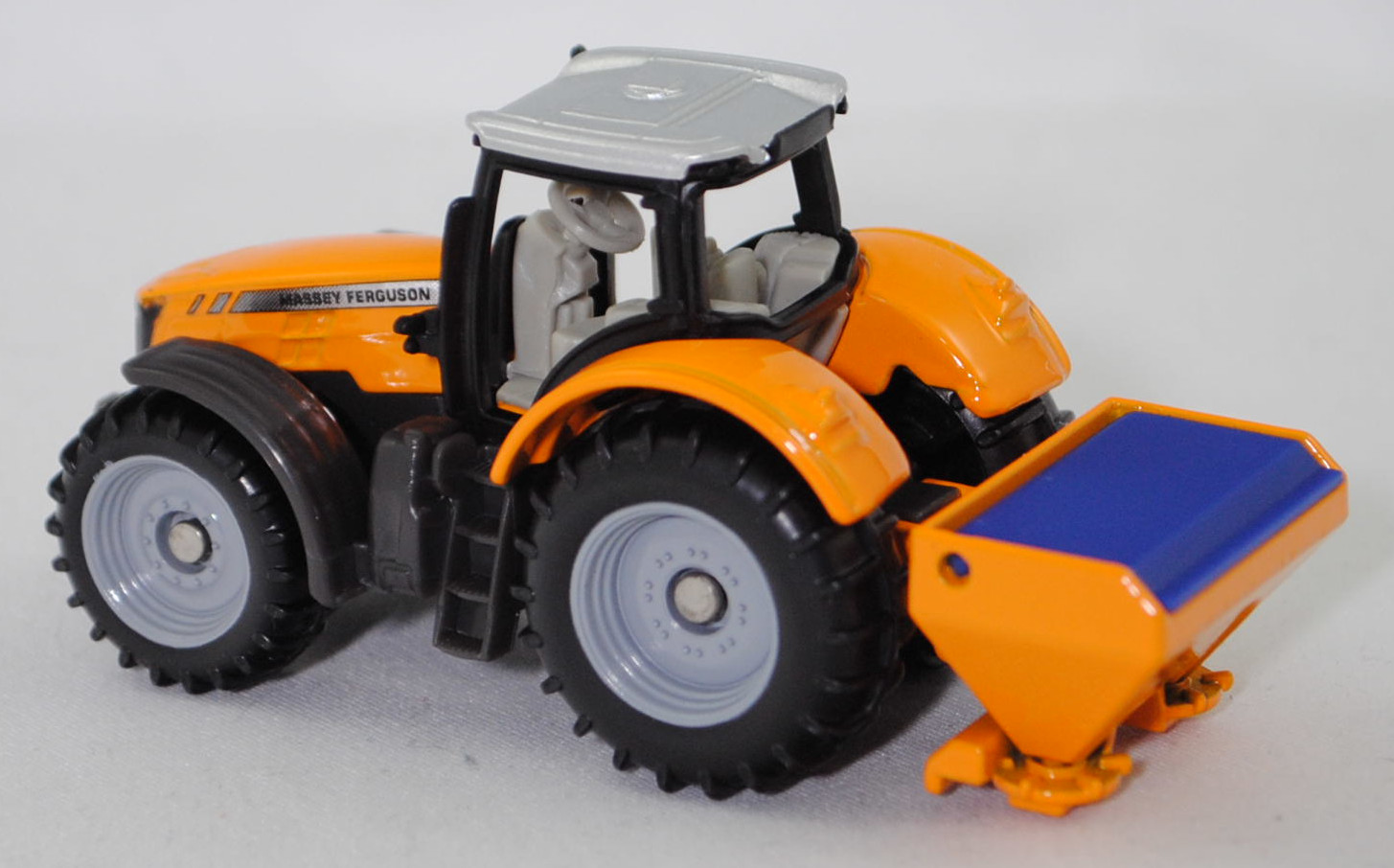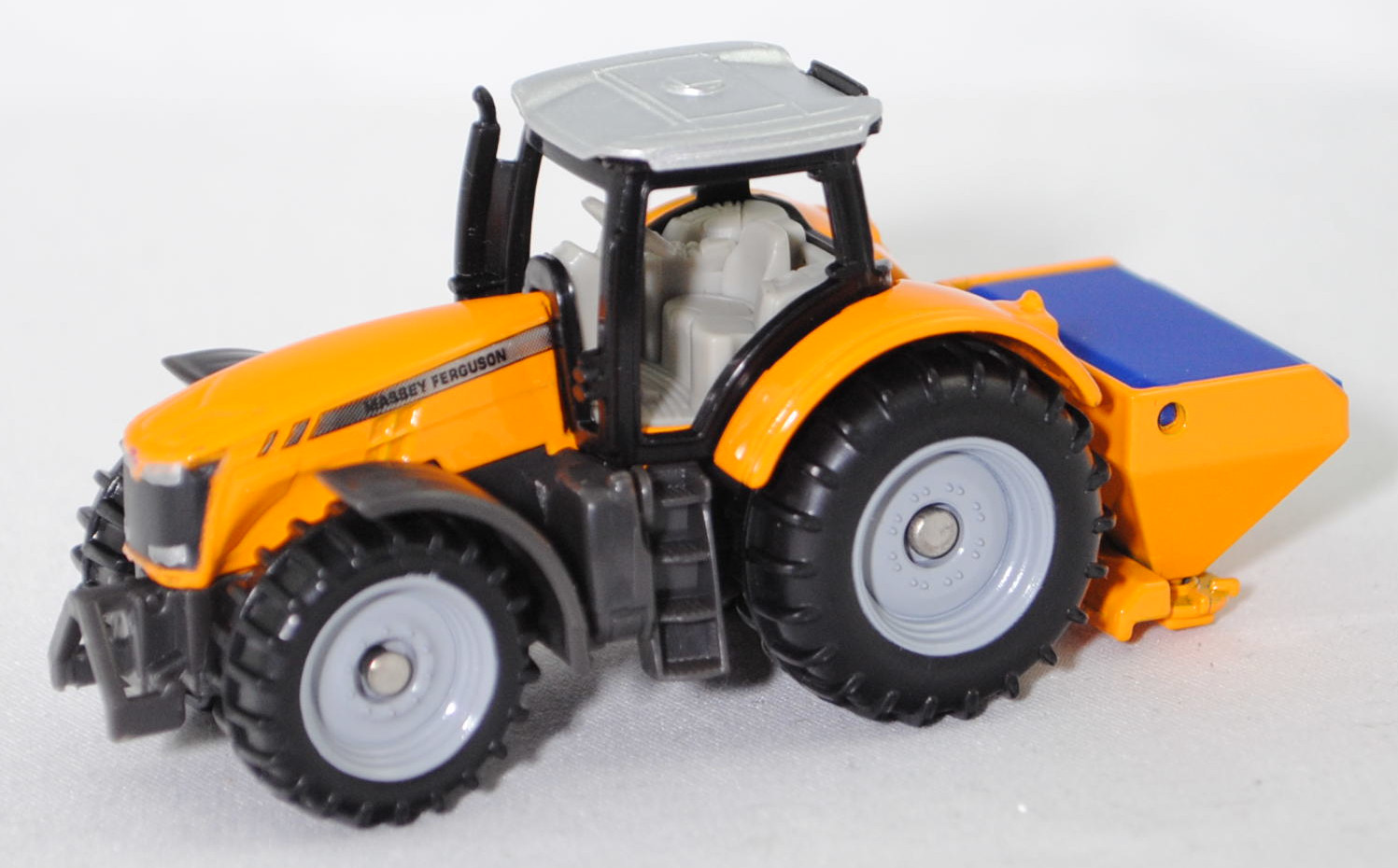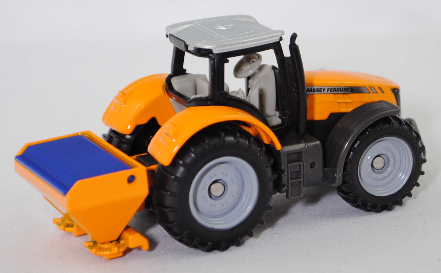 00000 Massey Ferguson MF 8737 Dyna-VT Efficient (1. Generation, Baureihe MF 8700, vier rechteckige Lüftungsschlitze mittig auf den Seiten der Motorhaube, Vorfacelift, Motorhaube seitlich mit zwei kurzen und einem langen Streifen in silber, Typenbezeichnung hinten unter dem Streifen in silber auf den Seiten der Motorhaube, je 4 runde Frontscheinwerfer oben und unten im Kühlergrill, Einsätze für die Frontscheinwerfer mit unterseitiger Ausbuchtung im Bereich der Scheinwerfer, ohne Werkzeugkasten auf dem Tank (linke Seite), Haltebügel auf der linken Seite des Aufstiegs zur Fahrerkabine, Ausstattungsvariante Efficient: PowerControl-Hebel + T-Fahrhebel an der Bedienarmlehne, Zugang zur Fahrerkabine über 4 Stufen, Eigengewicht 10800 kg, zulässiges Gesamtgewicht 18000 kg, stufenloses Dyna-VT Getriebe mit Dynamischen Traktormanagement (DTM), Allradantrieb, Motor: AGCO Power Typ 84AWF-4V wassergekühlter Sechszylinder-Reihen-Viertakt-Diesel mit zweistufigem Turbolader und elektronischem Wastegate Ventil sowie Bosch Common-Rail-Hochdruckeinspritzung und zwei obenliegende Nockenwellen (DOHC = Double Overhead Camshaft) sowie 4 Ventile pro Zylinder und Ladeluftkühler sowie 8400 cm³ und 340 PS (Nennleistung) bzw. 370 PS (Maximalleistung) oder 400 PS (Maximalleistung mit Motor-Power Management EPM (Engine-Power Management)), Radstand 3100 mm, Länge vom Aufnahmerahmen der Frontgewichte bis zu den Unterlenkern am Heckhubwerk 5552 mm, Modell 2014-2017) Traktor mit SCHMIDT® Anbau-Dreipunkt-Streumaschine Traxos (Modell 1996-) (Salzstreuer), Traktor: Motorhaube und Kotflügel hinten dunkel-melonengelb, Dach Fahrerhaus weißaluminiummetallic, Fensterrahmen schwarz, innen grauweiß, Sitz grauweiß, Lenkrad grauweiß, Druck MASSEY FERGUSON in schwarz auf Streifen in silber auf den Seiten der Motorhaube, Frontscheinwerfer silber gedruckt, Kühlergrill schwarz, Druck MASSEY FERGUSON-Logo in silber vorne auf der Motorhaube, Kotflügel vorne dunkel-basaltgrau, Frontkraftheber und Heckkraftheber dunkel-basaltgrau, Chassis dunkel-basaltgrau, C64 / C65 silbergrau (Bereifung vorne 600/65 R 34 und hinten 710/75 R 42), ca. 1:81; Streumaschine: dunkel-melonengelb, Deckel hell-ultramarinblau, Streuteller dunkel-melonengelb, SIKU SUPER, P29f (EAN 4006874015634)