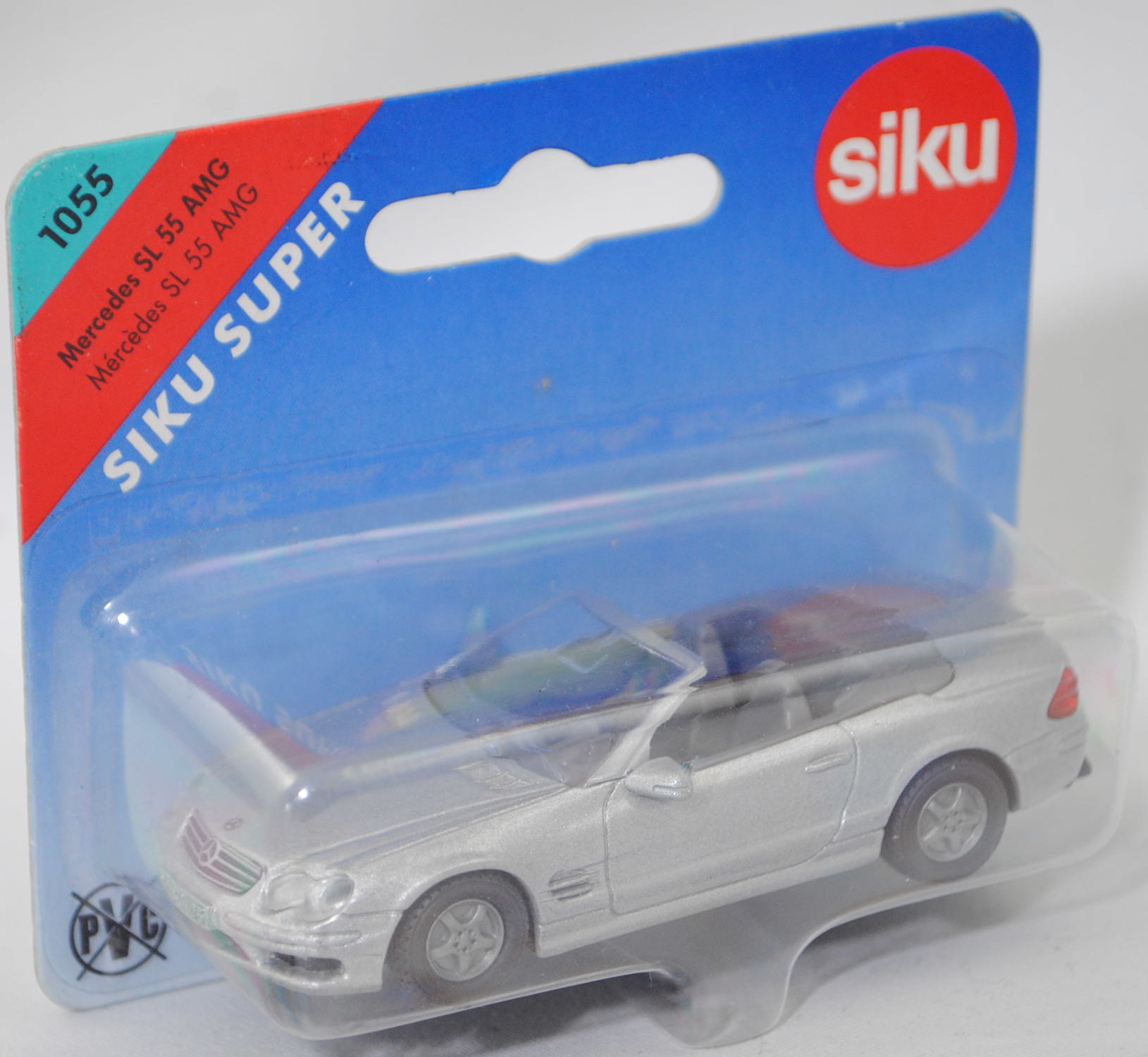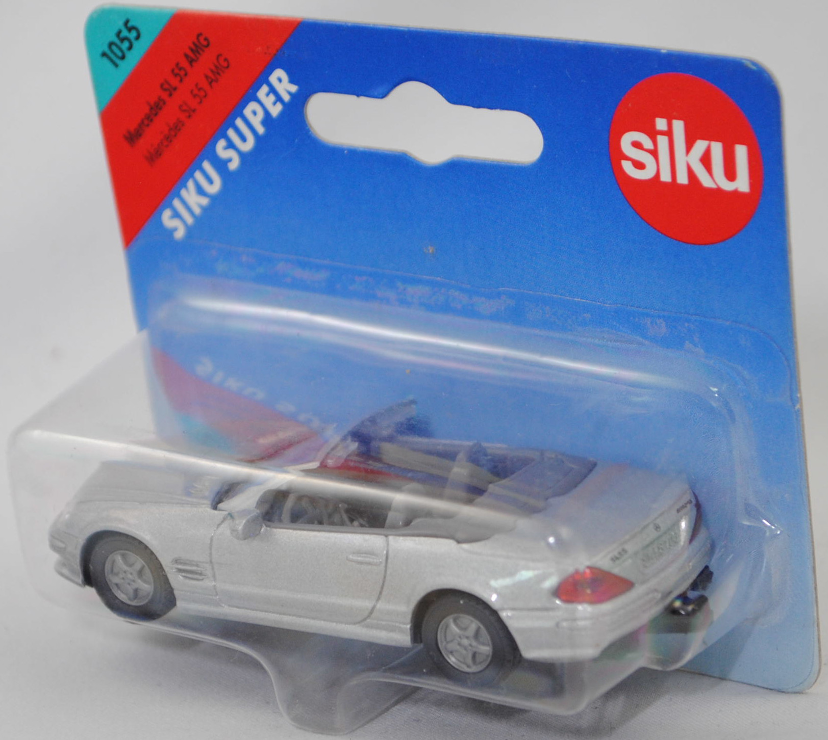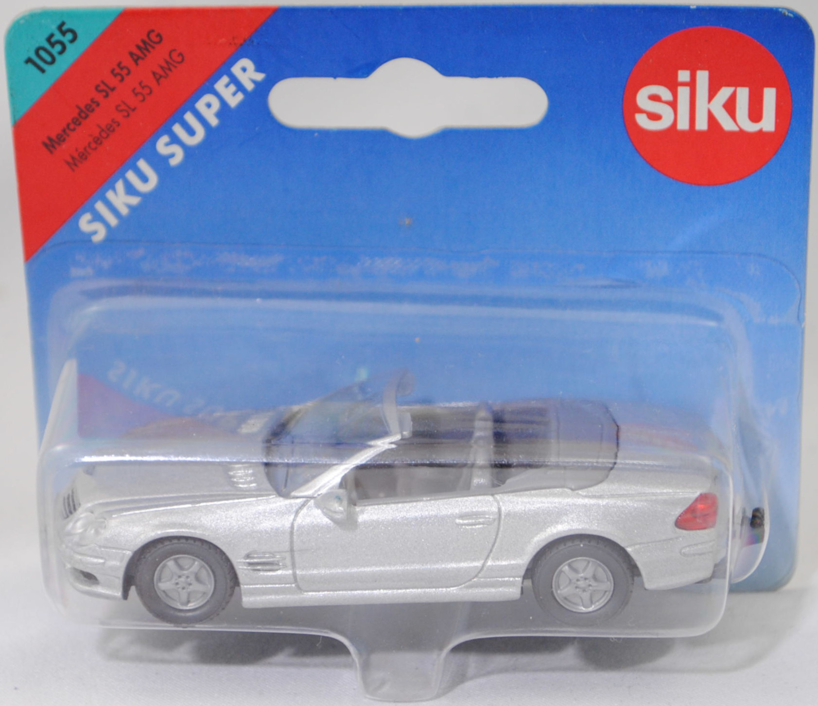 00000 Mercedes-Benz SL 55 AMG (5. Generation SL-Klasse, Baureihe SL-Klasse, interne Baureihenbezeichnung R 230, Konstruktionsbezeichnung R 230 E 55 ML, Baumuster 230.474, zweitüriger Roadster mit 2 Sitzplätzen, Vor-MoPf (vor Modellpflege, Vorfacelift), Kühlergrill mit 4 Lamellen, Nebelscheinwerfer ohne umlaufende Chromringe mittig unter den beiden Frontscheinwerfern platziert, 3. Bremsleuchte in der Heckklappe mit roter Verglasung, Ausstattungslinie SL 55 AMG: Exterieur im AMG Styling + Xenonscheinwerfer + Scheinwerferreinigungsanlage + Nebelscheinwerfer und Nebelschlussleuchte + Außenspiegel links und rechts beheizt, von innen elektrisch einstellbar und in Wagenfarbe lackiert sowie mit asphärisch gewölbtem Spiegelglas, beifahrerseitig mit Einparkstellung + Blinkleuchten in den Außenspiegeln + AMG Kombiinstrument mit 300 km/h Skala + Innen- und Außenspiegel links automatisch abblendbar + Fensterheber elektrisch 2fach mit Komfortbetätigung und Einklemmschutz + Sonnenblenden mit beleuchtetem Spiegel + Handschuhfach belüftet + Wählhebel in Leder + Multifunktionslenkrad in Leder + Lenkradverstellung automatisch bei Ein- und Ausstieg + AMG Sportsitze mit eigenständiger Sitzgrafik sowie Multikonturlehnen mit Memory links/rechts + Sitze mit Lordosenstützen elektrisch verstellbar mit Memory + Sitzheizung + Polsterung Leder mit AMG spezifischer Perforation + Variodach in Wagenfarbe lackiert und elektrohydraulisch mit Fernbedienung bedienbar + Windschott mit Tasche + V8 KOMPRESSOR Schriftzug seitlich an vorderen Kotflügeln + AMG Abgasanlage mit 2 verchromten AMG Doppelendrohren + AMG Sportfahrwerk + AMG Leichtmetallräder im Vielspeichen-Design vorne Größe 8,5 J x 18 mit Breitreifen 255/40 R 18 und hinten Größe 9,5 J x 18 mit Breitreifen 285/35 R 18, AMG SPEEDSHIFT 5-Gang-Automatikgetriebe mit elektronischer Steuerung und Wählhebel in Wagenmitte, Hinterradantrieb, Motor: Mercedes-Benz Typ M 113 E 55 ML AMG stehender wassergekühlter Achtzylinder-V-Viertakt-Otto mit Kompressor-Aufladung und mikroprozessorgesteuerter Einspritzung mit Luftmengenmesser HFM (Heißfilm-Massenmesser) und Bosch ME Motorsteuerung sowie eine obenliegende Nockenwelle (SOHC = Single Overhead Camshaft) je Zylinderbank und 3 V-förmig hängende Ventile pro Zylinder sowie Ladeluftkühlung und 5439 cm³ sowie 476 PS, Motor Baumuster 113.992, Radstand 2560 mm, Länge 4535 mm, Modell 2001-2002), silbergraumetallic (vgl. brillantsilber metallic beim Original, Farbcode 744), innen mausgrau (vgl. graphit beim Original), Sitze mausgrau, Lenkrad mausgrau, separat eingesetzte transparente Frontscheinwerfer, Kühlergrill schwarz mit Druck Mercedes-Benz-Stern und 4 Zierstreifen in silber, Druck Mercedes-Benz-Stern in schwarz auf der Motorhaube, Druck SL 55 und Mercedes-Benz-Stern sowie AMG in schwarz hinten auf der Heckklappe, separat eingesetzte rote Rückleuchten, Chassis schwarz mit Anhängerkupplung (AHK), B13 silbergrau (AMG Leichtmetallräder im 5-Speichen-Design (Ausstattungscode 790) vorne Größe 8,5 J x 18 H2 ET 30 mit Lochkreis 5 x 112 (Teilenummer A 230 401 10 02) und Nabendeckel / Radzierdeckel (Teilenummer A 220 400 01 25, Farbcode 9715 glanzsilber) sowie Reifen 255/40 R 18 95Y bzw. hinten Größe 9,5 J x 18 H2 ET 33 mit Lochkreis 5 x 112 (Teilenummer A 230 401 11 02) und Nabendeckel / Radzierdeckel (Teilenummer A 220 400 01 25, Farbcode 9715 glanzsilber) sowie Reifen 285/35 R 18 97Y), SIKU SUPER, ca. 1:55, P28a (Vitrinenmodell, Schachtel mit Lagerspuren) (EAN 4006874010554)