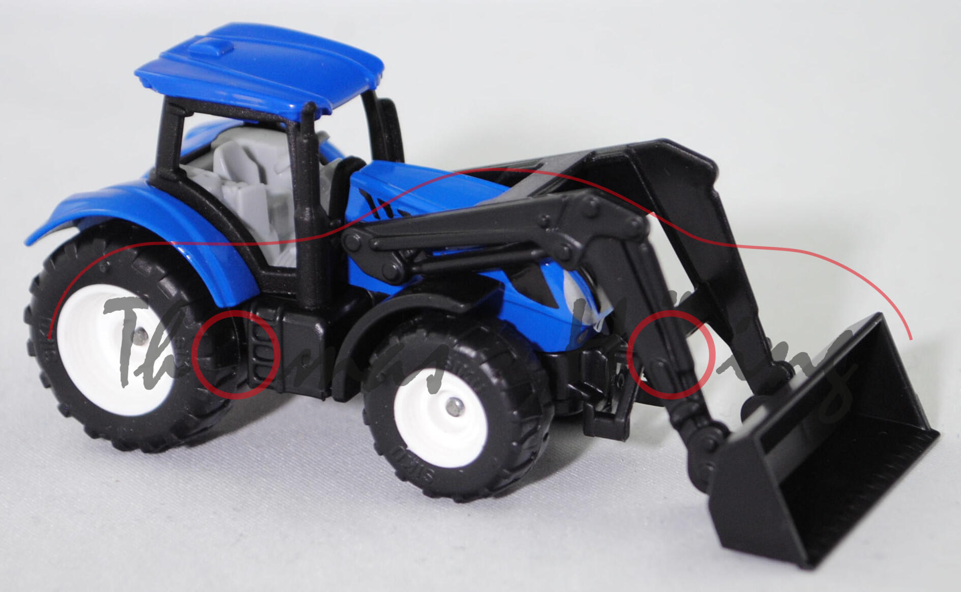 00000 New Holland T7.315 AC (1. Generation, Baureihe T7 Heavy Duty, Facelift 1 von 2015 bzw. Facelift 2 von 2019, Horizon Kabine, Dach der Kabine mittig leicht vertieft, Scheibenwischer oben angeschlagen, Typenbezeichnung auf den Seiten der Motorhaube ohne HD Schriftzug, Kotflügel hinten seitlich mit breitem schwarzen Rand und rückseitig auf halber Höhe geführt, Rückleuchteneinfassung hoch mit großem Abstand nach unten zwischen Rückleuchten und Einfassung, schweres Chassis mit Leergewicht 10500 kg, AC = AutoCommand™-Stufenlosgetriebe, Lenkrad ohne Farbbildschirm, mit PLM (Precision Land Management®) Intelligence, Allradantrieb, Motor: FPT Industrial (Fiat Power Train) Typ NEF (New Engine Family) F4BE06 wassergekühlter Sechszylinder-Reihen-Viertakt-Turbo-Diesel mit Common Rail-Hochdruckeinspritzung und Ladeluftkühlung sowie 6728 cm³ und 300 PS (Nennleistung) bzw. 313 PS (Maximalleistung) (Abgasnorm Tier IV B / Stufe IV, 2015-2018 bzw. Abgasnorm Stufe V, 2019-2021), Radstand 2995 mm, Länge einschl. Front- und Heckhubwerk 5700 mm, Modell 2015-2021) Traktor mit Frontlader, hell-signalblau/schwarz, innen lichtgrau, Sitz lichtgrau, Lenkrad lichtgrau, Motorhaube und Kofflügel hinten hell-signalblau, Dach hell-signalblau, Fensterrahmen schwarz, Kotflügel vorne mattschwarz, Frontlader und Schaufel schwarz, C77 reinweiß / C78 reinweiß (Bereifung vorne 650/60 R34 und hinten 710/75 R 42), SIKU SUPER, ca. 1:79, P29f (EAN 4006874013968)
