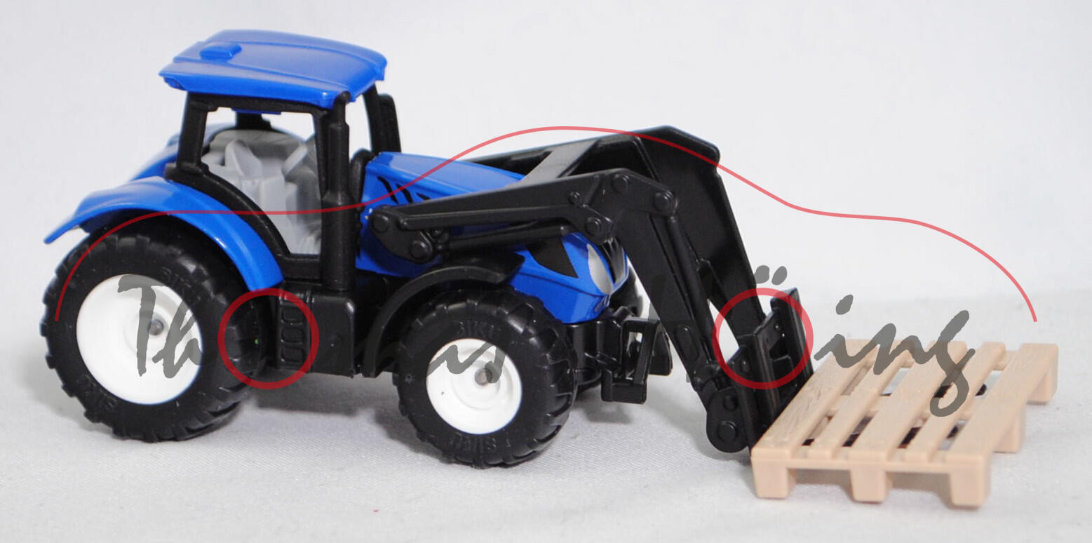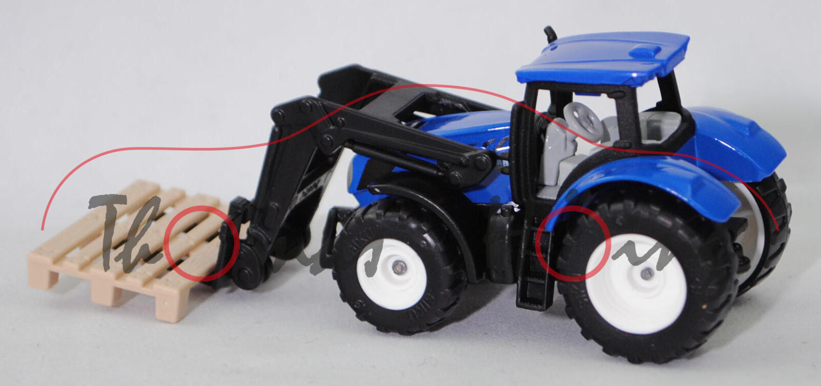 00000 New Holland T7.315 AC (1. Generation, Baureihe T7 Heavy Duty, Facelift 1 von 2015 bzw. Facelift 2 von 2019, Horizon Kabine, Dach der Kabine mittig leicht vertieft, Scheibenwischer oben angeschlagen, Typenbezeichnung auf den Seiten der Motorhaube ohne HD Schriftzug, Kotflügel hinten seitlich mit breitem schwarzen Rand und rückseitig auf halber Höhe geführt, Rückleuchteneinfassung hoch mit großem Abstand nach unten zwischen Rückleuchten und Einfassung, schweres Chassis mit Leergewicht 10500 kg, AC = AutoCommand™-Stufenlosgetriebe, Lenkrad ohne Farbbildschirm, mit PLM (Precision Land Management®) Intelligence, Allradantrieb, Motor: FPT Industrial (Fiat Power Train) Typ NEF (New Engine Family) F4BE06 wassergekühlter Sechszylinder-Reihen-Viertakt-Turbo-Diesel mit Common Rail-Hochdruckeinspritzung und Ladeluftkühlung sowie 6728 cm³ und 300 PS (Nennleistung) bzw. 313 PS (Maximalleistung) (Abgasnorm Tier IV B / Stufe IV, 2015-2018 bzw. Abgasnorm Stufe V, 2019-2021), Radstand 2995 mm, Länge einschl. Front- und Heckhubwerk 5700 mm, Modell 2015-2021) Traktor mit Frontlader und Palettengabel sowie Palette, hell-signalblau/schwarz, innen lichtgrau, Sitz lichtgrau, Lenkrad lichtgrau, Motorhaube und Kofflügel hinten hell-signalblau, Dach hell-signalblau, Fensterrahmen schwarz, Frontlader und Palettengabel schwarz, Kotflügel vorne mattschwarz, C77 reinweiß / C78 reinweiß (Bereifung vorne 650/60 R34 und hinten 710/75 R 42), Zubehör: 1 hell-beige Palette, SIKU SUPER, ca. 1:79, P29f (EAN 4006874015443)