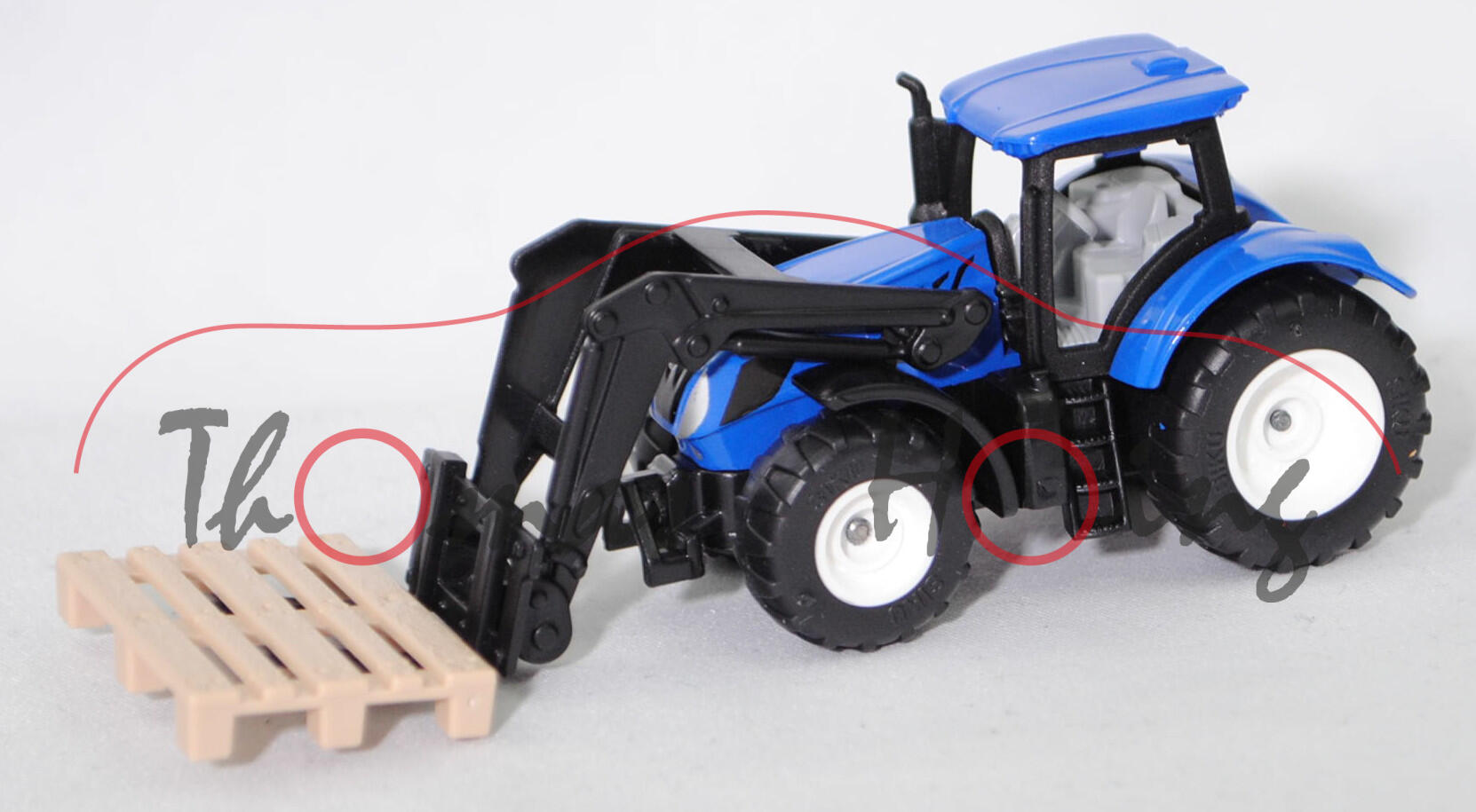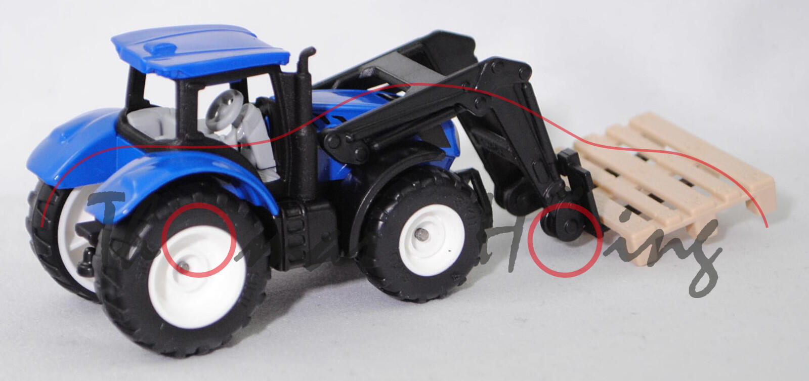 00000 New Holland T7.315 AC (Modell 2015-2021) mit Frontlader und Palettengabel sowie Palette, hell-signalblau/schwarz, Zubehör: 1 hell-beige Palette, SIKU, 1:79, P29f