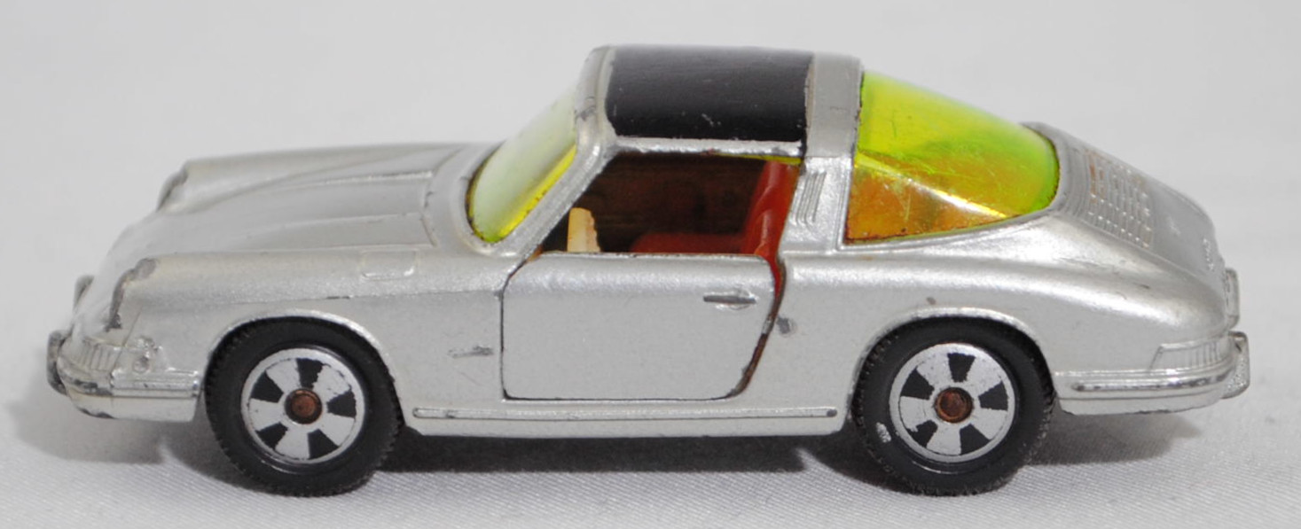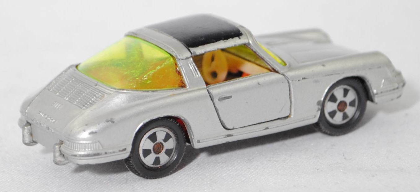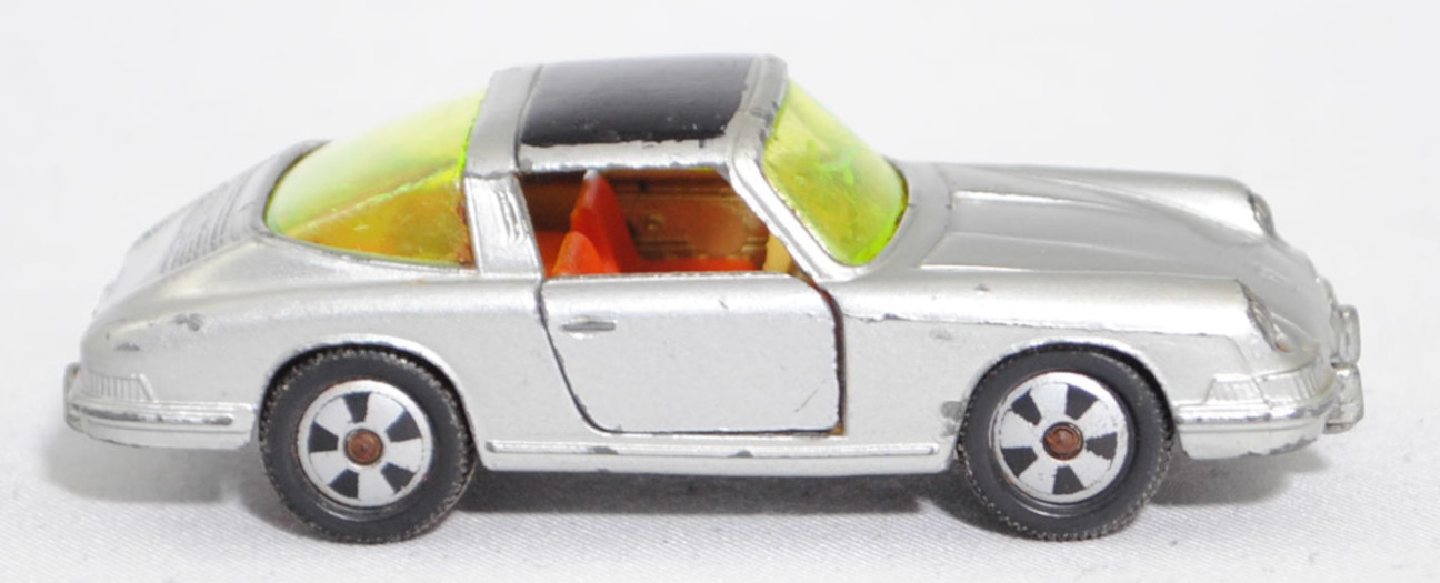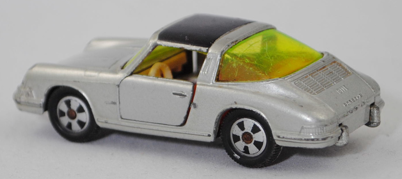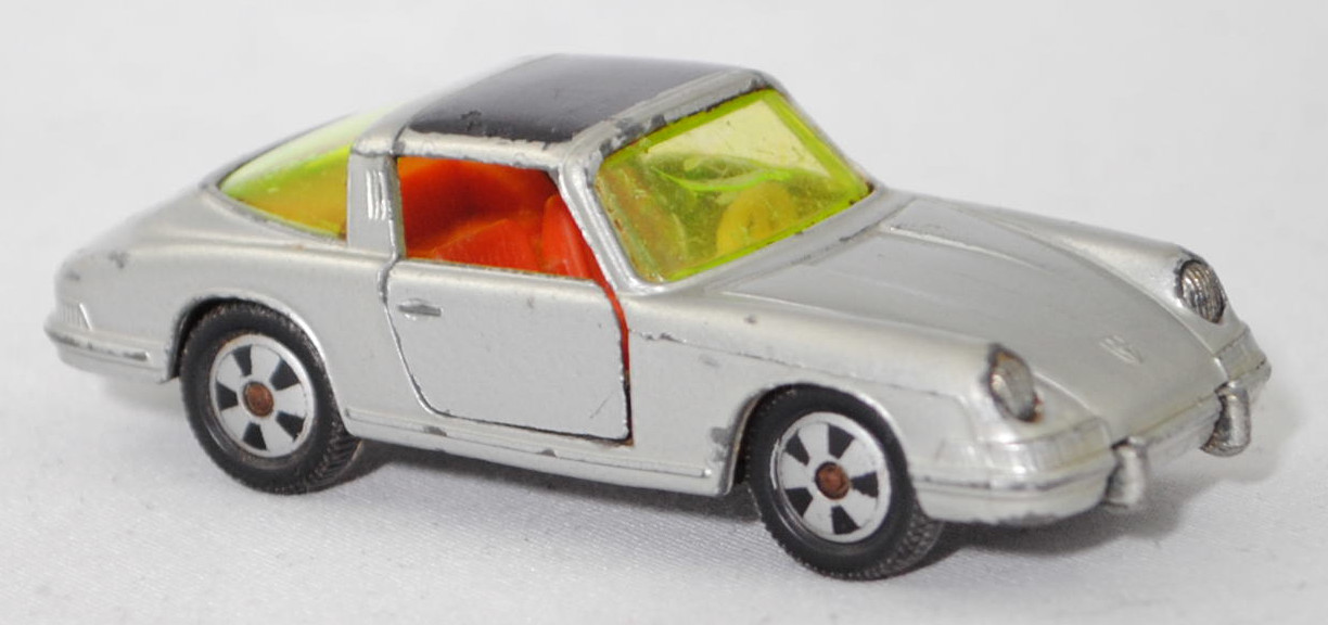 00000 Porsche 911 E Targa (1. Generation Porsche 911, Baureihe 911, interne Baureihenbezeichnung F-Modell bzw. Urmodell (auch Neunelfer oder Elfer genannt), B-Serie, zweitüriger Sportwagen als Coupé mit herausnehmbarem Dachteil und 4 Sitzplätzen, herausgezogene Radläufe, Verlängerung des Radstandes um 57 mm, festeingebaute und beheizbare Heckscheibe aus Sicherheitsglas, seitliche Lüftungsschlitze im Edelstahlbügel, Typenzeichen und PORSCHE-Schriftzug in gold auf der Motorhaube, Ausstattungslinie 911 E Targa: starke Profilgummileisten zum Schutz der Stoßfänger gegen Beschädigung beim Rangieren und Parken + Stoßfängerzwischenteil aus Leichtmetall + oben und unten gepolstertes blendfreies Armaturenbrett + zwei gepolsterte Sonnenblenden, seitlich nicht schwenkbar + Make-up-Spiegel in Beifahrersonnenblende + abblendbarer Innenspiegel an Frontscheibe befestigt + Handschuhkastenklappe mit Magnetverschluss, abschließbar + Schalttafelblende in Kunstleder + Ausstellfenster vorne + Scheibenwischer mit Intervallschaltung + verstellbare Vordersitze als Liegesitze verwendbar + Türtafel in Kunstleder mit Flechtnarbung und Armstütze sowie gleichzeitig Zuziehgriff + 2 Ablagefächer an den Türtafeln + Haltegriff für Beifahrer an der Türinnenseite + 2 Hecksitze umklappbar als Gepäckablage verwendbar + zugfreie Entlüftung des Fahrgastraumes durch Schlitze im Sicherheitsbügel + zweistufig beheizbare feste Heckscheibe getönt + Trittbrettleiste Aluminium + Chromblende unterhalb der Türen + Verschlussdeckel für Benzineinfüllstutzen nur vom Fahrgastraum zu öffnen + Vorderhaubenzug abschließbar + Typenzeichen und PORSCHE-Schriftzug auf Motorhaube goldfarben + herausnehmbares Dachteil + Porsche Motor mit 1991 cm³ und 140 PS, Porsche sperrsynchronisiertes 5-Gang-Schaltgetriebe mit Knüppelschaltung, Heckantrieb, Motor: Porsche Typ 901.09 luftgekühlter Sechszylinder-Boxer-Viertakt-Otto mit Bosch Saugrohreinspritzung und eine obenliegende Nockenwelle (OHC = Overhead Camshaft) sowie 2 V-förmig hängende Ventile pro Zylinder und 1991 cm³ sowie 140 PS, Radstand 2268 mm, Länge 4163 mm, Modell 1968-1969), silbergraumetallic, innen rotorange, Lenkrad cremeweiß, Dach schwarz, Bpr. V234, Germ, Verglasung gelbgrün, R9 (Porsche geschmiedete Leichtmetallfelgen (Hersteller: Otto Fuchs KG Derschlager Straße 26 58540 Meinerzhagen) Größe 6 J x 15 ET 36 mit Lochkreis 5 x 130 (Teilenummer 901 361 020 00) und Nabendeckel / Radzierdeckel (Teilenummer 901 361 032 00) sowie Reifen 185/70 VR 15), SIKU SUPER, ca. 1:60, m- (Vitrinenmodell, Windschutzscheibe mit Sprung, minimale Lackfehler) (EAN 4006874010103)
