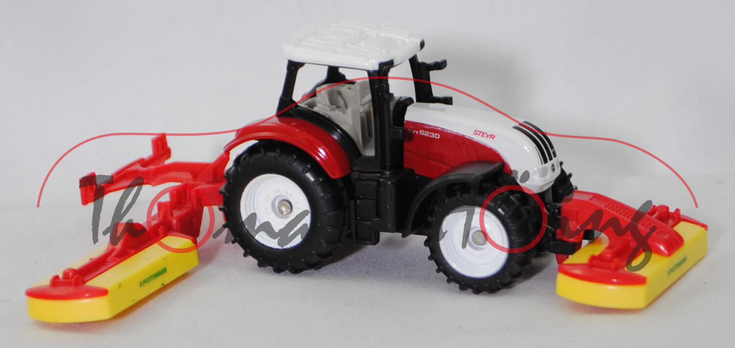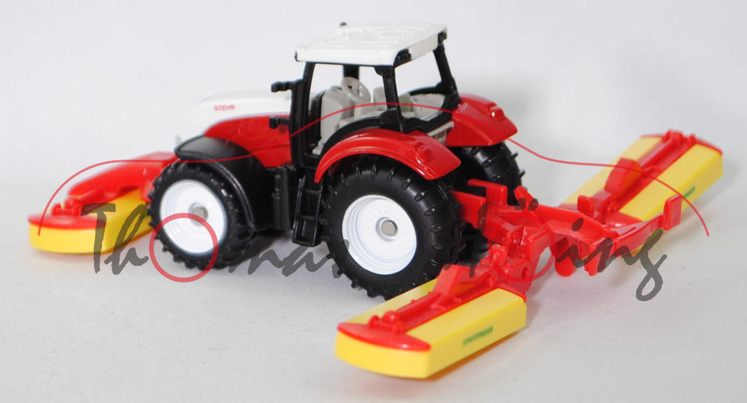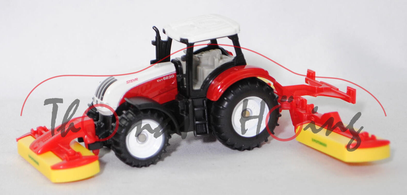 00000 Steyr 6230 CVT ecotech (Modell 2011-2015) mit PÖTTINGER Scheibenmäher-Kombination NOVACAT V10 (Modell 2008-2016), weiß/rot + rot/gelb, SIKU SUPER, P29f