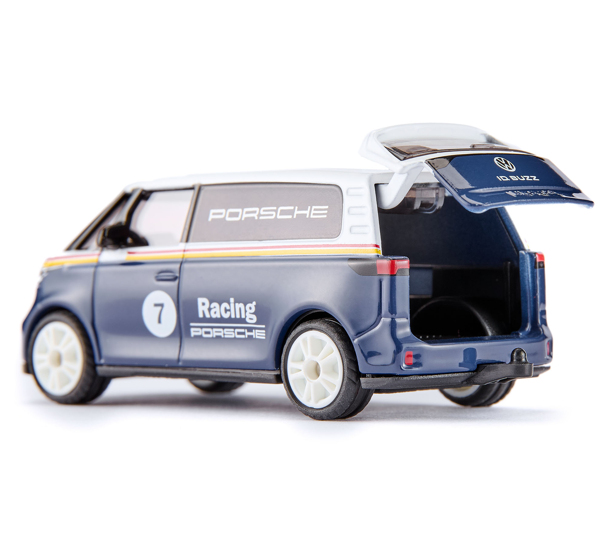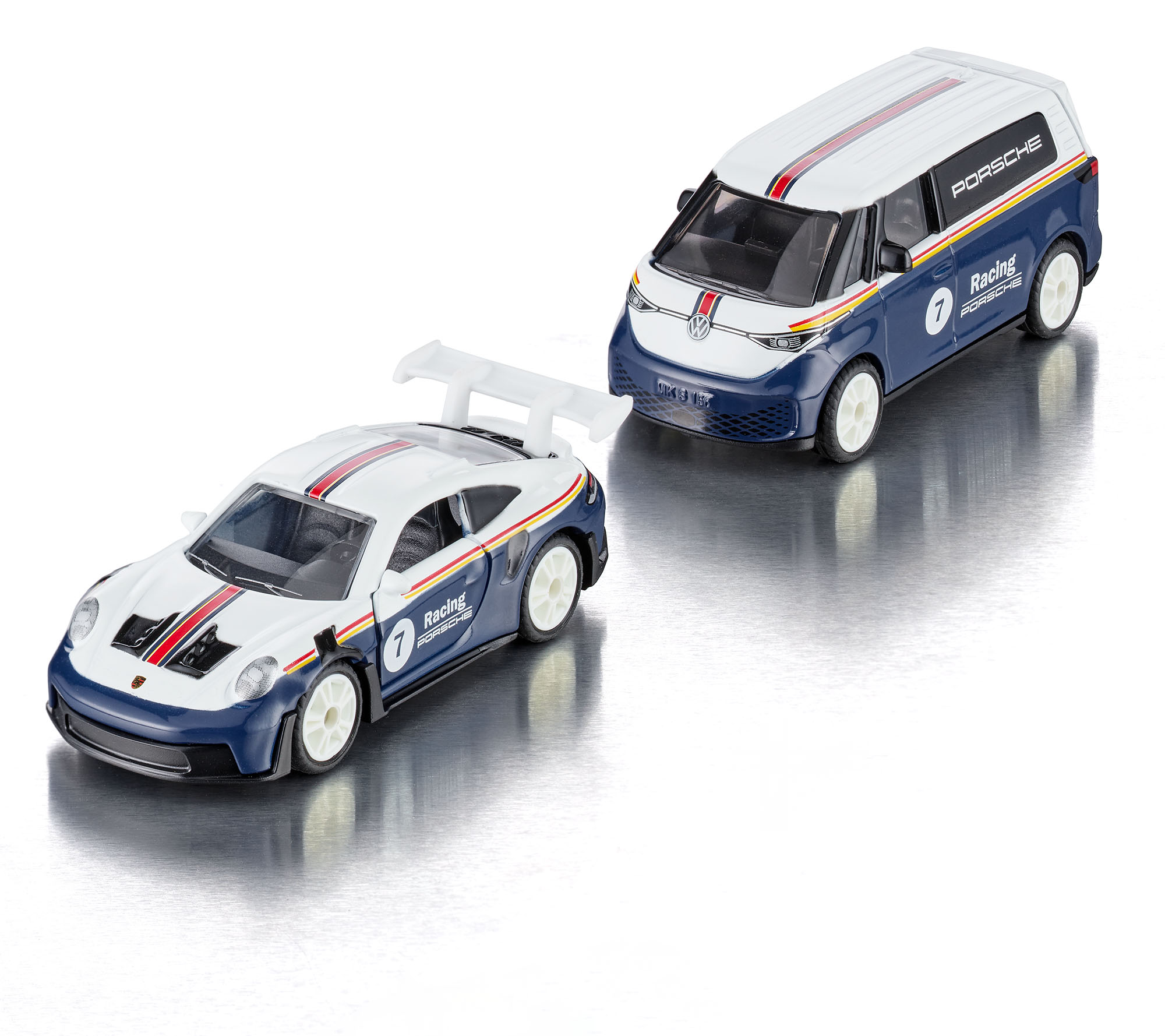 00000 VW ID. Buzz Cargo (1. Generation, Baureihe ID. Buzz, interne Baureihenbezeichnung EBN, viertüriger batterieelektrischer Kleintransporter mit 2 Sitzplätzen, Ausstattungslinie Cargo: Lüftungsgitter mit rautenförmigen Öffnungen unten im vorderen Stoßfänger über die komplette Fahrzeugbreite + Außenspiegel elektrisch einstell- und beheizbar + Frontscheibe Wärmeschutzglas grün + Türverkleidung und Armauflage in Kunststoff + Sitzbezüge in Stoff + Robustbodenbelag im Fahrerhaus + Trennwand ohne Fenster + Holzboden hinten im Laderaum + Heckscheibenwischer mit Intervallschaltung + Schiebetür rechts + Heckklappe mit Fensterausschnitt und Heckfenster + LED-Laderaumbeleuchtung + LED-Rückleuchten + Stahlräder in schwarz vorne Größe 8 J x 18 mit Reifen 235/60 R 18 103T bzw. hinten Größe 8,5 J x 18 mit Reifen 255/55 R 18 105 T sowie Radvollblenden in silber, Sonderausstattung gegen Mehrpreis: IQ-LIGHT - LED-Matrix-Scheinwerfer mit automatischer Fahrlichtschaltung, Schlechtwetterlicht, Begrüßungsfunktion und Leiste zwischen den Scheinwerfern beleuchtet + Stoßfänger in Wagenfarbe + Sitz links und rechts mit manueller Höheneinstellung (Abwahl Doppelsitzbank) + Trennwand mit festem Fenster und Sicherheitsinnenspiegel abblendbar, SWB (short wheel base = kurzer Radstand), 1-Gang-Automatikgetriebe, Heckantrieb, Motor: ein Elektromotor Typ APP310 mit Permanentmagneten (PMSM bzw. PSM = permanenterregte Synchronmaschine) an der Hinterachse mit 204 PS (Systemleistung, Motorcode EBJ) (2022-2024) bzw. ein Elektromotor Typ APP550 mit Permanentmagneten (PMSM bzw. PSM = permanenterregte Synchronmaschine) an der Hinterachse mit 286 PS (Systemleistung, Motorcode ECN) (2024-), Lithium-Ionen Batterie mit 82,0 kWh Kapazität brutto bzw. 77,0 kWh Kapazität netto (2022-2024) oder mit 84,0 kWh Kapazität brutto bzw. 79,0 kWh Kapazität netto (2024-), Radstand 2989 mm, Länge 4712 mm, Modell 2022-) mit BÖCKMANN Autotransporter Tieflader AT 4019/27 (Baureihe: AT-Serie = Fahrzeugtransporter als Tieflader mit Tandem-Achse, gelochte rutschfeste und massive Laufschienen, Kunststoffkotflügel, Kippwinkel 13,5°, zulässiges Gesamtgewicht 2700 kg, Tragkraft 2080 kg, Länge Aufbau-Innenmaß 4000 mm, Gesamtlänge 5975 mm, Modell 2006-) und Porsche 911 GT3 RS (8. Generation Porsche 911 oder 6. RS-Generation, Baureihe 911 GT3 RS, interne Baureihenbezeichnung 992 bzw. 992.1, zweitüriger Sportwagen als Coupé mit 2 Sitzplätzen, Vorfacelift, übergroßer Heckflügel mit Schwanenhalsaufhängung, Ausstattungslinie GT3 RS: Lufteinzüge in der Fahrzeugseite und Radhausentlüftungen mit Sideblades sowie Flügelelemente an der Fahrzeugfront und Mittelkühler in der Fahrzeugfront der durch Öffnungen im Frontdeckel entlüftet wird (dadurch entfällt der Kofferraum), 7-Gang Porsche Doppelkupplungsgetriebe (PDK), Hinterradantrieb, Motor: Porsche Typ MA275 wassergekühlter Sechszylinder-Boxer-Viertakt-Otto mit Direkteinspritzung und zwei obenliegende Nockenwellen (DOHC = Double Overhead Camshaft) je Zylinderbank sowie 4 Ventile pro Zylinder und 3996 cm³ sowie 525 PS, Radstand 2453 mm, Länge 4572 mm, Modell 2022-2024) (vgl. 1500), Zugfahrzeug: Karosserie oben weiß, Karosserie unten blau, innen schwarz, Sitze schwarz, Lenkrad schwarz, Druck PORSCHE auf Streifen in schwarz oben auf den Seiten des Laderaumes in Höhe der Fahrerhausseitenfenster, Druck Streifen in verkehrsrot/gelb oben auf den Seiten, Druck Startnummer 7 im Kreis in reinweiß und Racing / PORSCHE in reinweiß auf den Seiten, Druck Streifen in blau/rot oben auf der Motorhaube und dem Dach, Chassis mit Anhängerkupplung (AHK) schwarz, B49 reinweiß (VW Stahlräder in schwarz im 18-Loch-Design vorne Größe 8 J x 18 H2 ET 45 mit Lochkreis 5 x 112 (Teilenummer 1EA 601 027 A, Farbcode 03C rallyeschwarz) und Reifen 235/60 R 18 103T sowie Radvollblenden im 4-Schlitz-/4-Trichter-Design (Teilenummer 1T3 601 147, Farbcode 1ZX fine silber) bzw. hinten Größe 8,5 J x 18 H2 ET 56 mit Lochkreis 5 x 112 (Teilenummer 1N3 601 027 A, Farbcode 03C rallyeschwarz) und Reifen 255/55 R 18 105 T sowie Radvollblenden im 4-Schlitz-/4-Trichter-Design (Teilenummer 1T3 601 147 A, Farbcode 1ZX fine silber)), ca. 1:61; Anhänger: mattschwarz, Druck BÖCKMANN-Logo in schwarz/rot/gelb auf den Seiten der Ladefläche und des Fahrgestelles, Druck Nummernschild SI KU 202, B21 silbergrau (BÖCKMANN Stahlfelgen im 16-Loch-Design Größe 5,5 J x 14 H2 ET 30 mit Lochkreis 5 x 112 (Teilenummer 1001816) und Radnabenabdeckung sowie Reifen 195/70 R14), ca. 1:55; Ladegut: Karosserie oben reinweiß (vgl. weiß beim Original, Verkaufskennzeichen 0Q, Farbcode C9A), Karosserie unten blau, innen schwarz, Sitze schwarz (Vollschalensitze aus kohlefaserverstärktem Kunststoff (CfK) in Sichtcarbon und Sitzbezug Leder schwarz mit Sitzmittelbahn in perforiertem Race-Tex schwarz hinterlegt mit Kontrastfarbe GT-silber, Kopfstützen mit eingesticktem GT3 RS Schriftzug in GT-silber beim Original), Lenkrad schwarz (Porsche GT-Sportlenkrad in Race-Tex schwarz beim Original), Druck Frontscheinwerfer silber, Druck Streifen in verkehrsrot/gelb oben auf den Seiten, Druck Startnummer 7 im Kreis in reinweiß und Racing / PORSCHE in reinweiß auf den Türen, Lufteinzüge in der Fahrzeugseite schwarz, Radhausentlüftungen mit Sideblades schwarz, Druck Streifen in blau/rot auf dem Frontdeckel und dem Dach, Öffnungen im Frontdeckel schwarz, Druck Porsche-Wappen in schwarz/gold/verkehrsrot vorne auf dem Frontdeckel, Heckflügel mit Schwanenhalsaufhängung reinweiß, Druck Modellbezeichnung GT3 RS in verkehrsrot auf dem Heckstoßfänger, Druck Rückleuchten in rubinrot/silber mit Umrandung in schwarz, Druck Rückstrahler in rubinrot, B49 reinweiß (Porsche GT3 RS Aluminium Schmiederäder im 7-V-Design vorne Größe 10 J x 20 ET 45 (einteilig, Teilenummer 9GT 601 025 AE, Farbcode 8Z8 brillantsilber) mit Zentralverschluss (Farbcode schwarz seidenglanz mit RS Schriftzug in weiß) und MICHELIN Pilot Sport Cup 2 R-Reifen 275/35 
