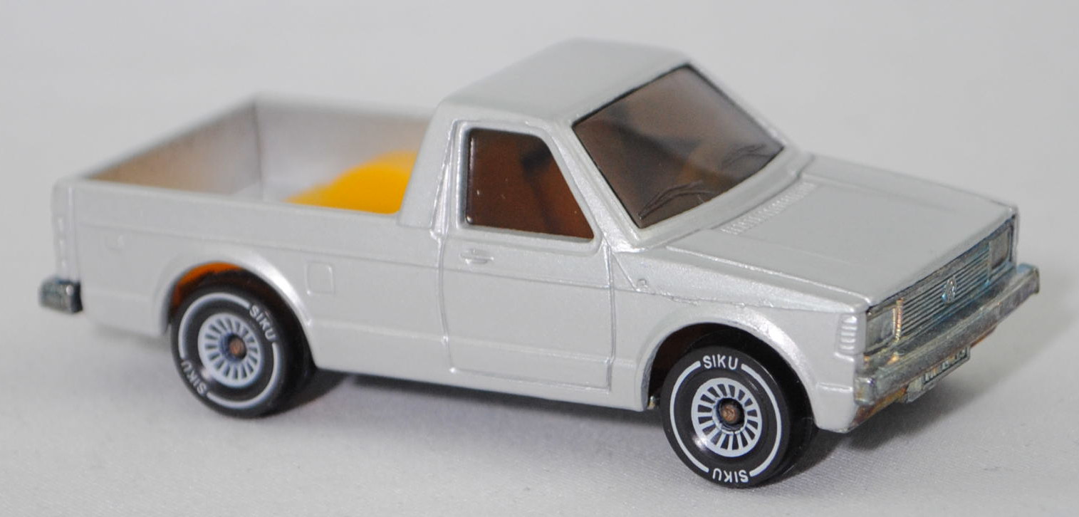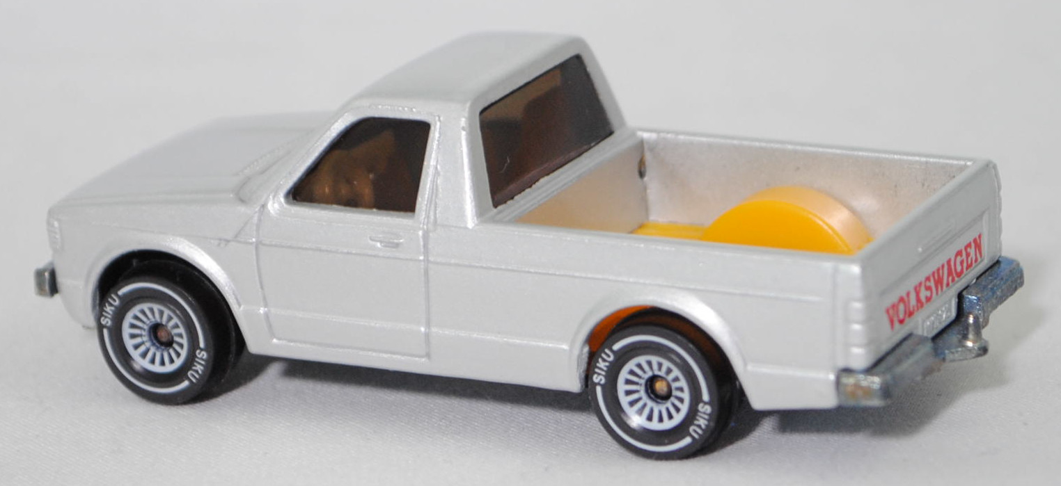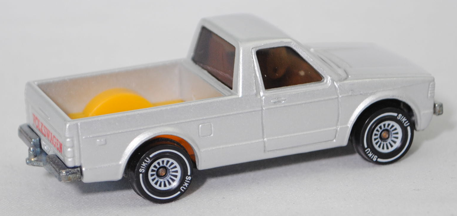 00000 VW Pickup Truck LX (vgl. VW Caddy I) (14D, Typ 147, Mod. 81-83), silber, VOLKSWAGEN in signalrot auf Heckklappe, ohne Kastenaufbau, mit Loch in Bpl., SIKU, 1:58, m