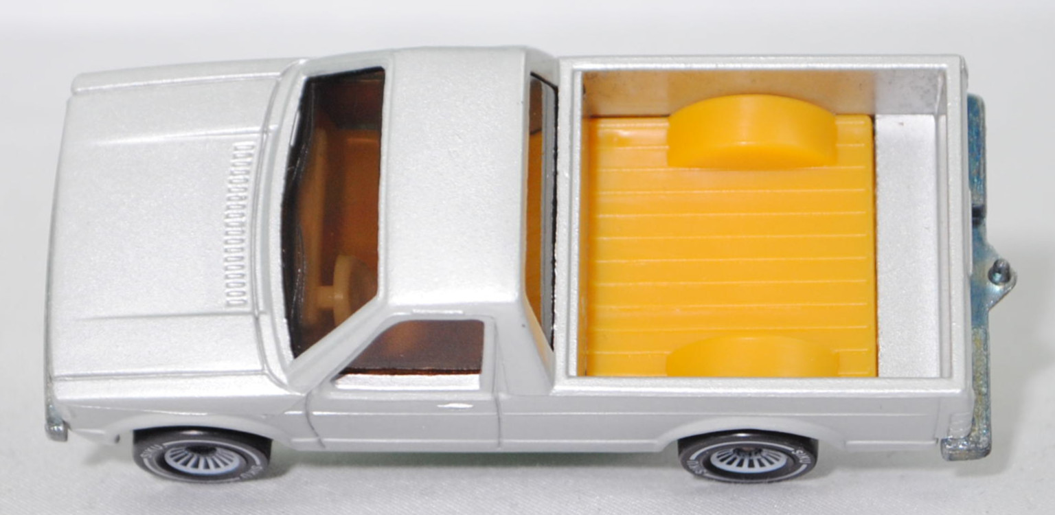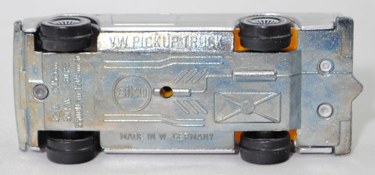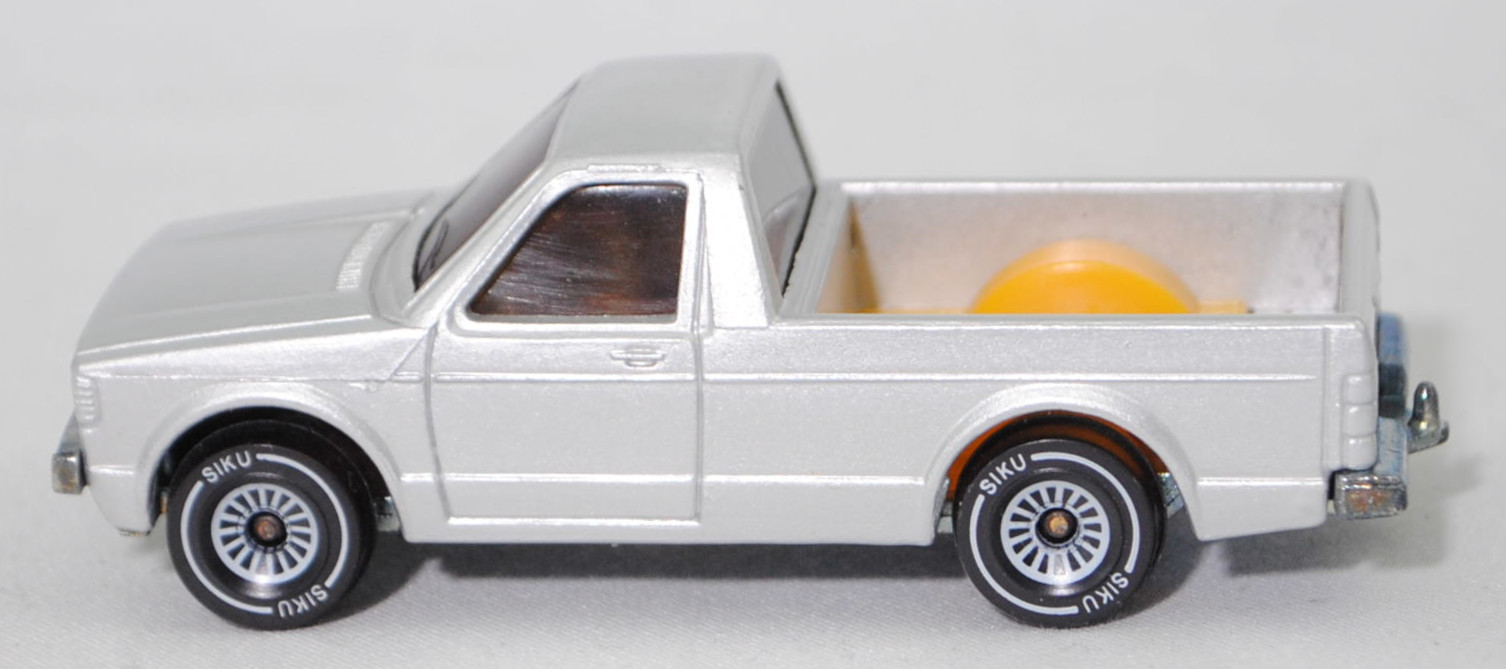 00000 VW Pickup Truck LX (vgl. VW Caddy I) (14D, Typ 147, Mod. 81-83), silber, VOLKSWAGEN in signalrot auf Heckklappe, ohne Kastenaufbau, mit Loch in Bpl., SIKU, 1:58, m