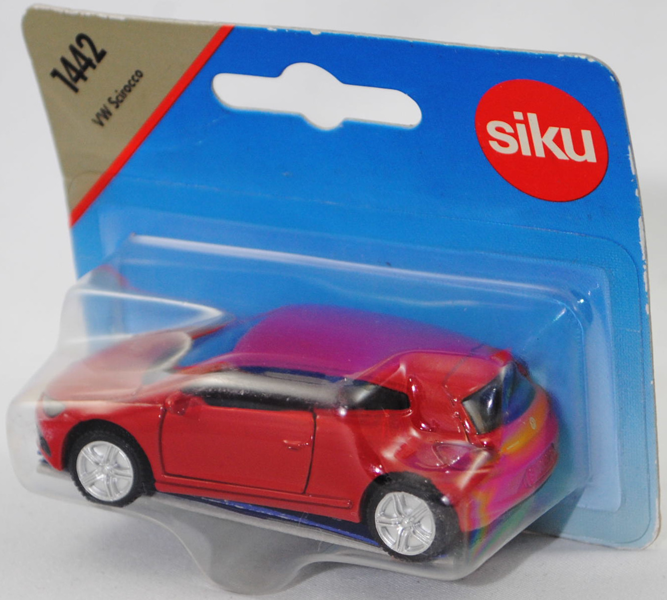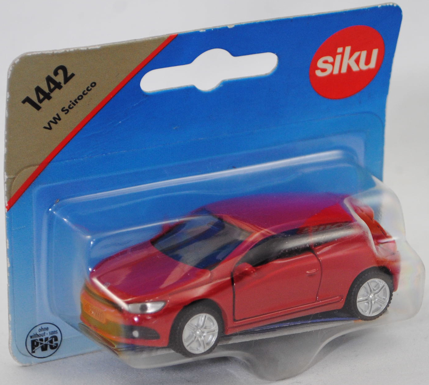 00000 VW Scirocco III 2.0 TSI (3. Generation, Baureihe Scirocco, interne Baureihenbezeichnung Typ 13, dreitüriges Kombicoupé mit 2+2 = 4 Sitzplätzen, Vorfacelift, Kühlergrill mit zwei waagerechten Lamellen, vorderer Stoßfänger im Bereich des Kühlergrills hochgezogen, Stoßfänger vorne mit runden Nebelscheinwerfern, vorderer Stoßfänger oben und unten in Wagenfarbe lackiert mit dazwischen liegenden Lüftungsgittern in Wabenstruktur, Rückfahrscheinwerfer unter hoher weißer Verglasung, schwarze Blende mittig unten im hinteren Stoßfänger bis kurz über die Auspuffendrohre geführt, Ausstattungslinie Scirocco: 4 Leichtmetallräder Spa 8 J x 17 in Sterling-Silber lackiert mit Reifen 225/45 R 17 + Abgas-Doppelendrohr + Außenspiegelgehäuse und Türgriffe in Wagenfarbe + Blinkleuchten in LED-Technik seitlich in Außenspiegeln integriert + Blinkleuchten weiß im vorderen Stoßfänger integriert + Halogen-Hauptscheinwerfer + Kühlergrill mit Lamellen in schwarz + Stoßfänger in Wagenfarbe + Wärmeschutzverglasung grün, 6-Gang-Schaltgetriebe, Frontantrieb, Motor: VW Typ EA888 wassergekühlter Vierzylinder-Reihen-Viertakt-Turbo-Otto mit Direkteinspritzung und zwei obenliegende Nockenwellen (DOHC = Double Overhead Camshaft) sowie 4 Ventile pro Zylinder und 1984 cm³ sowie 210 PS, Motorkennbuchstabe CCZB, Radstand 2578 mm, Länge 4256 mm, Modell 2009-2014), karminrot, innen schwarzgrau, Sitze schwarzgrau, Lenkrad schwarzgrau, B36a silber (VW Leichtmetallräder Typ Spa im 5-Doppelspeichen-Design Größe 8 J x 17 H2 ET 41 mit Lochkreis 5 x 112 (Teilenummer 3C8 601 025 K, Farbcode 88Z brillantchrom) mit Nabendeckel (Teilenummer 3B7 601 171, Farbcode XRW satinschwarz/chromglanz) sowie Reifen 225/45 R 17 91W), SIKU SUPER, ca. 1:55, P29a (Vitrinenmodell, Schachtel vergilbt und mit Lagerspuren) (EAN 4006874014422)