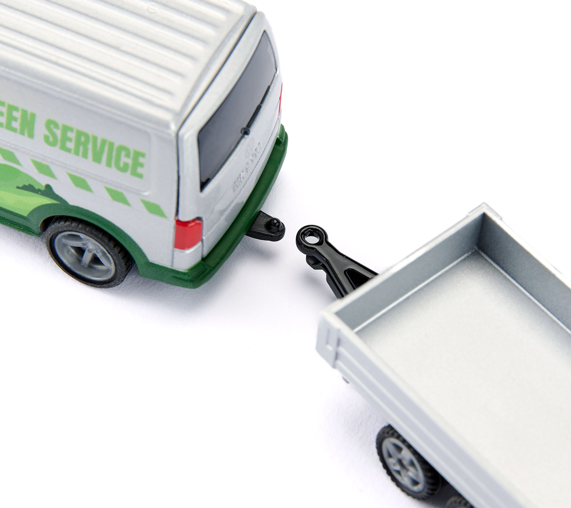 00000 VW T6 Transporter Kastenwagen 2.0 TSI (6. Generation, Typ SG, 2. Facelift 2015, Normaldach, Stoßfänger vorne mit Lüftungsgitter über die gesamte Fahrzeugbreite, Heckklappe mit größerer Vertiefung im Bereich des Nummernschildes, Vorderradantrieb, Motor: VW Typ EA888 wassergekühlter Vierzylinder-Reihen-Turbo-Viertakt-Otto mit Direkteinspritzung und BMT (BlueMotion Technology) sowie zwei obenliegende Nockenwellen (DOHC = Double Overhead Camshaft) und 4 Ventile pro Zylinder sowie 1984 cm³ und 204 PS, Motorkennbuchstabe CJKA, Abgasnorm Euro 6, Radstand 3000 mm, Länge ohne AHK 4904 mm, Modell 2015-2019) mit Tandem-Rückwärtskipper (Typ 2-Achs-Kipper als Hochlader) und Ladegut Rasentraktor MTD YaRD-MaN (vgl. 1312, 5. Ausführung), Zugfahrzeug: silbergraumetallic, innen hell-staubgrau, Sitze hell-staubgrau, Lenkrad hell-staubgrau, Druck Rasentraktor und GREEN SERVICE sowie Landschaft in grün auf den Seiten, Druck VW-Logo in graualuminiummetallic auf der Heckklappe, Stoßfänger vorne und hinten grün bedruckt, Druck Rückleuchten in rot, Chassis schwarz, LKW48 silbergrau (VW Stahlfelgen Größe 7 J x 17 H2 ET 55 mit Lochkreis 5 x 120 (Teilenummer 7E0 601 027 B, Farbcode 091 chromfarben) und Nabendeckel / Radzierkappe (Teilenummer 7H0 601 151 C, Farbcode 9B9 satinschwarz) sowie Reifen 235/55 R 17 103 H rf rollwiderstandsoptimiert und mittiger Radabdeckung), Räder abnehmbar, ca. 1:50; Anhänger: silbergraumetallic/schwarz, B47 geschlossen silbergrau, ca. 1:55; Ladegut: grün/schwarz, Sitz schwarz, Lenkrad schwarz, C29 / C30 schwarz, ca. 1:32, SIKU SUPER 1:50, L17mpK (EAN 4006874020058) (ab ca. 1. Halbjahr 2026 lieferbar)