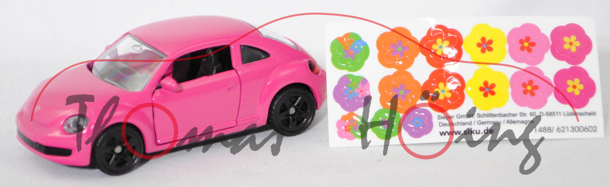 00000 VW The Beetle 1.2 TSI (2. Generation, 5C, Vorfacelift, Modell 2011-2014), dunkel-erikaviolett, Beilage: Aufkleberbogen mit Blumenmuster, SIKU SUPER, 1:55, P29f