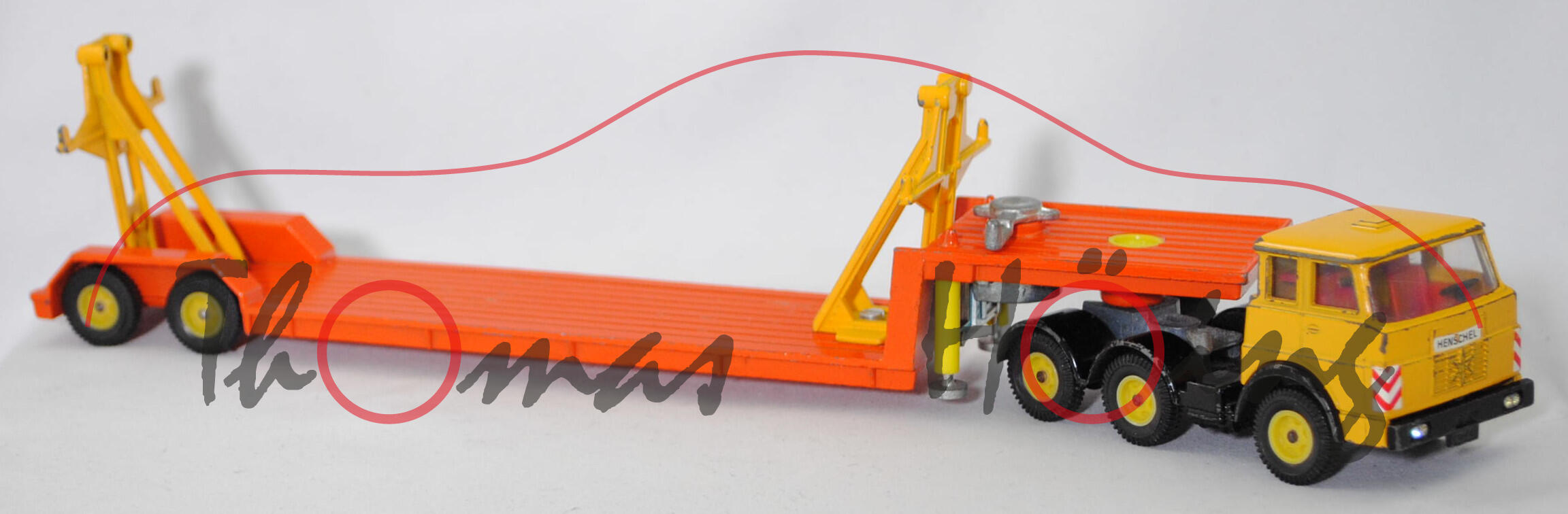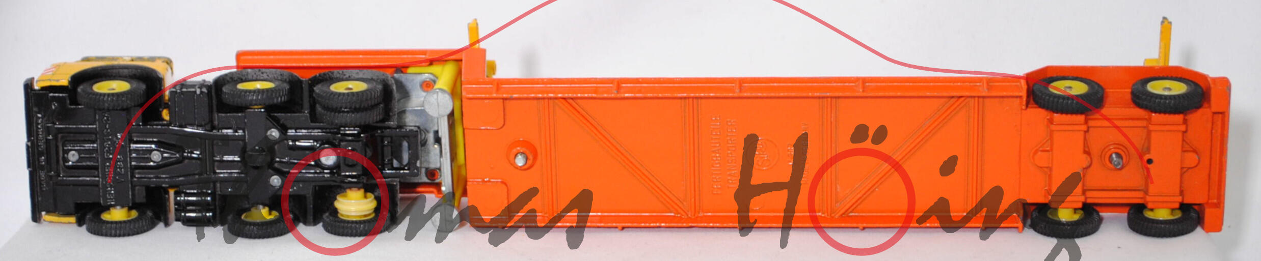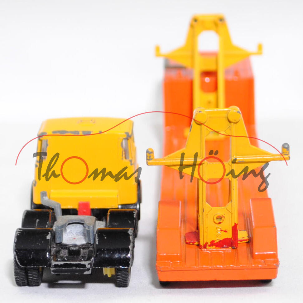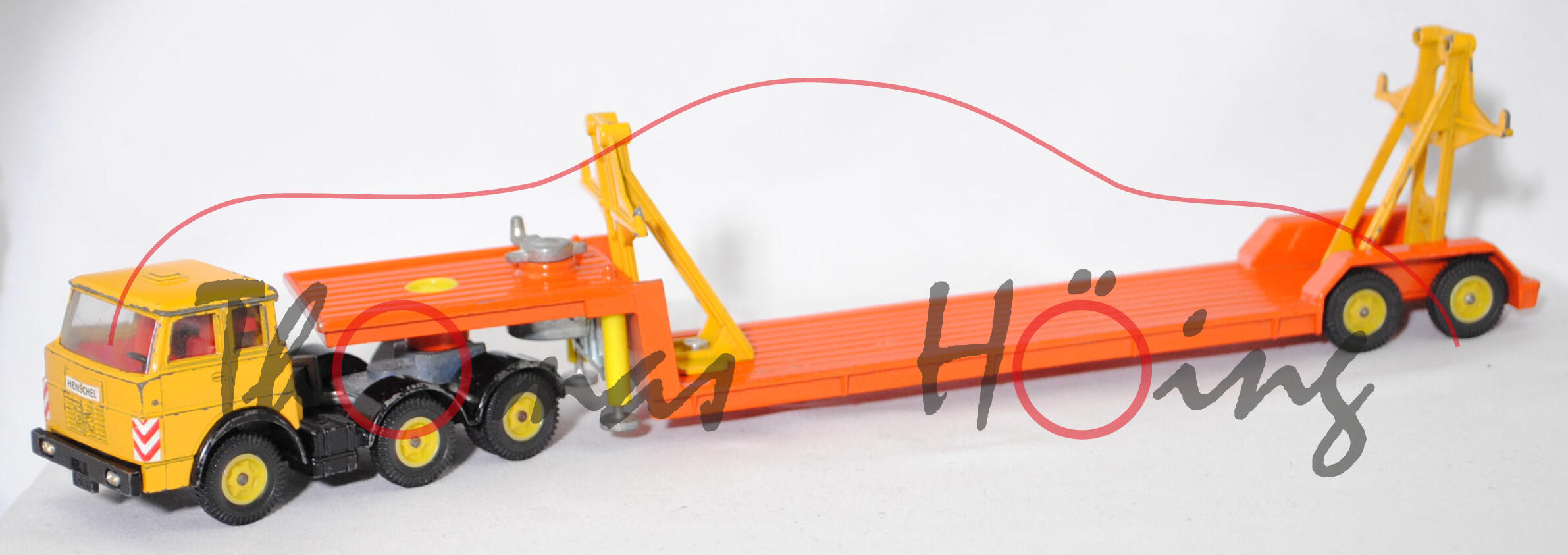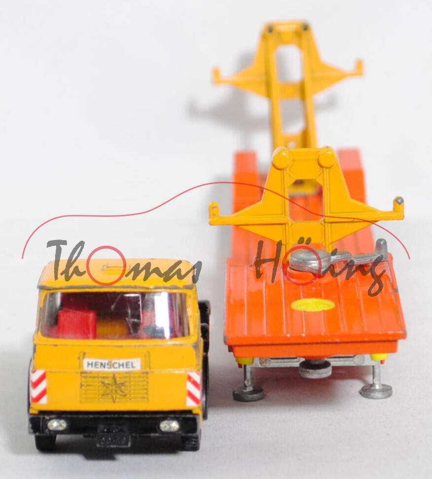 00000a Henschel F 201 S-2A mSk (3. Generation Frontlenker, Baureihe Frontlenker, interne Baureihenbezeichnung 504, Typ: schwerer Frontlenker (F), zulässiges Gesamtgewicht 20000 kg (20.), dreiachsige Sattelzugmaschine mit 2 Lenkachsen und 2 Antriebsachsen (S-2A), Fahrerhaus mit Schlafkabine und 2 Schlafliegen (mSk), Vorfacelift, Schriftzug HENSCHEL vorne mittig auf dem Fahrerhaus, Front des Fahrerhauses glatt mit schmalem Kühlergrill, Logo HENSCHEL als sechszackiger Stern im Kühlergrill, 6-Gang-Getriebe mit ZF AK 6-80 Allklauenschaltung und Overdrice, Antrieb über beide Hinterachsen, Motor: Henschel Typ 523 Baureihe 6R 1315-23 U stehender wassergekühlter Sechszylinder-Reihen-Viertakt-Diesel mit Bosch Direkteinspritzung und eine zahnradgetriebene zentrale Nockenwelle sowie OHV-Ventilsteuerung (OHV = overhead valves) und 3 hängende Ventile pro Zylinder sowie 11943 cm³ und 230 PS, Radstand 2300 + 1310 mm, Länge 6010 mm, Modell 1967-1969) Sattelzug ohne Ladegut, Sattelzugmaschine: Fahrerhaus signalgelb, innen verkehrsrot, Sitze verkehrsrot, Lenkrad schwarz, Fahrerhaus mit Dachentlüftung, Abziehbild HENSCHEL in schwarz auf reinweiß vorne mittig auf dem Fahrerhaus über dem Kühlergrill, Prägung Hanomag-Stern mittig im Kühlergrill, Abziehbild Warnschraffur in rot/weiß vorne auf den Fahrerhausecken, separat eingesetzte Glasfacetten-Frontscheinwerfer (Fac), Nummernschildprägung BO-A6 vorne unter der Stoßstange, Halterung Fahrerhaus verkehrsrot, Stoßstange schwarz, Fahrgestell schwarz, Vollnieten, Germ, Verglasung klar, Plastikfelgen schwefelgelb mit mittelgroßen Gummireifen (Henschel Stahlscheibenräder mit Schrägschulterfelgen Größe 8,0-20 und Reifen 11.00-20 (Lenkachse 1 und 2 mit jeweils 2 Reifen sowie Hinterachse mit 4 Reifen)); Sattelauflieger: Tieflader reinorange, Hydraulikstempel schwefelgelb, Garagenhalterung signalgelb, Garagenhalterung am Fuß und am unteren senkrechten Steg mit jeweils einem offenen Loch, 2 runde Metall-Haltestangen oben an den Garagenhalterungen weg, 2 breite Metall-Haltebalken außen an den Garagenhalterungen zur Ladungssicherung weg, Bpr. V 307, Germ, hintere Achshalterung vom Auflieger vorne mit offenem Loch, Plastikfelgen schwefelgelb mit mittelgroßen Gummireifen; ohne Ladegut, SIKU-SUPER-ZINKGUSS 1:60 (V-SERIE), ca. 1:58, sc (Modell mit Farbabplatzer, 1 Gummireifen beim LKW weg, Garagenhalterung am Fuß verschraubt und nicht vernietet (nicht original), Metall-Haltestangen und breite Metall-Haltebalken weg, Ladegut fehlt, Bauanleitung weg) (EAN 4006874003075)
