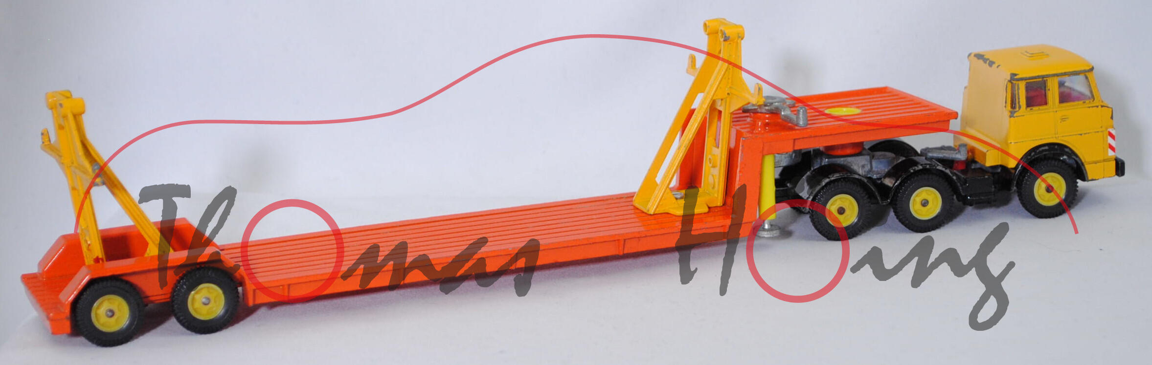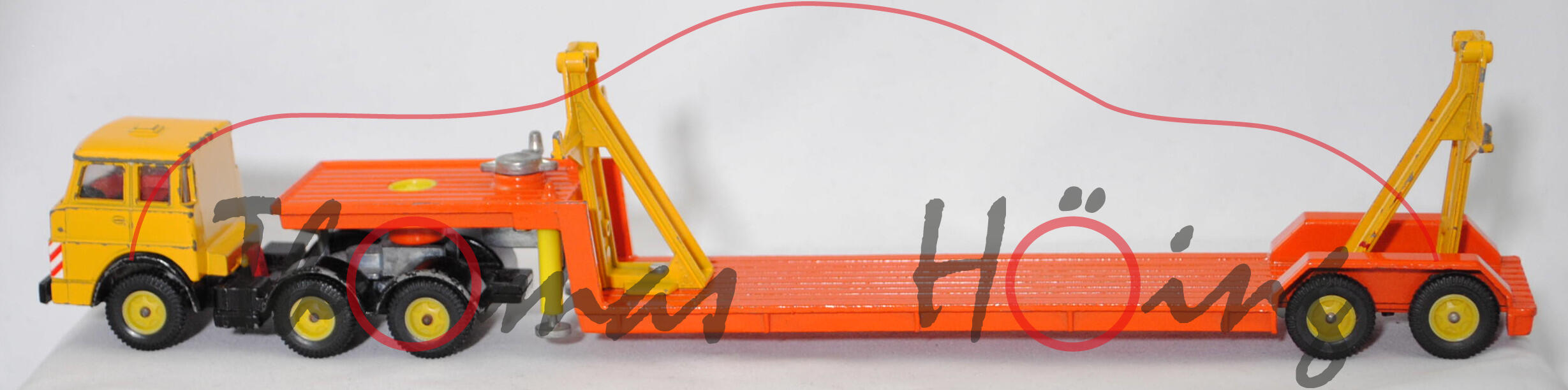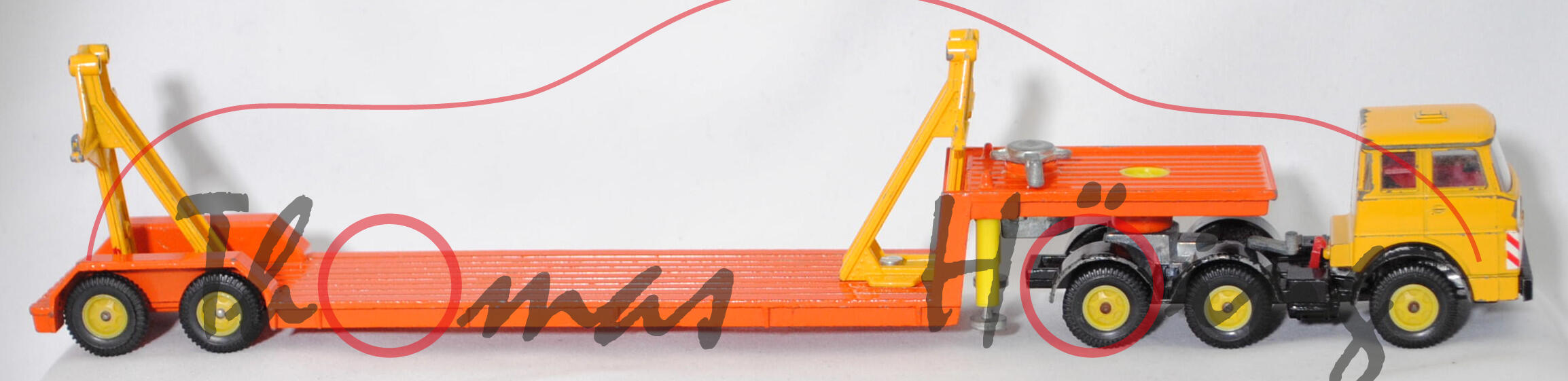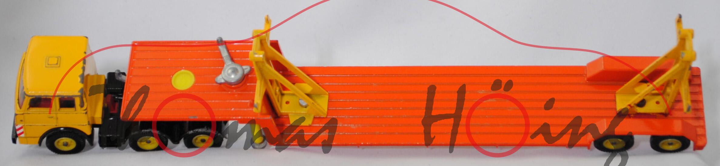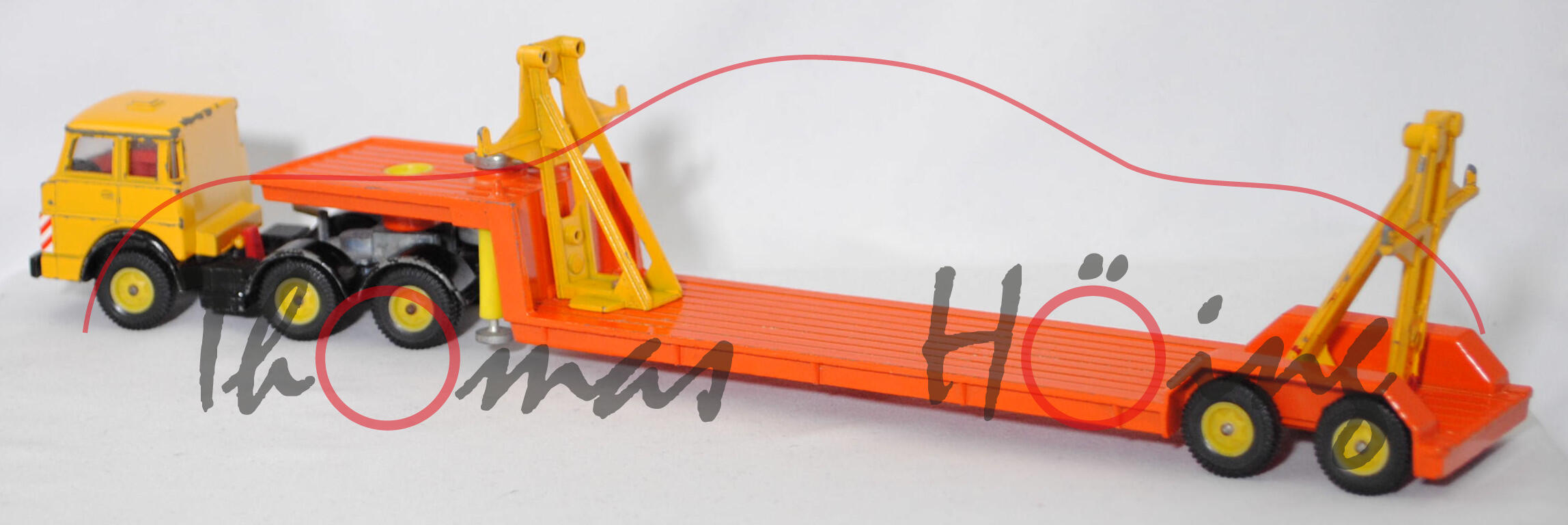 00000a Henschel F 201 S-2A mSk (3. Generation Frontlenker, Baureihe Frontlenker, interne Baureihenbezeichnung 504, Typ: schwerer Frontlenker (F), zulässiges Gesamtgewicht 20000 kg (20.), dreiachsige Sattelzugmaschine mit 2 Lenkachsen und 2 Antriebsachsen (S-2A), Fahrerhaus mit Schlafkabine und 2 Schlafliegen (mSk), Vorfacelift, Schriftzug HENSCHEL vorne mittig auf dem Fahrerhaus, Front des Fahrerhauses glatt mit schmalem Kühlergrill, Logo HENSCHEL als sechszackiger Stern im Kühlergrill, 6-Gang-Getriebe mit ZF AK 6-80 Allklauenschaltung und Overdrice, Antrieb über beide Hinterachsen, Motor: Henschel Typ 523 Baureihe 6R 1315-23 U stehender wassergekühlter Sechszylinder-Reihen-Viertakt-Diesel mit Bosch Direkteinspritzung und eine zahnradgetriebene zentrale Nockenwelle sowie OHV-Ventilsteuerung (OHV = overhead valves) und 3 hängende Ventile pro Zylinder sowie 11943 cm³ und 230 PS, Radstand 2300 + 1310 mm, Länge 6010 mm, Modell 1967-1969) Sattelzug ohne Ladegut, Sattelzugmaschine: Fahrerhaus signalgelb, innen verkehrsrot, Sitze verkehrsrot, Lenkrad schwarz, Fahrerhaus mit Dachentlüftung, Abziehbild HENSCHEL in schwarz auf reinweiß vorne mittig auf dem Fahrerhaus über dem Kühlergrill, Prägung Hanomag-Stern mittig im Kühlergrill, Abziehbild Warnschraffur in rot/weiß vorne auf den Fahrerhausecken, separat eingesetzte Glasfacetten-Frontscheinwerfer (Fac), Nummernschildprägung BO-A6 vorne unter der Stoßstange, Halterung Fahrerhaus verkehrsrot, Stoßstange schwarz, Fahrgestell schwarz, Vollnieten, Germ, Verglasung klar, Plastikfelgen schwefelgelb mit mittelgroßen Gummireifen (Henschel Stahlscheibenräder mit Schrägschulterfelgen Größe 8,0-20 und Reifen 11.00-20 (Lenkachse 1 und 2 mit jeweils 2 Reifen sowie Hinterachse mit 4 Reifen)); Sattelauflieger: Tieflader reinorange, Hydraulikstempel schwefelgelb, Garagenhalterung signalgelb, Garagenhalterung am Fuß und am unteren senkrechten Steg mit jeweils einem offenen Loch, 2 runde Metall-Haltestangen oben an den Garagenhalterungen weg, 2 breite Metall-Haltebalken außen an den Garagenhalterungen zur Ladungssicherung weg, Bpr. V 307, Germ, hintere Achshalterung vom Auflieger vorne mit offenem Loch, Plastikfelgen schwefelgelb mit mittelgroßen Gummireifen; ohne Ladegut, SIKU-SUPER-ZINKGUSS 1:60 (V-SERIE), ca. 1:58, sc (Modell mit Farbabplatzer, 1 Gummireifen beim LKW weg, Garagenhalterung am Fuß verschraubt und nicht vernietet (nicht original), Metall-Haltestangen und breite Metall-Haltebalken weg, Ladegut fehlt, Bauanleitung weg) (EAN 4006874003075)