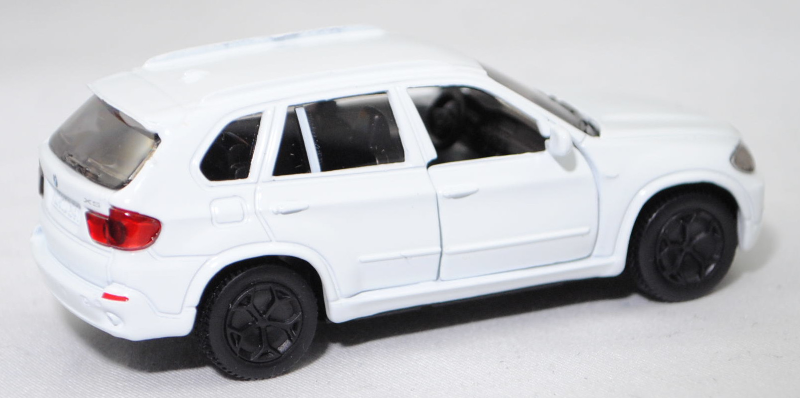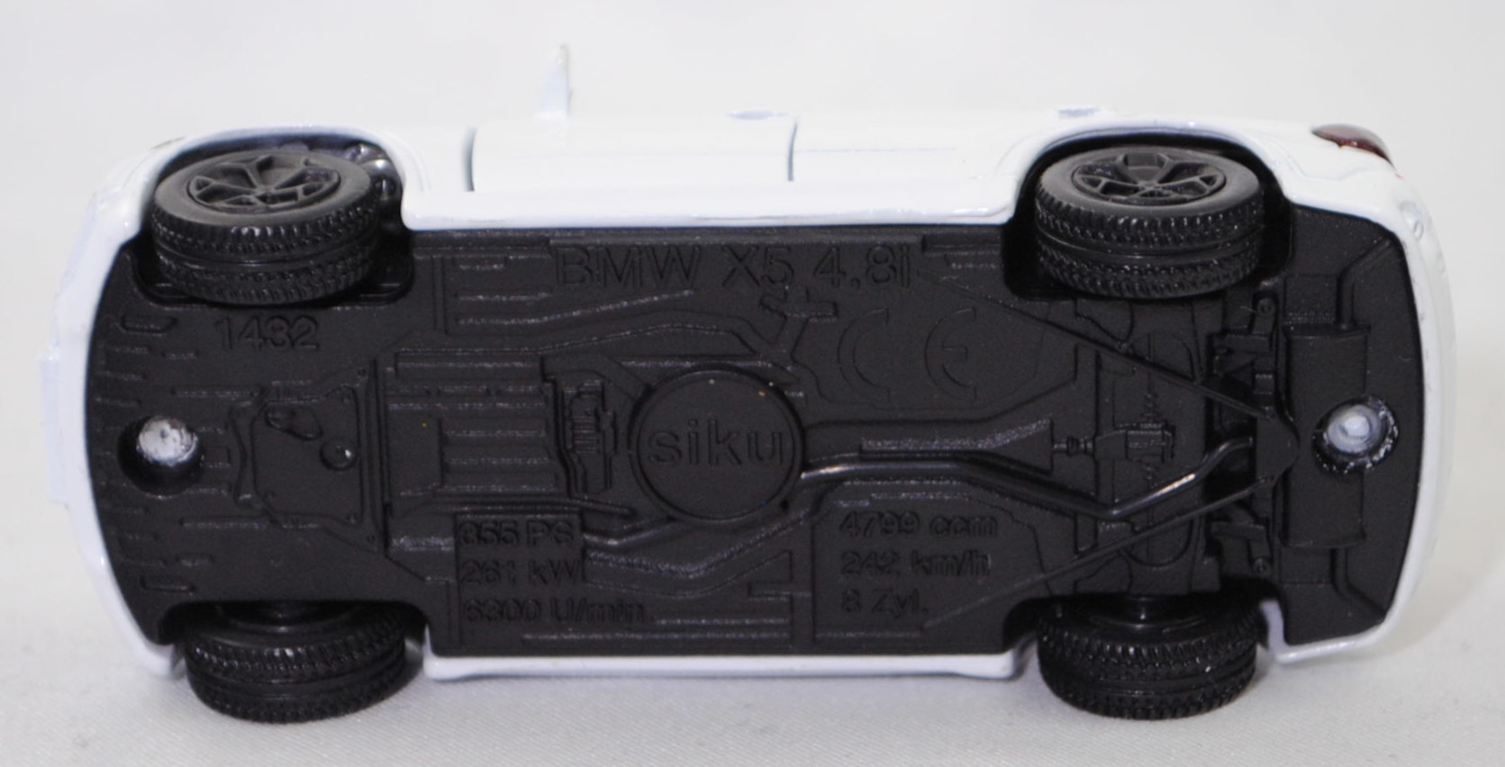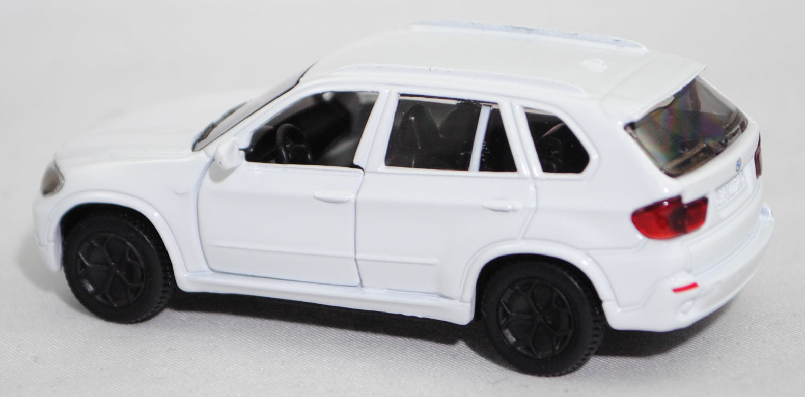00001 BMW X5 3.0si / xDrive30i (2. Generation, Baureihe X5, interne Baureihenbezeichnung E70, fünftüriges Sport Utility Vehicle (SUV) mit 5 Sitzplätzen, Vorfacelift (vor LCI = vor Life Cycle Impulse bzw. vor Modellpflegemaßnahmen), Frontziergitter mit Nieren-Längsstreben in schwarz mit Chromeinfassung, Front- und Heckschürze nur im oberen Bereich in Wagenfarbe lackiert, breite flache Lüftungsöffnungen unten außen im Stoßfänger, mittlere Lüftungsöffnung im Stoßfänger nur bis auf halber Nummernschildhöhe geführt, runde Nebelscheinwerfer in trichterförmiger Aussparung im Stoßfänger, Stoßfänger hinten durchgehend ohne angedeuteten Diffusor, 2 runde Edelstahl-Auspuffendrohre je eins rechts und links, Ausstattungslinie 3.0si / xDrive30i: Halogen-Scheinwerfer + Nebelscheinwerfer + Frontziergitter mit Nieren-Längsstäben in schwarz, mit Chromeinfassung + Sechszylinder-Motor mit 2996 cm³ und 272 PS + 6-Gang-Automatic-Getriebe und elektronischem Gangwahlschalter inkl. Steptronic und adaptiver Getriebesteuerung + Außenspiegel asphärisch beheizt und elektrisch einstellbar + Innenspiegel automatisch abblendend + Interieurleisten Graphitan matt + Lederlenkrad im 3-Speichen Design mechanisch längs- und höhenverstellbar + Klimaautomatik + Sitzverstellung teilelektrisch für Fahrer und Beifahrer + Polsterung Stoff Twill + Fensterrahmenleiste in schwarz matt + Dachspoiler inkl. dritter Bremsleuchte + Heckklappe zweiteilig, Oberteil nach oben zu öffnen, Heckklappenunterteil manuell entriegelbar, Unterteil auf Ladekantenniveau abklappbar + Heckscheibenwischer + 2 Auspuffendrohre (je eins rechts und links), Edelstahl, rund + Leichtmetallräder Sternspeiche 209 Größe 8,5 J x 18 mit Reifen 255/55 R 18 Runflat, 6-Gang-Automatikgetriebe, Allradantrieb, Motor: BMW Typ N52B30 wassergekühlter Sechszylinder-Reihen-Viertakt-Otto mit Saugrohreinspritzung und zwei obenliegende Nockenwellen (DOHC = Double Overhead Camshaft) sowie 4 Ventile pro Zylinder und 2996 cm³ sowie 272 PS, Radstand 2933 mm, Länge 4854 mm, Modell 2006-2008 als X5 3.0si bzw. 2008-2010 als X5 xDrive30i), reinweiß (vgl. alpinweiß III beim Original, Farbcode 300), innen schwarz, Sitze schwarz, Lenkrad schwarz, Bpr. 1432 beim linken Vorderrad, Bpr. ohne Adresse, ohne Chargendruck auf dem Chassis, B41 schwarz (BMW Leichtmetallräder Sternspeiche 209 (5-Speichen-Design) Größe 8,5 J x 18 ET 46 mit Lochkreis 5 x 120 (Teilenummer 36 11 6 770 200, Farbe silber) und Nabenabdeckung (Ø 67 mm mit Chromrand, Teilenummer 36 13 6 783 536) sowie Reifen 255/55 R 18 109V Runflet), SIKU SUPER, ca. 1:58, m (Vitrinenmodell) (EAN 4006874014323)