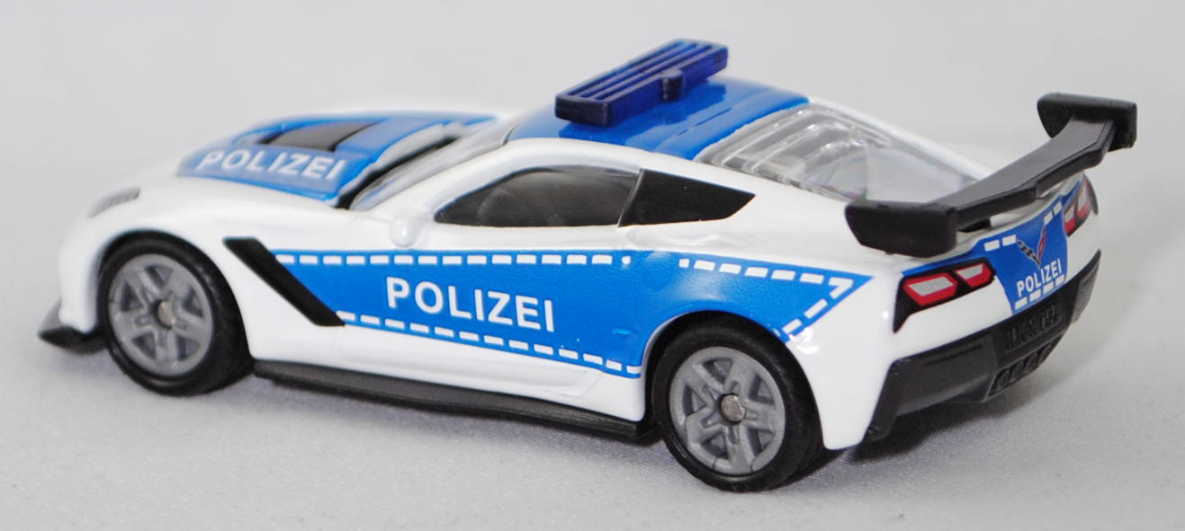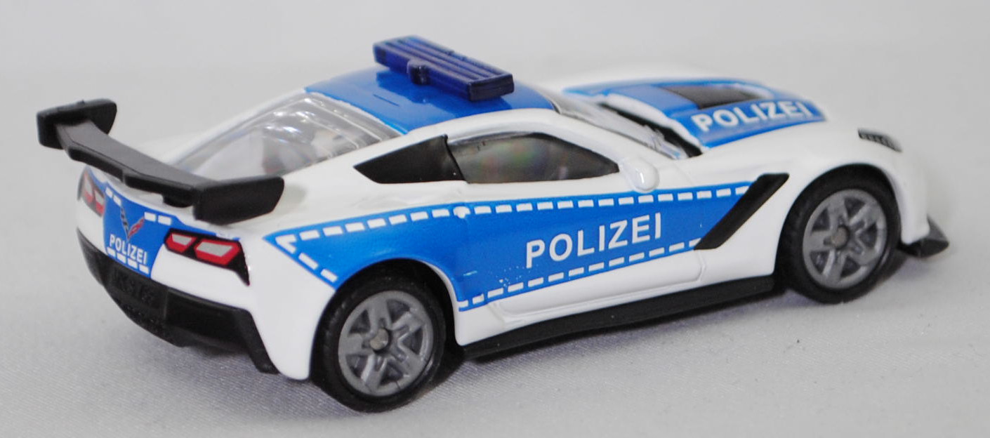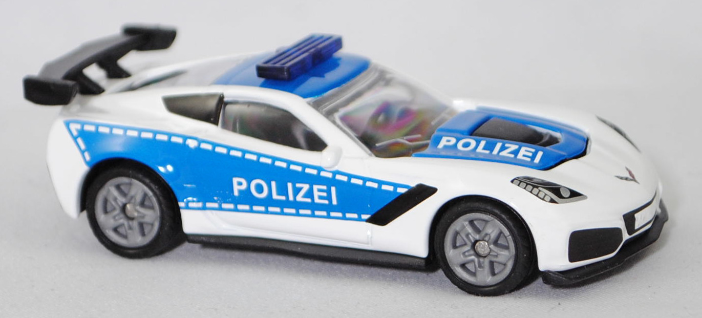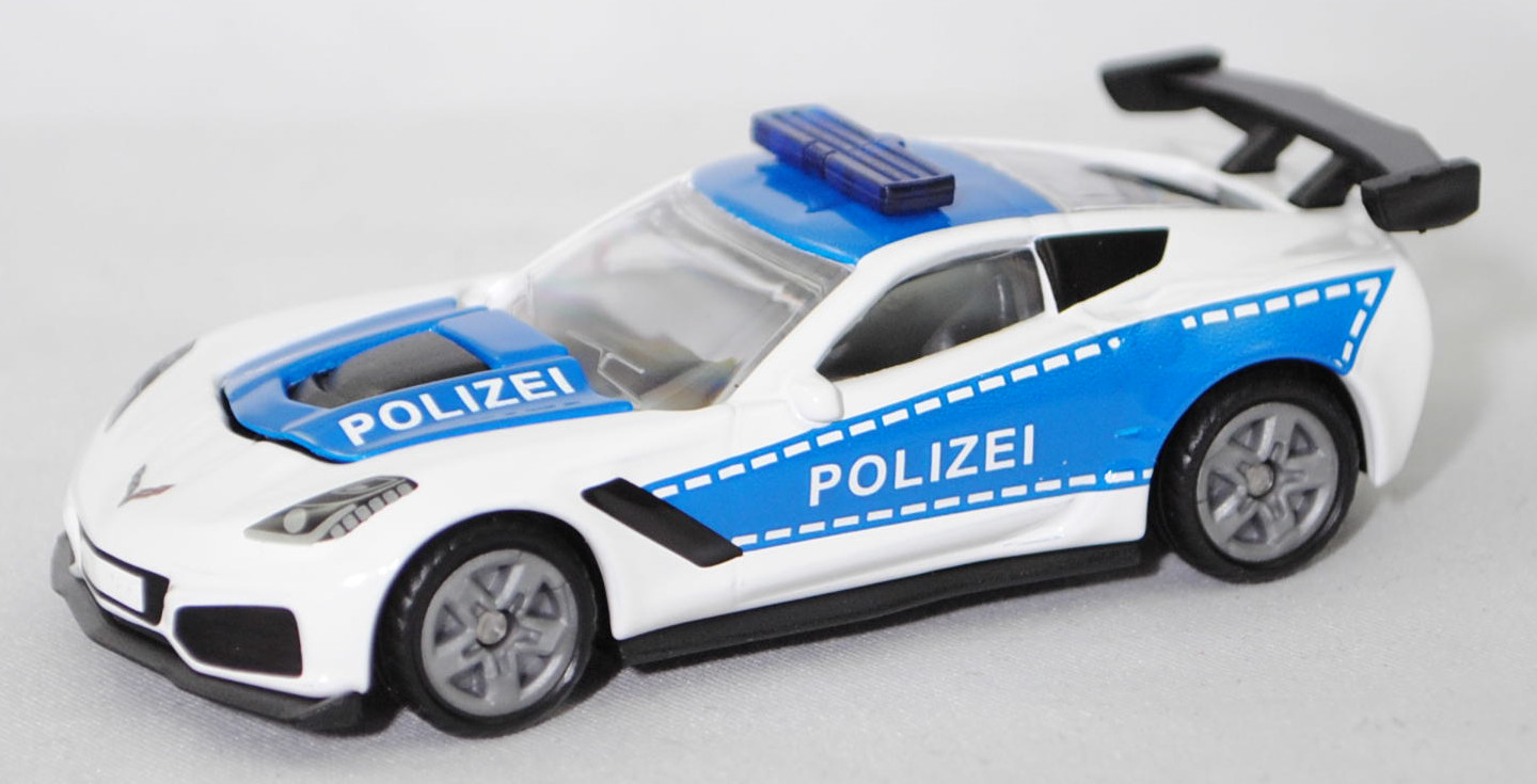 00001 Chevrolet Corvette ZR1 Coupé (7. Generation, Typ C7 mit ZTK Track Performance Package, mit Carbonanbauteilen, Frontsplitter mit Carbon-Enden, mit großem verstellbaren Heckflügel, Motor: Chevrolet Typ 6.2L LT5 supercharged V8 Achtzylinder-V-Kompressor-Viertakt-Otto mit dualer Kraftstoffeinspritzung (Direkteinspritzung und Saugrohreinspritzung) und obenliegender Nockenwelle (OHC = Overhead Camshaft) sowie 2 Ventile pro Zylinder und 6162 cm³ sowie 755 PS, Radstand 2710 mm, Länge 4567 mm, Modell 2018-2019) Polizei, reinweiß (vgl. arctic white beim Original, Farbcode WA9567), innen schwarz, Sitze schwarz, Lenkrad schwarz, Druck verkehrsblaue Streifen auf den Seiten und hinten wobei POLIZEI und Reflektorstreifen in Wagenfarbe durchschimmert, Motorhaube verkehrsblau wobei POLIZEI auf den Längsseiten in Wagenfarbe durchschimmert, Dach verkehrsblau, flache Blaulichtleiste auf dem Dach, Druck Corvette-Logo in silber/schwarz/signalrot vor der Motorhaube und hinten zwischen den Heckleuchten, B47 geschlossen silbergrau (Chevrolet Corvette ZR1 Aluminiumfelgen im 10-Speichen-Design in pearl nickel vorne Größe 10 J x 19 ET 42 mit Lochkreis 5 x 120,65 und MICHELIN Pilot Sport ZP Reifen 285/30 ZR 19 94Y sowie hinten Größe 12 J x 20 ET 59 mit Lochkreis 5 x 120,65 und MICHELIN Pilot Sport ZP Reifen 335/25 ZR 20 99Y), SIKU SUPER, ca. 1:56, P29f (EAN 4006874015252)