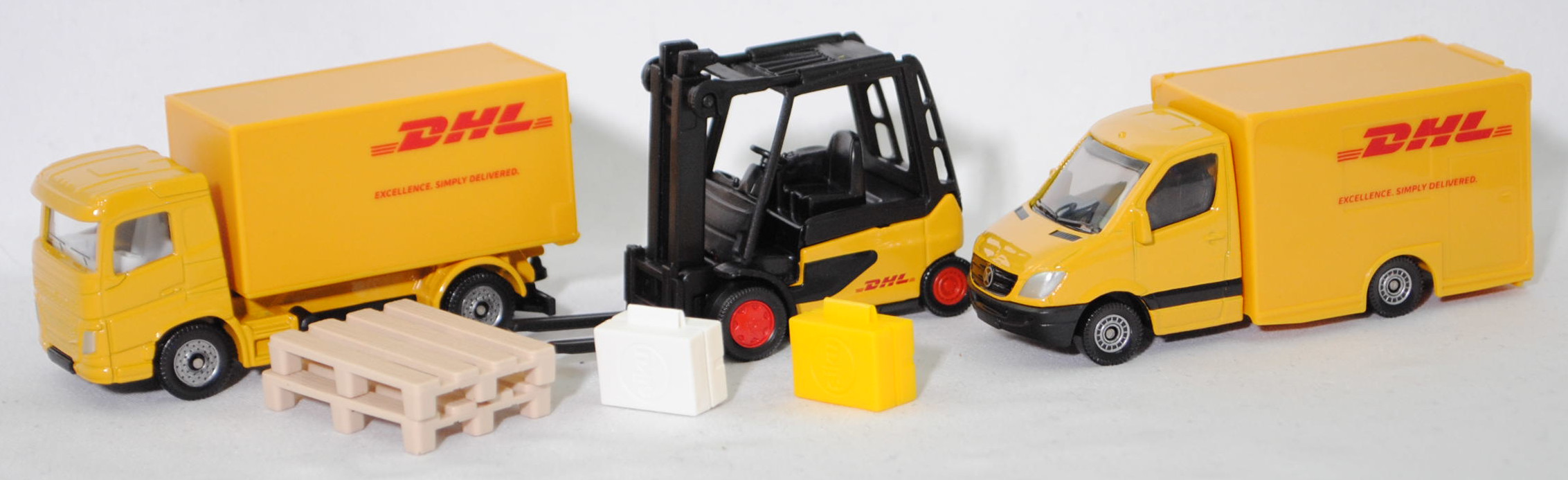 00001 DHL Logistik Set bestehend aus: Volvo FM 4x2 (3. Generation, Baureihe FM, kurzes Fahrerhaus, erweiterte Ausstattung mit Stotange in Wagenfarbe, mit Halogenscheinwerfer, Fahrgestellhe MEDIUM, LKW f den lokalen und regionalen Verteilerverkehr, zulsiges Gesamtgewicht 18 t, Hinterradantrieb, Motor: Volvo Typ D11K330 wassergeklter Sechszylinder-Reihen-Viertakt-Turbo-Diesel mit Common-Rail-Einspritzung und obenliegende Nockenwelle (OHC = Overhead Camshaft) sowie 4 Ventile pro Zylinder und Ladeluftkler sowie 10800 cm und 330 PS, Radstand 3700 mm, Gesamtlge 7110 mm, Modell 2013-) mit Kofferaufbau (vgl. 1107), Fahrerhaus goldgelb, innen reinwei Sitze reinwei Lenkrad integriert, Druck DHL / EXCELLENCE. SIMPLY DELIVERED. in hell-karminrot auf den Seiten des Koffers, Koffer und Heckklappe des Koffers goldgelb, Fahrgestell und Chassis schwarz, Chassis mit AHK, C36 (Stahlfelgen Gre 22,5 Zoll mit Reifen 315/80 R 22,5), ca. 1:82; Linde Elektro-Gegengewichtsstapler E35/600H (4-Rad-Gabelstapler, Baureihe 388, Tragfigkeit 3,5 t, Hubhe 3100 mm, Lastschwerpunkt 600 mm, Eigengewicht inkl. Batterie 6875 kg, Vorderradantrieb, Motoren: wartungsfreie Drehstrom-Antriebsmotoren mit 2x 11,9 kW und wartungsfreier Drehstrom-Hubmotor mit 25 kW, Radstand 1905 mm, Lge Gabelzinken 1000 mm, Lge einschl. Gabelrken 2712 mm, Gesamtlge einschl. Gabelzinken 3712 mm, Modell 2011-2017) (vgl. 1311, 4. Ausfrung), goldgelb/schwarz, Sitz schwarz, Lenkrad schwarz, Druck DHL in hell-karminrot auf den Seiten, Schutzkig schwarz, B6 verkehrsrot / C9 verkehrsrot (Linde Stahlfelgen vorne Gre 15 Zoll mit Reifen 355/45-15 und hinten Gre 10 Zoll mit Reifen 225/75-10), ca. 1:53; Mercedes-Benz Sprinter II (2. Generation, interne Baureihenbezeichnung NCV 3 (NCV = New Concept Van), Baureihe Sprinter W 906, Typ Standard, Vor-MoPf (vor Modellpflege, Vorfacelift), Klergrill mit 2 waagerechten Lamellen, untere Klergrillverkleidung bis unter die Frontscheinwerfer verbreitert, Stoger vorne in einer He zum Radkasten gefrt, Stoger vorne mittig in Form eines offenen Mundes mit Ausbuchtungen f die Nebelscheinwerfer, Hinterradantrieb, Motor: Mercedes-Benz OM 646 DE 22 LA wassergeklter Vierzylinder-Reihen-Viertakt-Diesel mit Bosch Common-Rail-Direkteinspritzung und Abgasturbolader mit variabler Turbinen-Geometrie (VTG) sowie zwei obenliegende Nockenwellen (DOHC = Double Overhead Camshaft) und 4 Ventilen pro Zylinder sowie Ladeluftkler und 2148 cm sowie 129 PS, Baumuster Motor 646.986, Radstand 3.665 mm, Lge 5910 mm, Modell 2006-2009) 213 CDI / 313 CDI Fahrgestell mit MIESEN Kofferaufbau (Typ selbsttragender Leicht-Kofferaufbau, Hersteller: C. Miesen GmbH & Co. KG, Sstra 119, 53175 Bonn) (vgl. 1536), goldgelb, innen schwarz, Sitze schwarz, Lenkrad schwarz, Kofferaufbau goldgelb mit Druck DHL / EXCELLENCE. SIMPLY DELIVERED. in hell-karminrot auf den Seiten, Druck DHL in hell-karminrot hinten auf dem Kofferaufbau, Druck Kreuz im Kreis in silber auf dem Klergrill, Klergrill geprt ohne Ltungsgitter und mit 3 Lamellen, C80 schwarz mit silbernem Druck, ca. 1:78; Zubeh: 2 hell-beige strukturierte Paletten + 1 reinweis Paket + 1 verkehrsgelbes Paket, SIKU SUPER, P32mpR (EAN 4006874063352)