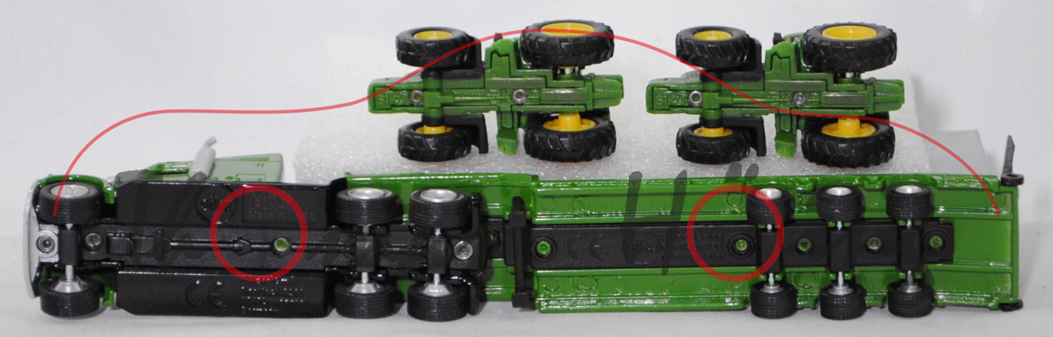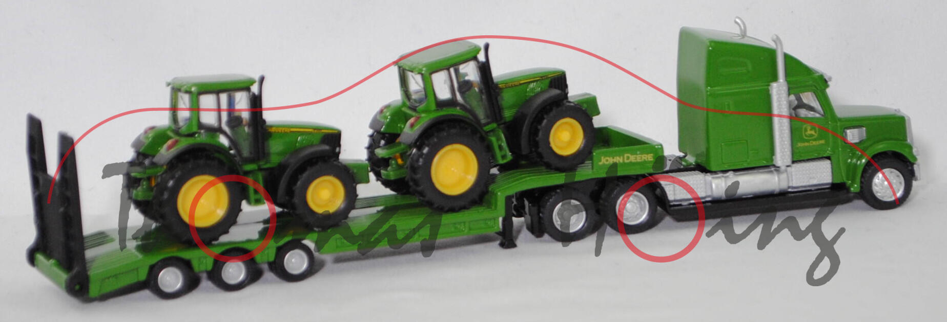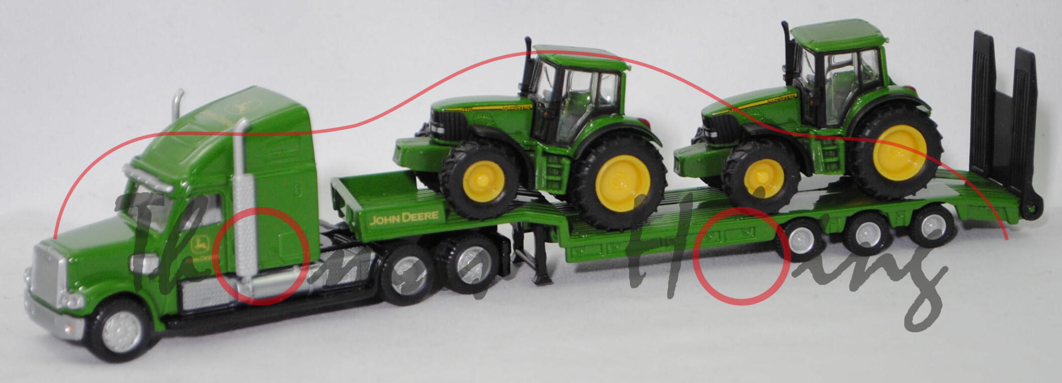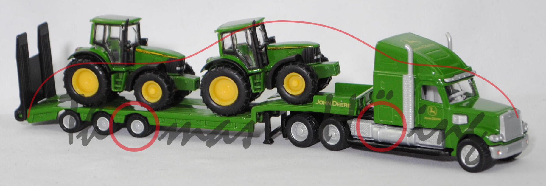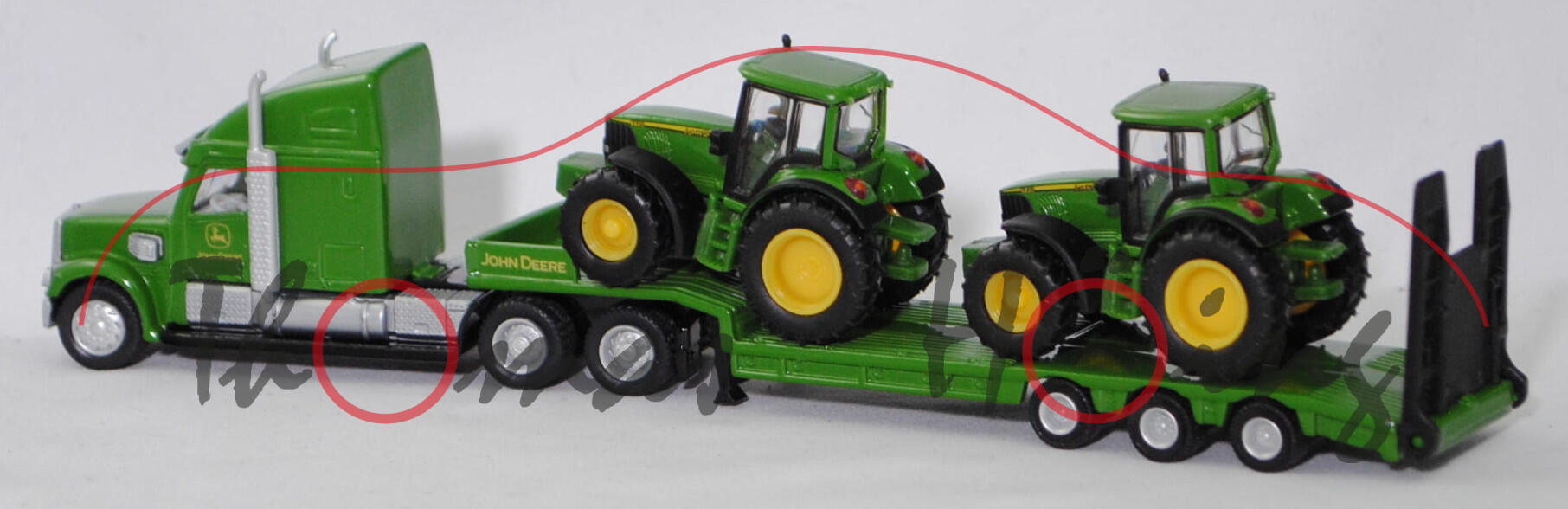 00001 FREIGHTLINER® CORONADO® CC132 6x4 (Typ 70'' Raised Roof SleeperCab, Hinterradantrieb, Motor: Detroit Diesel Typ Serie 60 12.7L wassergekühlter Sechszylinder-Viertakt-Turbo-Diesel mit Einspritzung und eine obenliegende Nockenwelle (OHC = Overhead Camshaft) sowie 4 Ventile pro Zylinder und Ladeluftkühler sowie 12700 cm³ und 500 PS, Modell 2001-2010) Sattelzugmaschine und 3-Achs-NOOTEBOOM OSDS-Semi-Tieflader mit Auffahrrampe (Typ befahrbares Podest mit Bordwänden, Radstand 2x 1360 mm) sowie Ladegut 1x John Deere 6820 Traktor (Baureihe Serie 6020, Facelift 2003, Motor mit Common-Rail-Hochdruckeinspritzung und 4-Ventil-Technik, Allradantrieb, Motor: John Deere PowrTech 6.068 HL-472/V4 stehender wassergekühlter Sechszylinder-Reihen-Viertakt-Turbo-Diesel mit Common-Rail-Hochdruckeinspritzung und 4 Ventile pro Zylinder sowie Ladeluftkühler und 6788 cm³ sowie 135 PS (Nennleistung) bzw. 147 PS (Maximalleistung), Radstand 2650 mm, Länge 4730 mm, Modell 2003-2006) und 1x John Deere 6920 Traktor (Motor: John Deere 6068T, Radstand 2650 mm, Modell 2001-2006), Sattelzugmaschine: hell-smaragdgrün/schwarz, innen reinweiß, Sitze reinweiß, Lenkrad reinweiß, Druck John Deere-Logo und JOHN DEERE in zinkgelb auf den Türen und vorne oben auf der Schlafkabine, Kühlergrill weißaluminiummetallic, Stoßstange mit integriertem Rammschutz vorne weißaluminiummetallic, separat eingesetzte Sonnenblende am Fahrerhaus weißaluminiummetallic, Lüfterflächen an den Seiten der Motorhaube weißaluminiummetallic, Kompressoren weißaluminiummetallic, Auspuff und Tanks weißaluminiummetallic, Trittbretter mit Prägung siku-Logo und CE-Zeichen sowie mit Adresse und Chargennummer, 87M3 / 87M4 silber, ca. 1:87; Sattelauflieger hell-smaragdgrün/schwarz, Druck JOHN DEERE in zinkgelb auf den Seiten der Bordwände, Rampe schwarz, Achshalterung mit Prägung CE-Zeichen und siku-Logo sowie Adresse, 87M2 silber, ca. 1:87; Ladegut Traktoren: 1x John Deere 6820 Traktor und 1x John Deere 6920 Traktor (Motor: John Deere 6068T, Radstand 2650 mm, Modell 2001-2006), smaragdgrün, innen smaragdgrün, Sitz schwarz, Lenkrad schwarz, Druck 6820 (oder 6920) JOHN DEERE in schwarz/zinkgelb und schwarz/zinkgelbe Streifen auf den Seiten der Motorhaube, Bpr. siku vorne, Druck Chargennummer auf dem Chassis, 87M7 / 87M8 zinkgelb (Standardbereifung vorne 16.9 R 28 AS und hinten 20.8 R 38 AS), ca. 1:89, SIKU FARMER 1:87, L17mpK (Schachtel grün) (EAN 4006874018376)