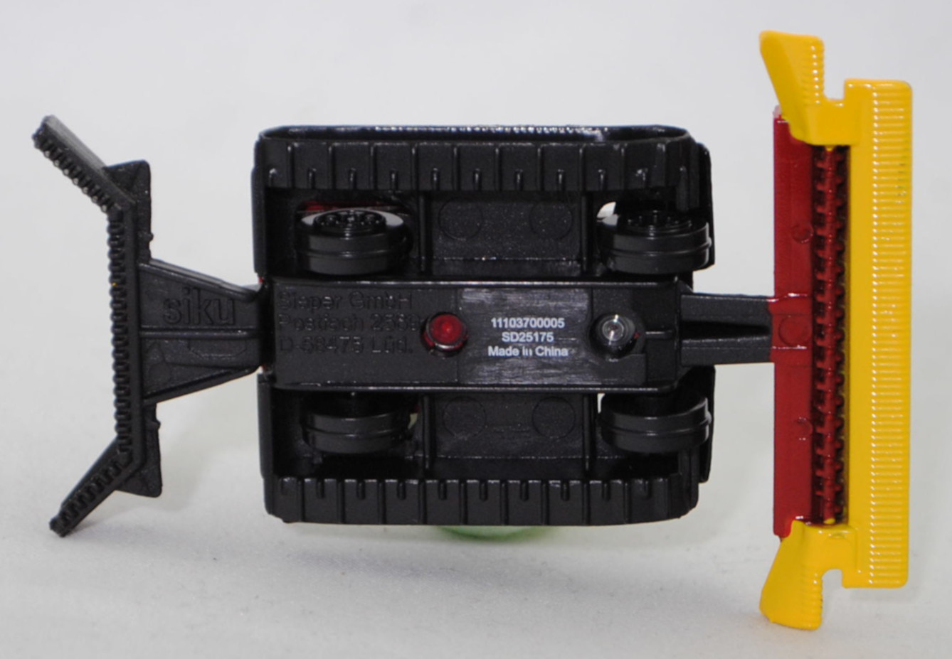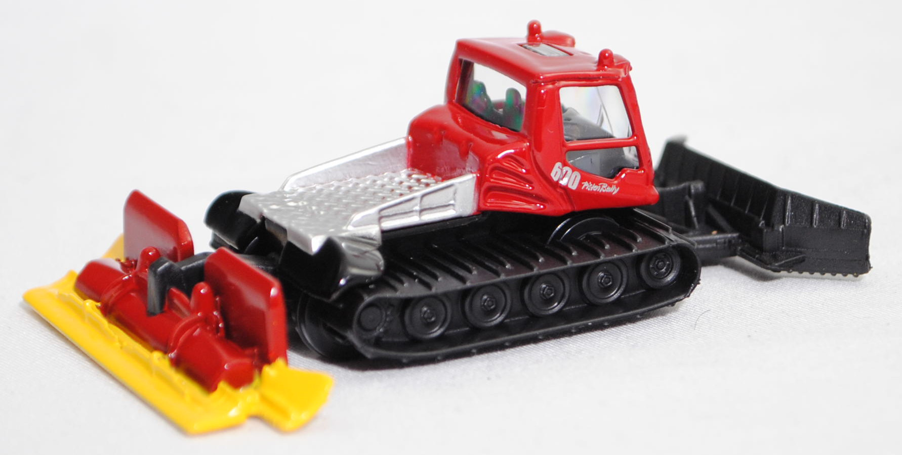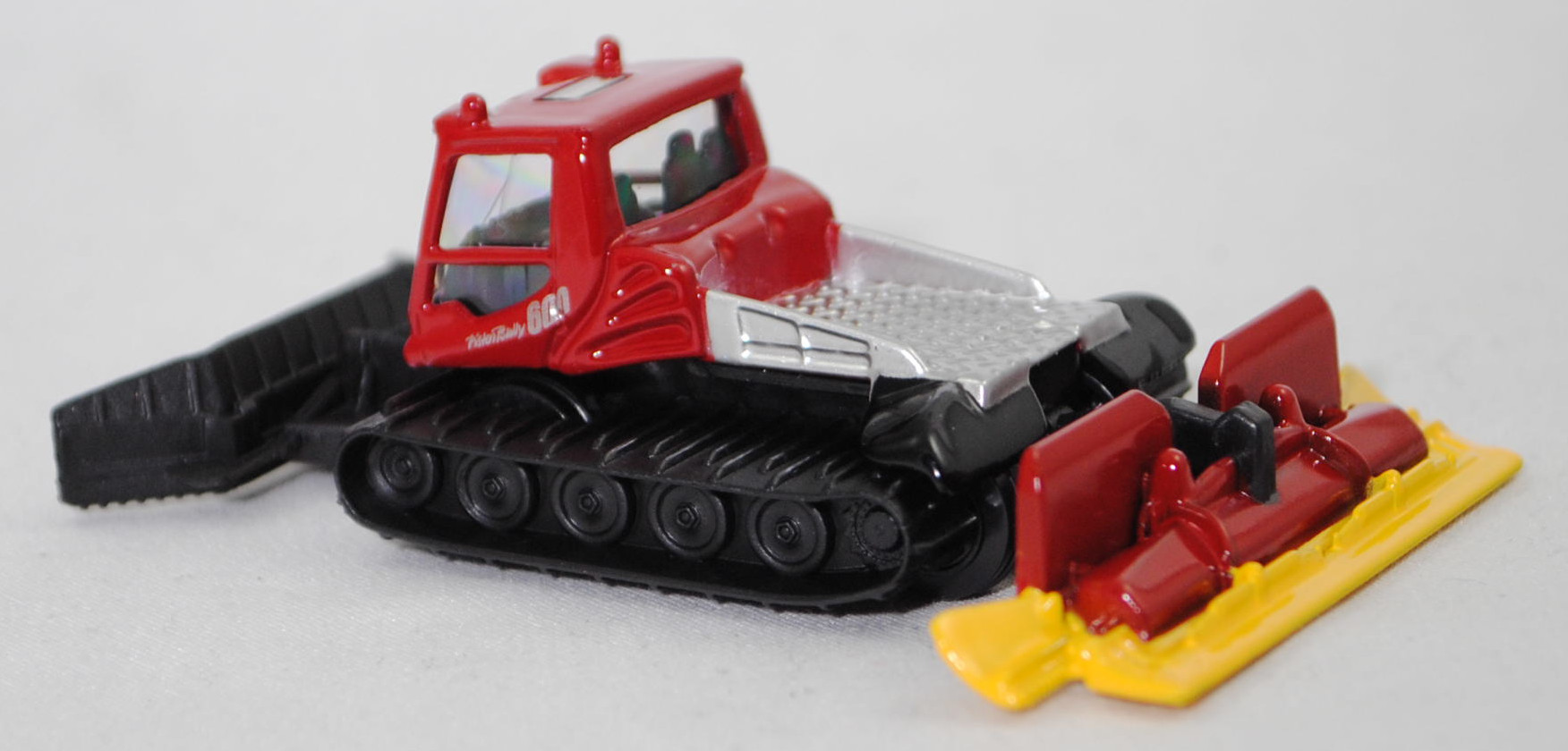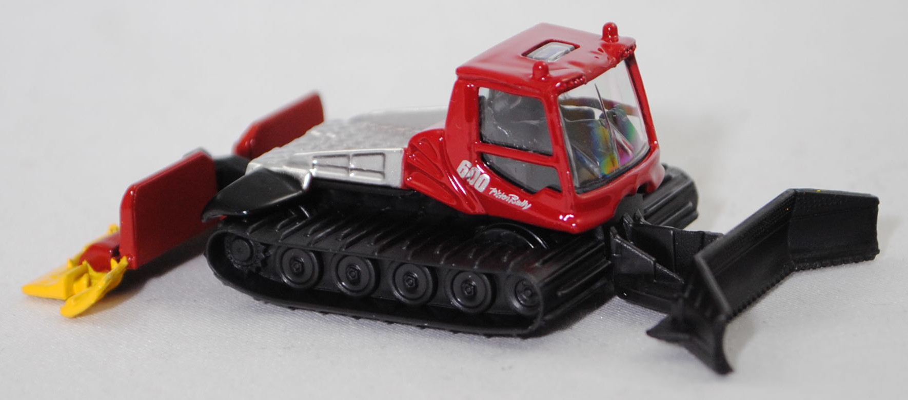 00001 Kässbohrer PistenBully 600 SCR, Fahrerhaus mit integrierten Warnleuchten auf dem Dach signalrot, innen schwarz, Sitze schwarz, Lenkrad schwarz, Druck PistenBully 600 in silber auf den Seiten des Fahrerhauses, Plattform mit integrierter Reling weißaluminiummetallic, Räumschild schwarz, Schneeglätter signalrot/verkehrsgelb lackiert, Chassis schwarz mit integriertem Raupenlaufwerk sowie integriertem Räumschild (vorne) und Schneeglätter (hinten), Bpr. Adresse mittig zwischen den Vorderrädern und siku links unter dem Arm des Räumschildes, ohne Prägung 1037, Druck Chargennummer mittig vor der Hinterachse, Druck Made in China unter der Chargennummer, Räder schwarz, SIKU SUPER, ca. 1:114, P29f (EAN 4006874010370)